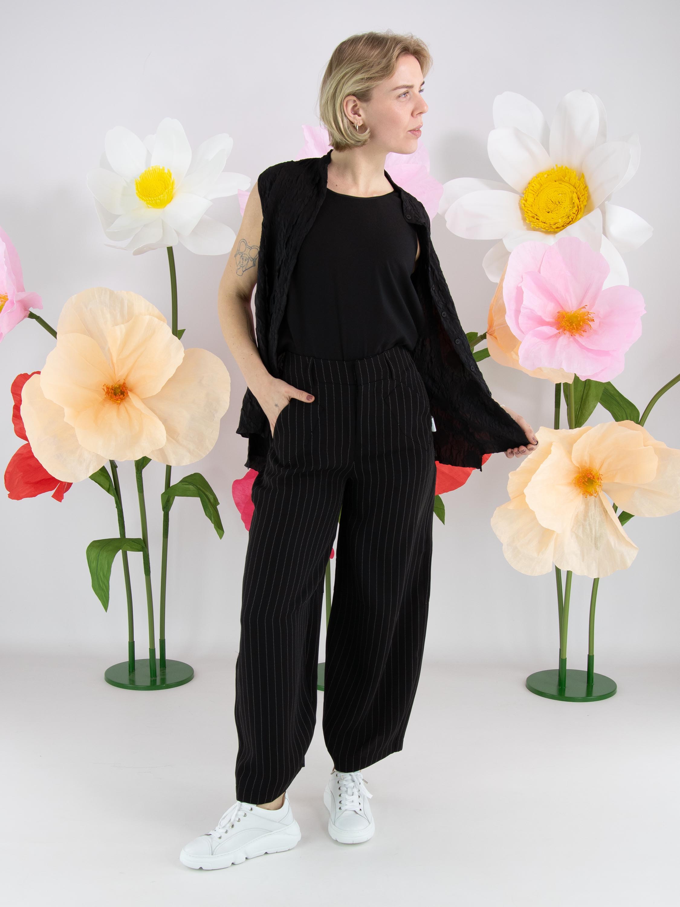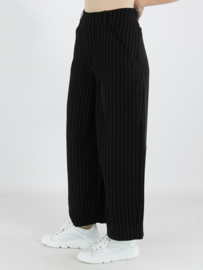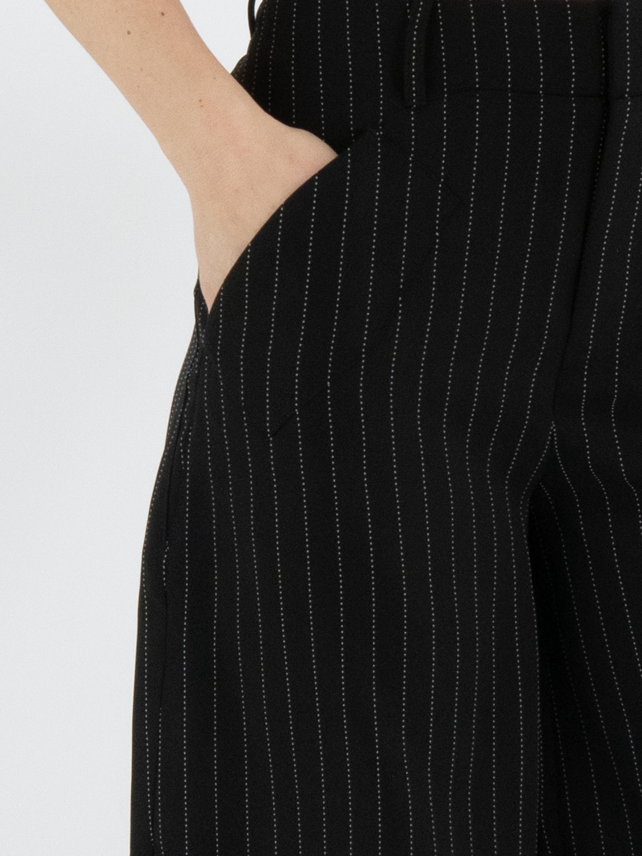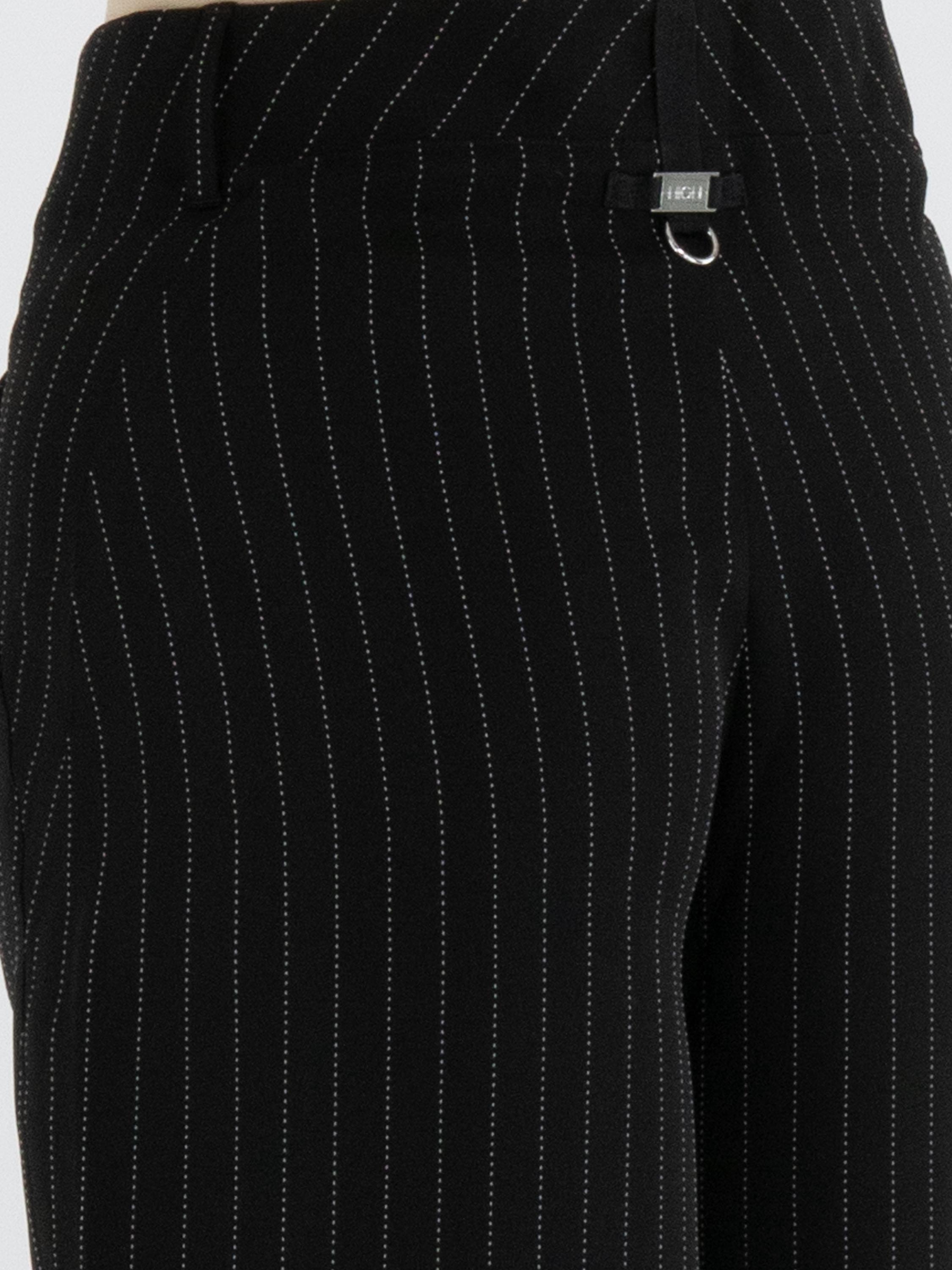 Chalk-stripe trousers from High Tech in black with white stitching. At the knee there is a horizontal seam. The trousers have slit pockets with diagonally cut edges. These trousers can be hand-washed.