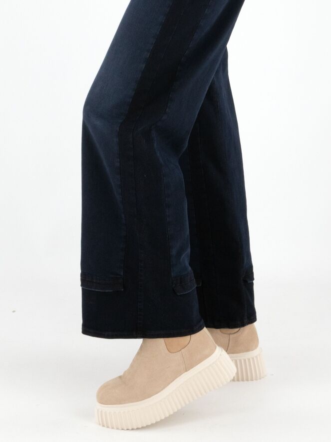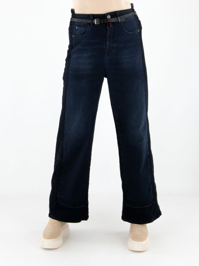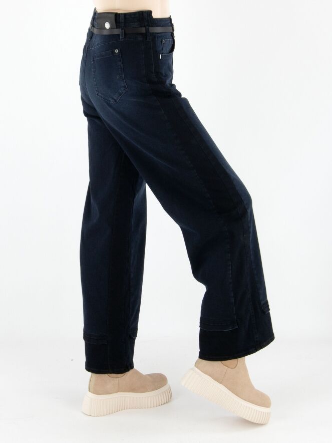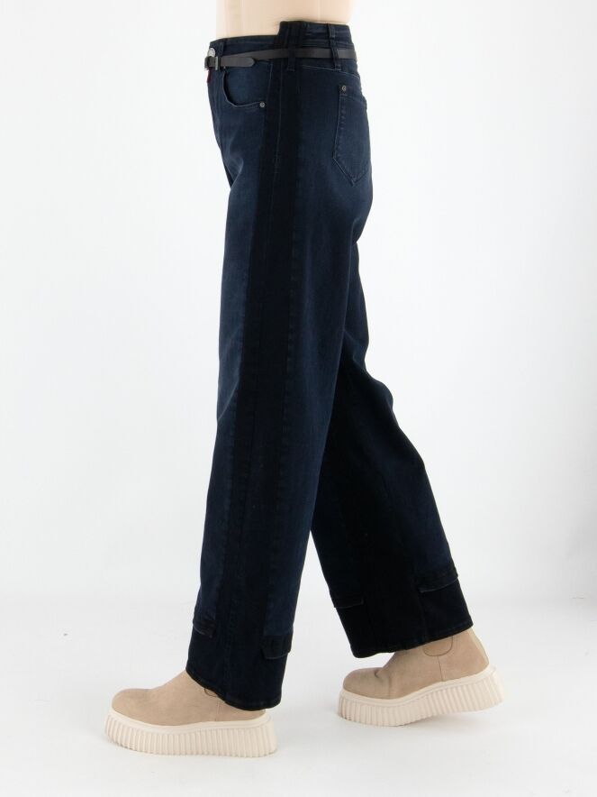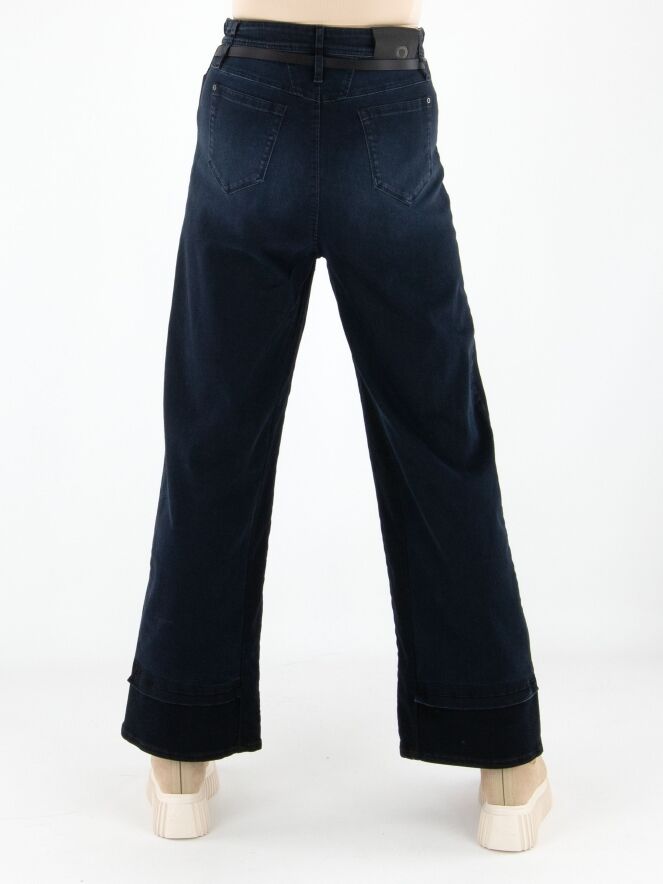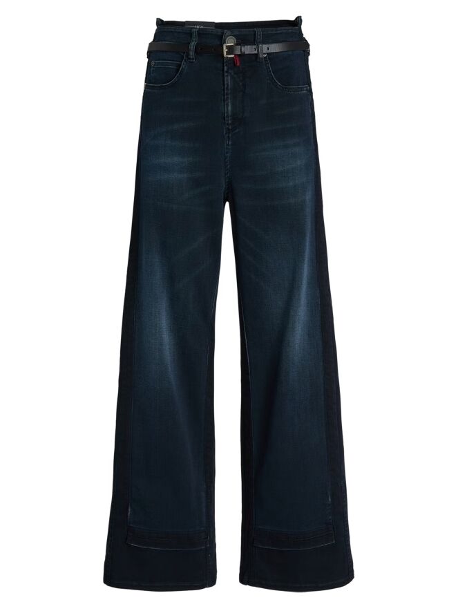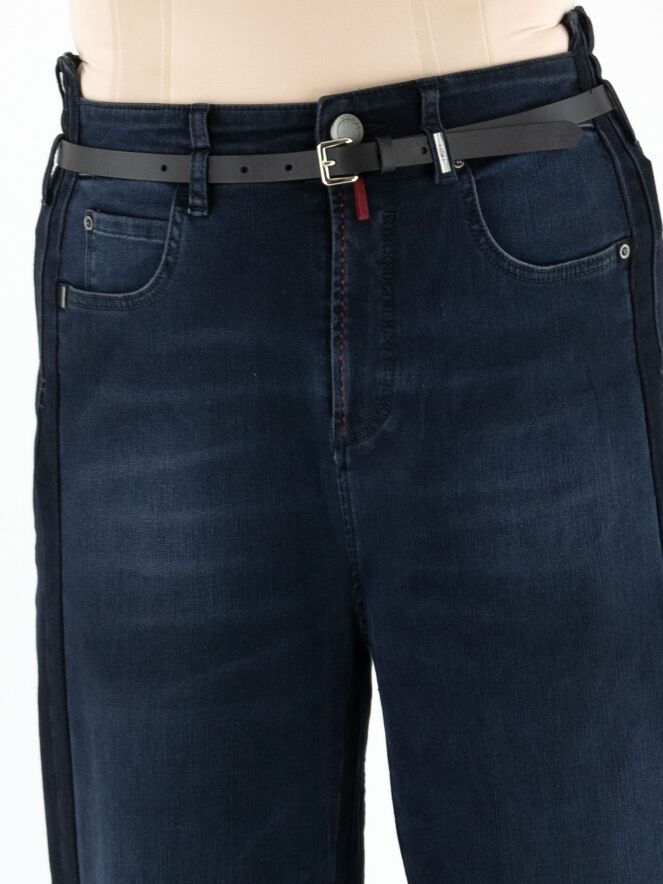 A high-waisted wide-leg jeans from High in dark denim. At the waist, the jeans come with a slim black leather belt. The design follows a classic 5-pocket style. Along the inner and outer seams of the legs, the denim is darker than at the center front, creating a modern shadow effect. These jeans can be washed at 30 degrees.