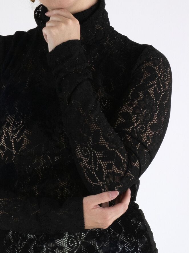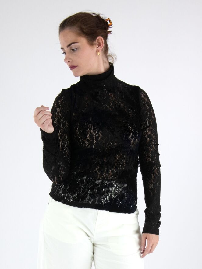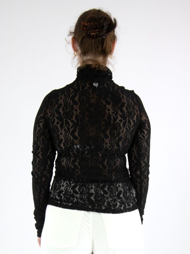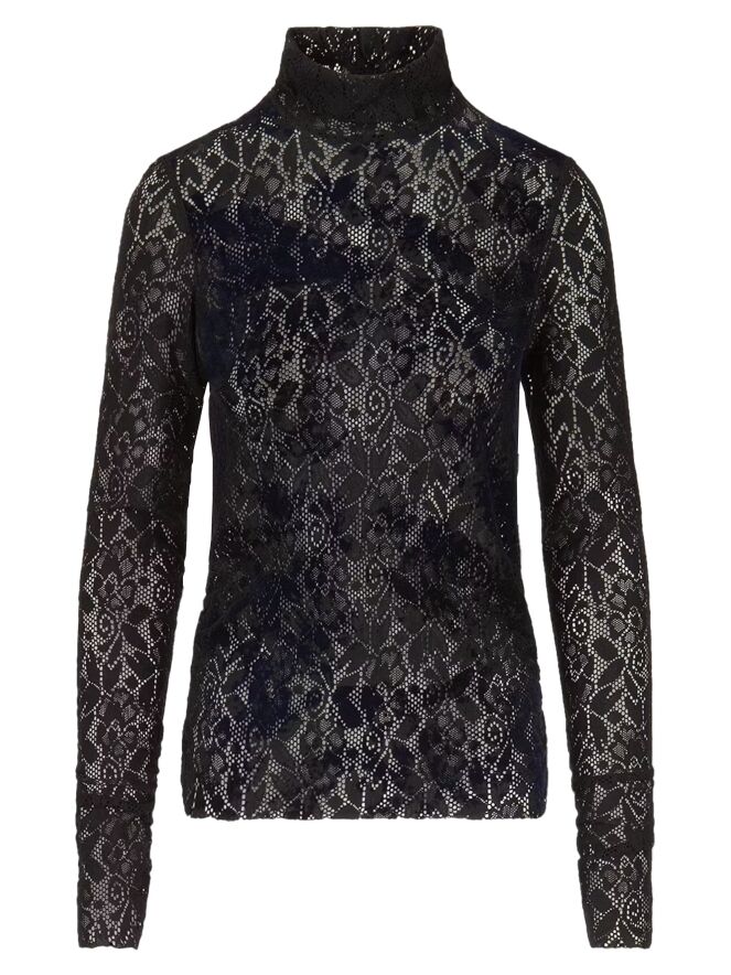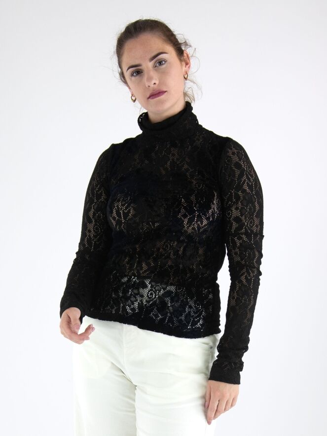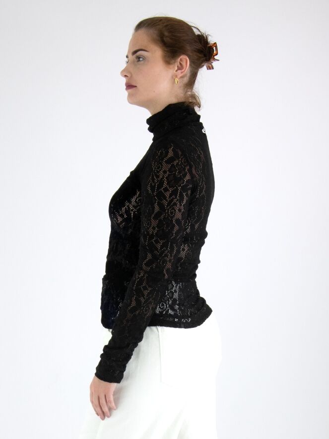 A perforated shirt from High in black. The front features sections in soft velour. At waist level, the fabric is finely pleated along the seams. The shirt has a cowl neck and can be hand washed.