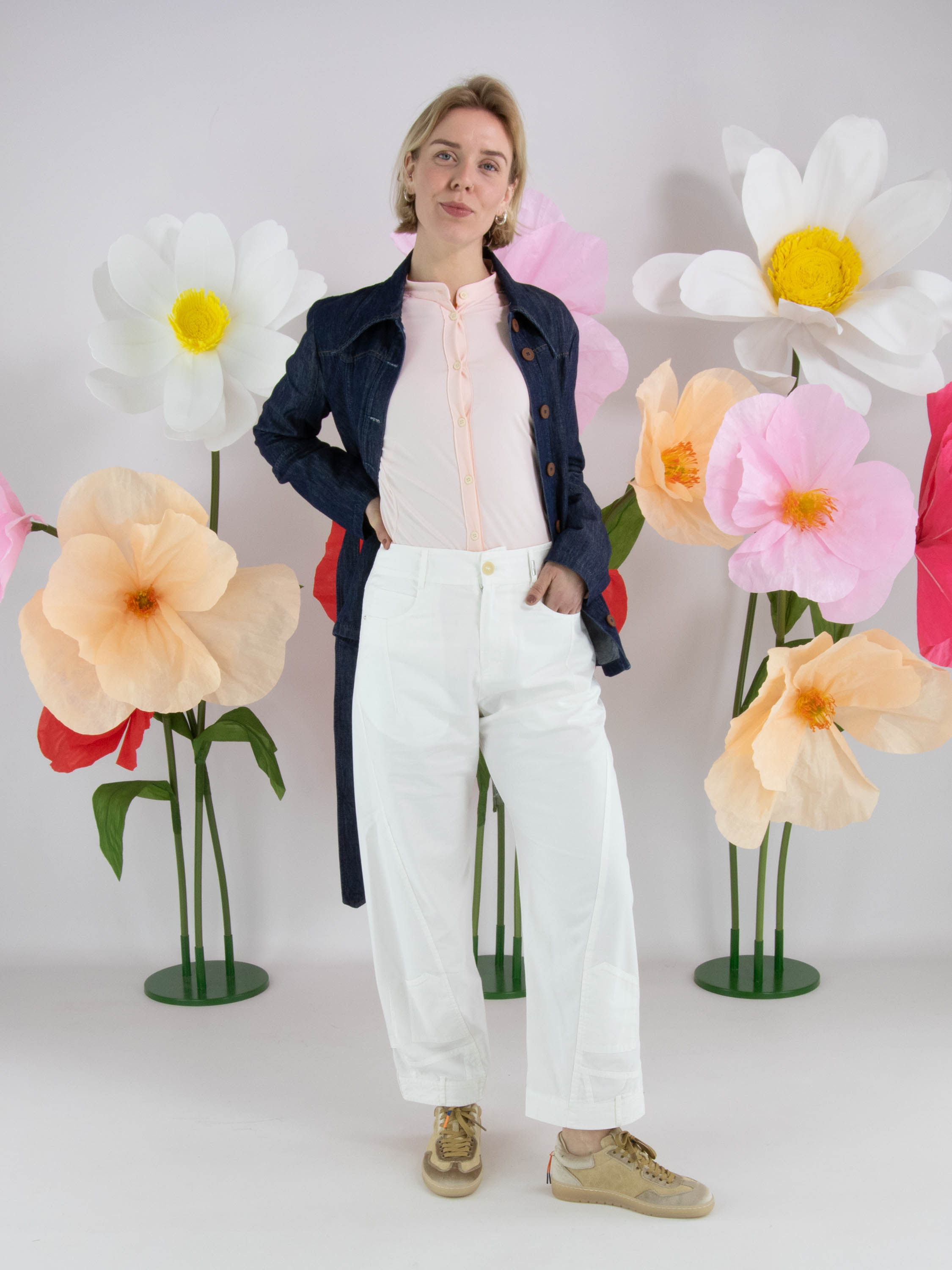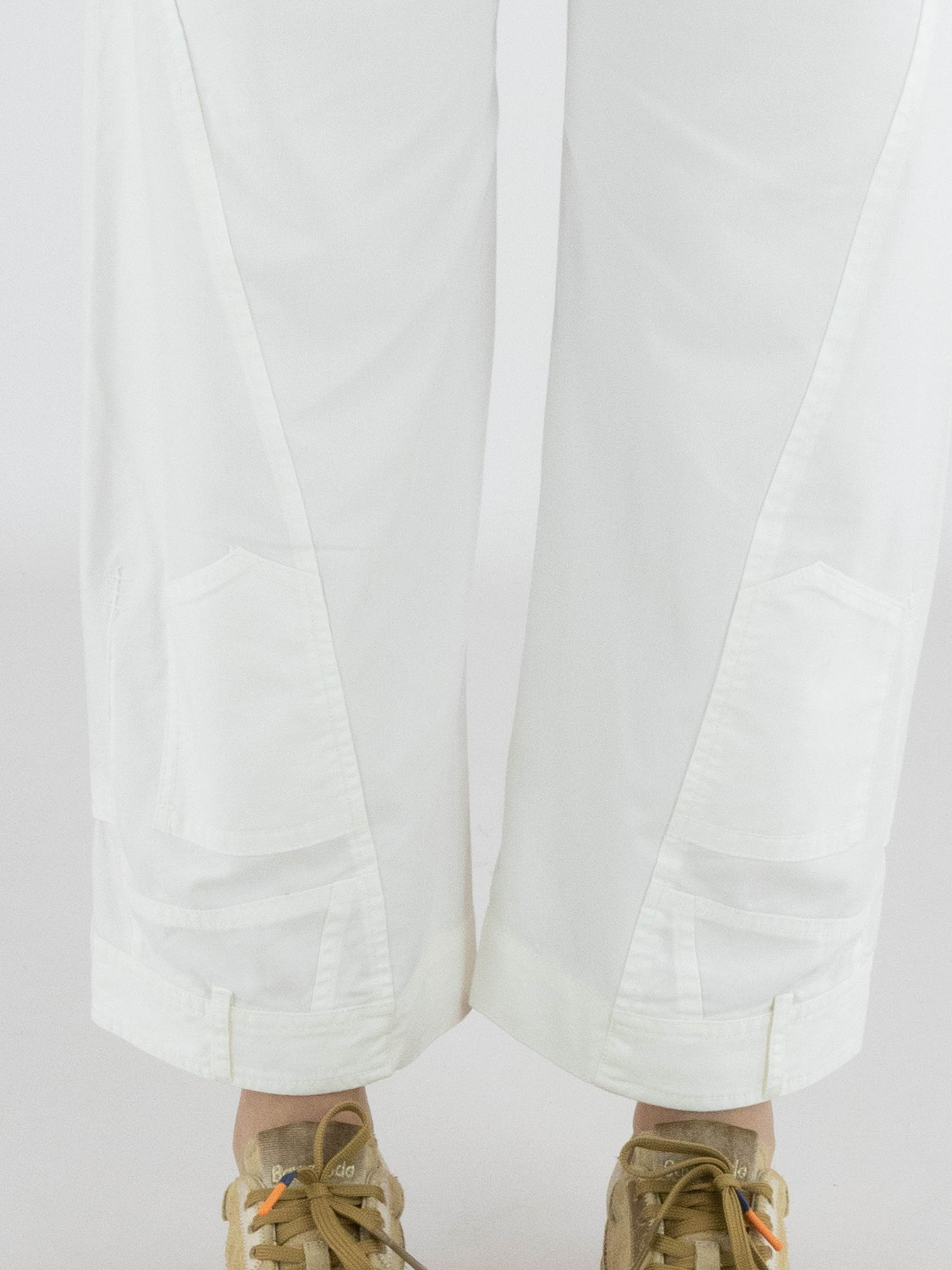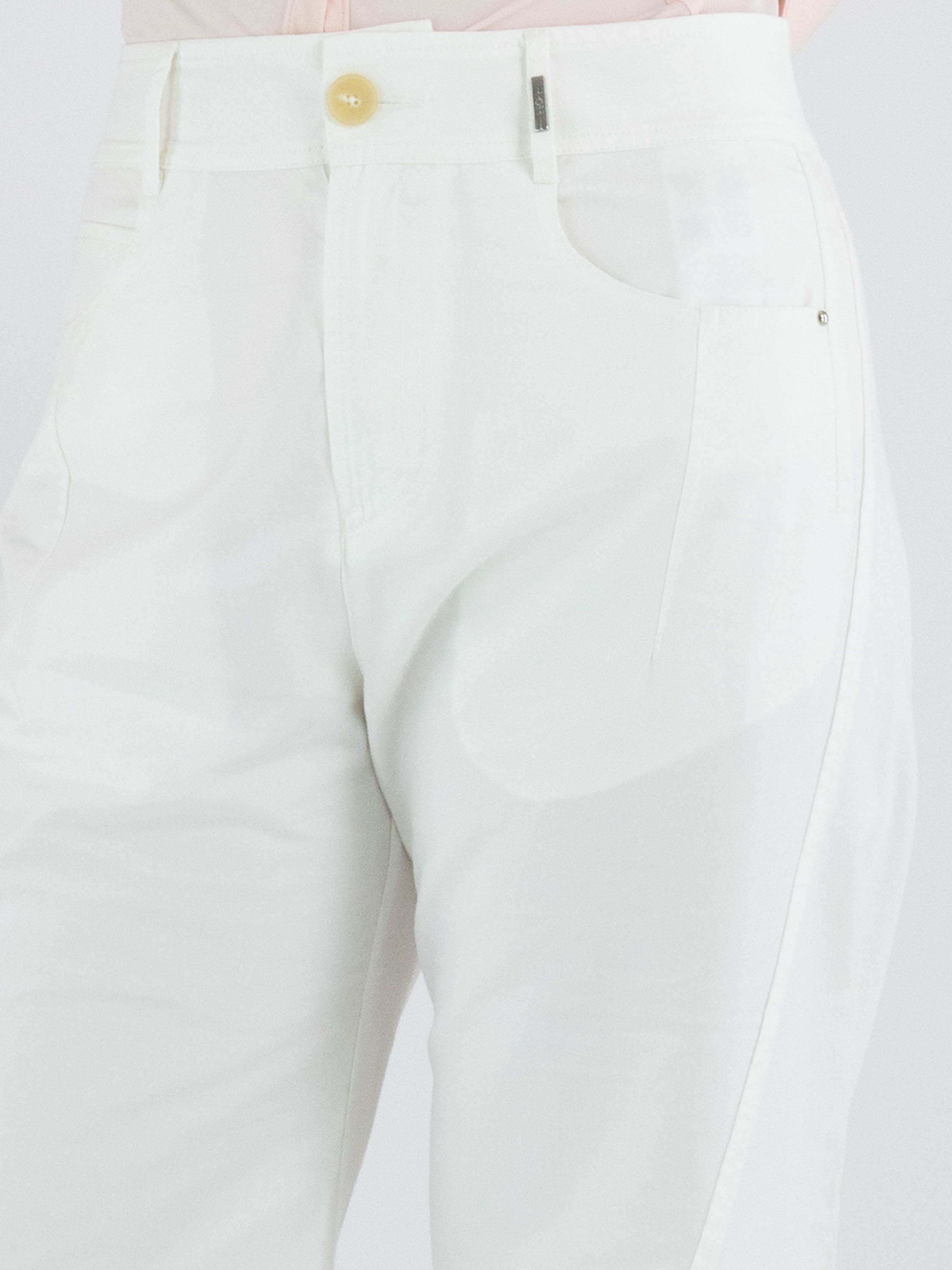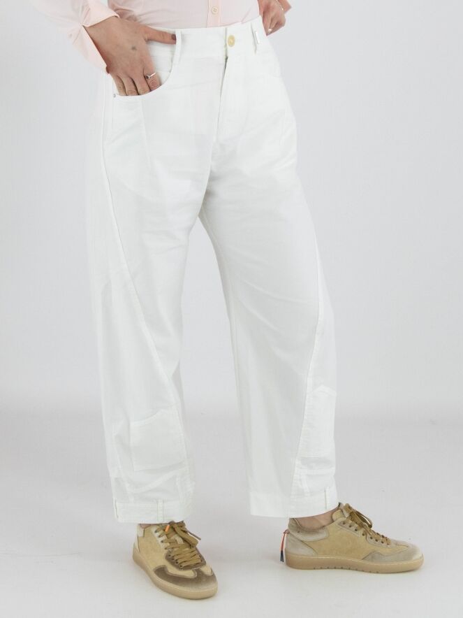 Trousers from High in a summer cotton fabric in off-white. The trousers are designed in a 5-pocket style. At the bottom of the legs, one leg features a reversed decorative pocket with waistband, while the other leg has a reversed slit pocket with waistband. These design jeans can be washed at 30 degrees.