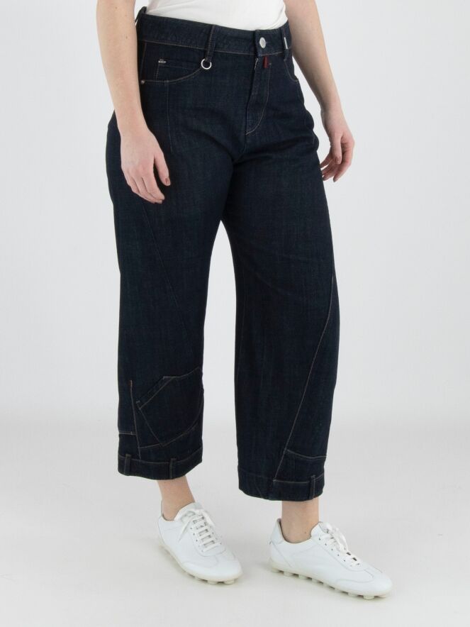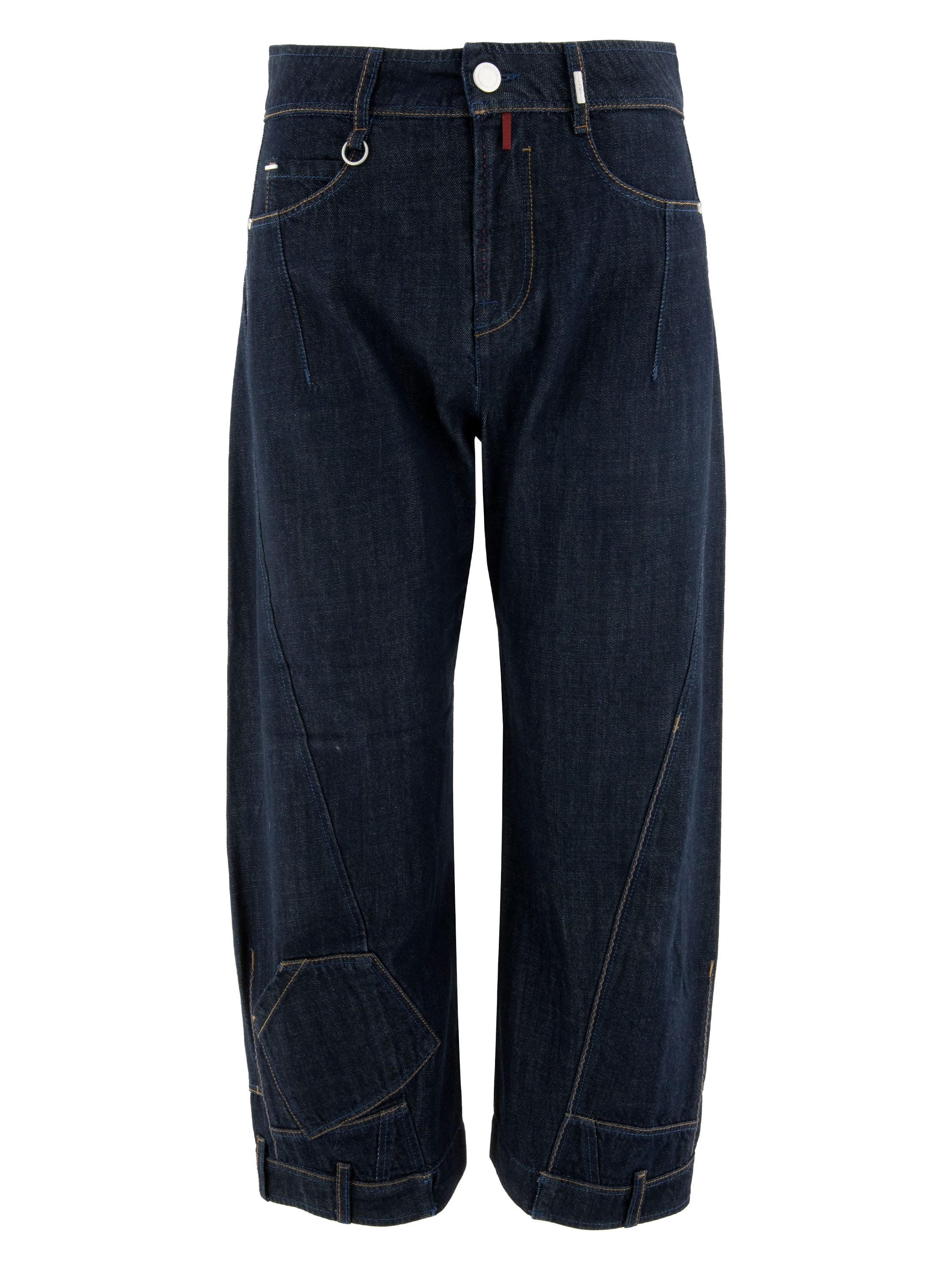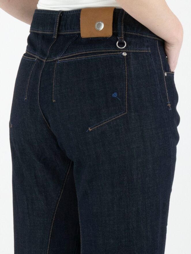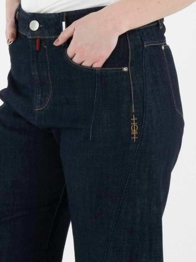 A pair of jeans from High in a dark denim colour. The jeans are designed in a 5-pocket style. At the bottom of the legs, one leg features an inverted decorative pocket with waistband detail, while the other leg has an inverted slit pocket with waistband detail. These design jeans can be washed at 30 degrees.