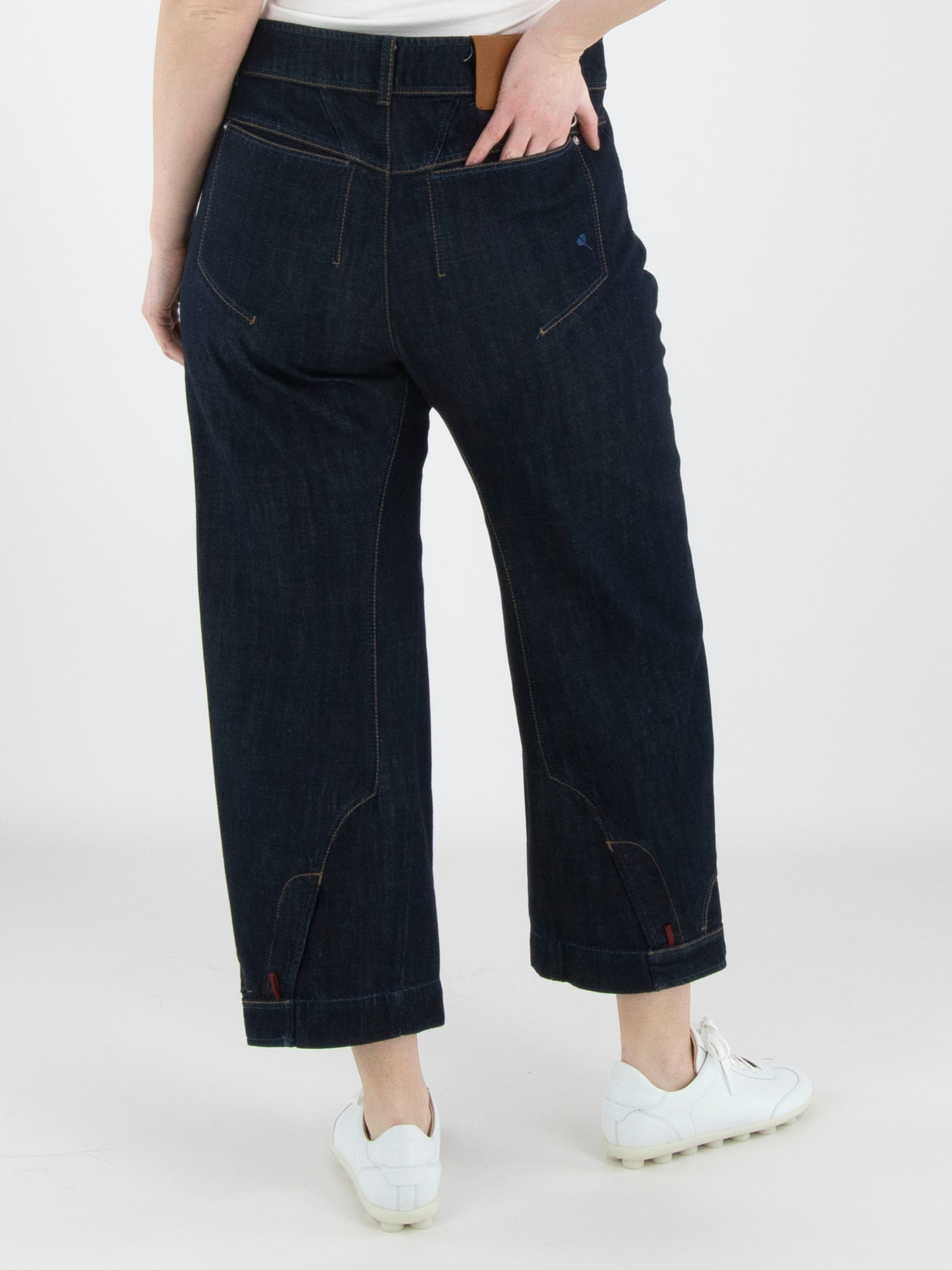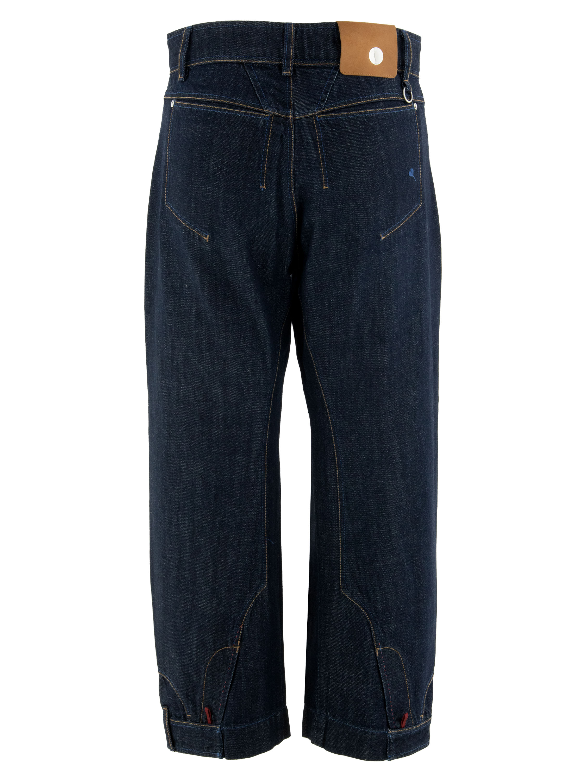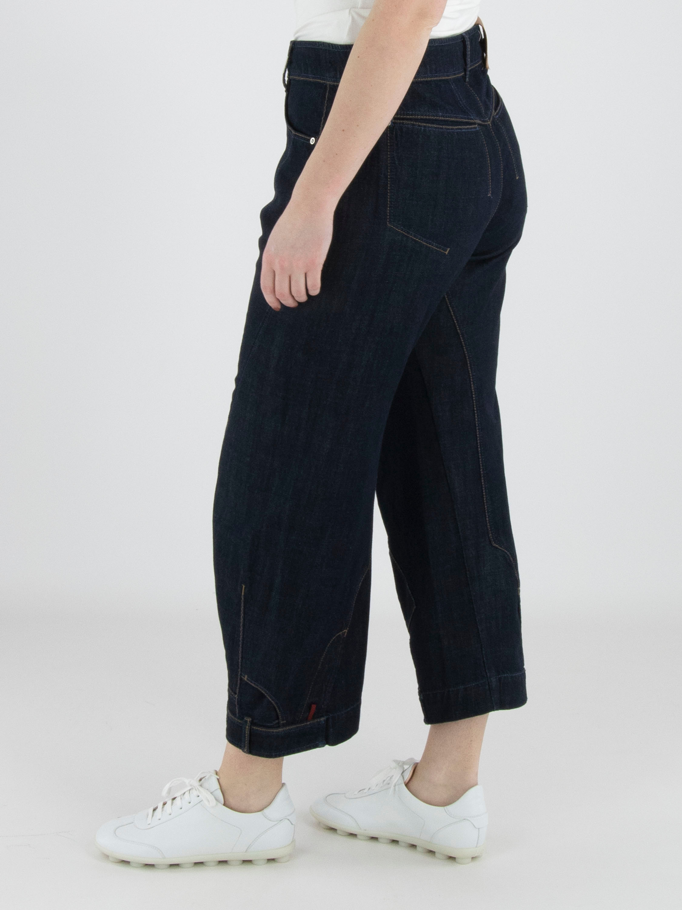 A pair of jeans from High in a dark denim colour. The jeans are designed in a 5-pocket style. At the bottom of the legs, one leg features an inverted decorative pocket with waistband detail, while the other leg has an inverted slit pocket with waistband detail. These design jeans can be washed at 30 degrees.