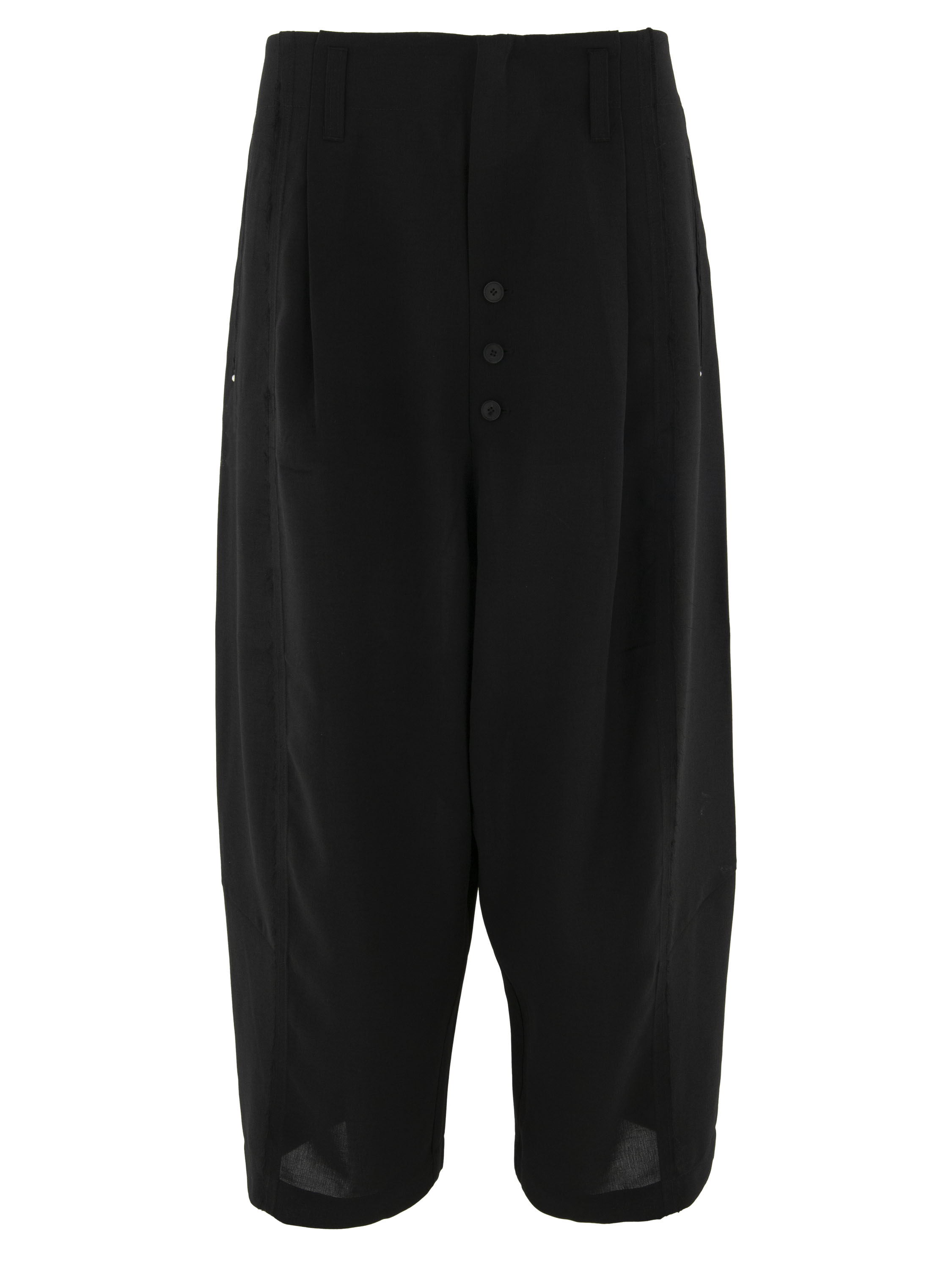 Wide-leg trousers by High in black. The trousers feature a concealed zip fastening with button closures underneath. The double seam running down the centre of the legs is finely frayed along the edges. Two pleats extend from the waistband. The trousers have side pockets and can be hand-washed.