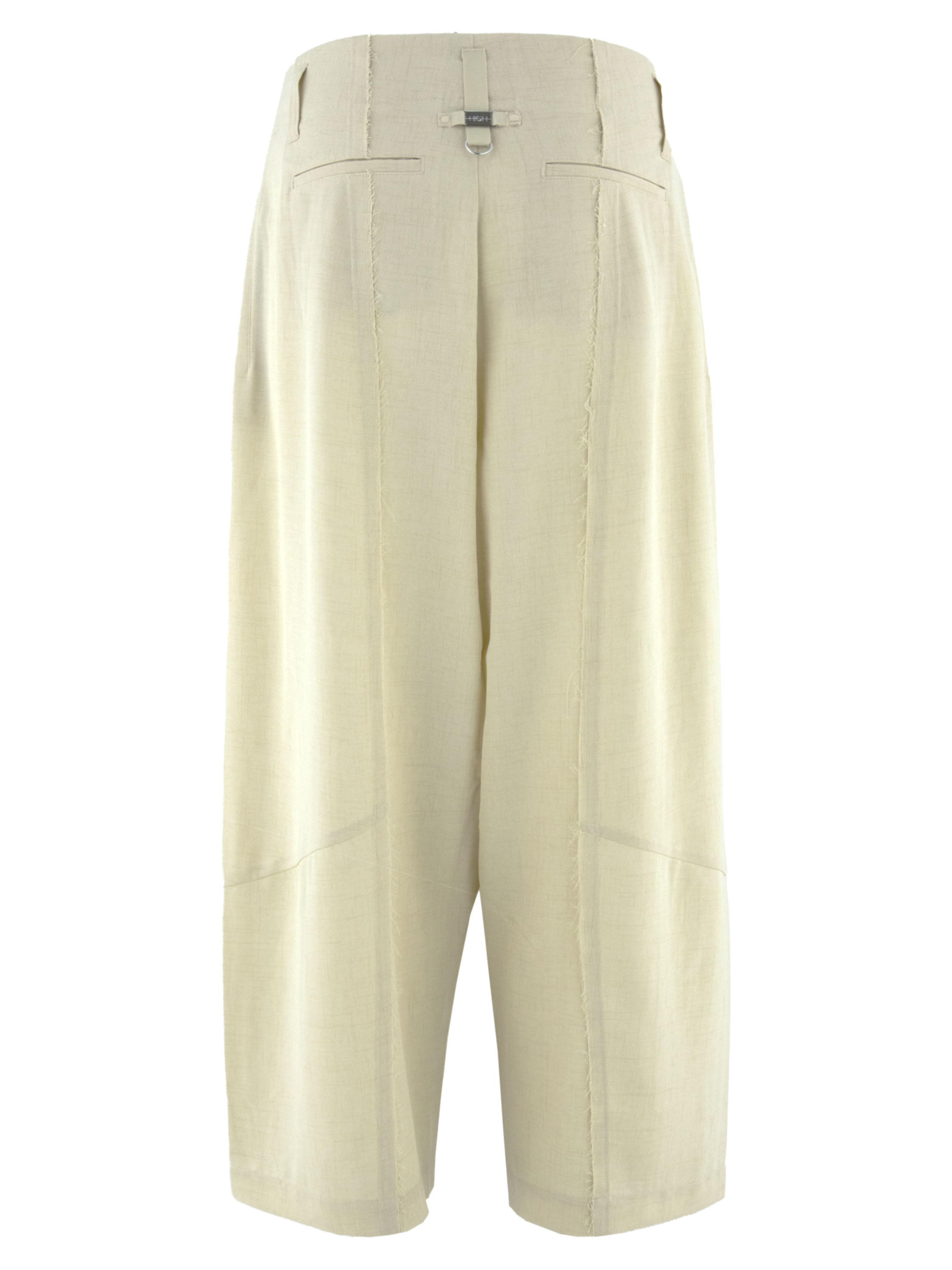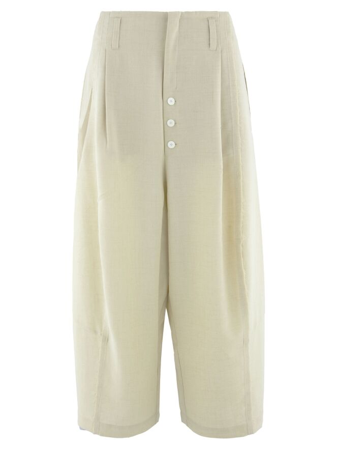 Wide-leg trousers by High in a sand colour. The trousers feature a concealed zip fastening with button closures underneath. The double seam running down the centre of the legs is finely frayed along the edges. Two pleats originate from the waistband. The trousers have side pockets and can be hand-washed.