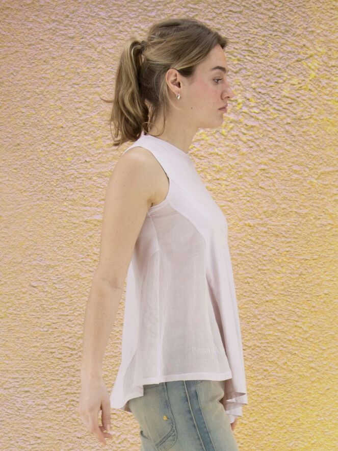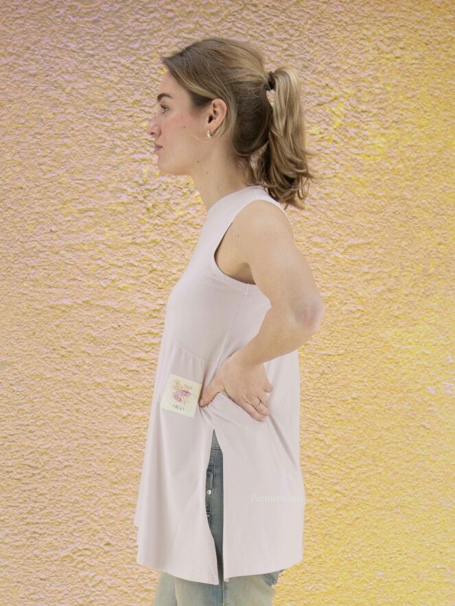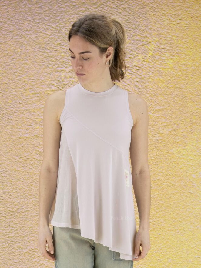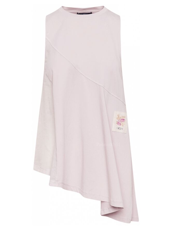 A top from High in a lilac color. The left side is slightly transparent. On the right is a deep split. The bottom of the top is cut diagonally. This top has an A - Line and can be washed by hand.