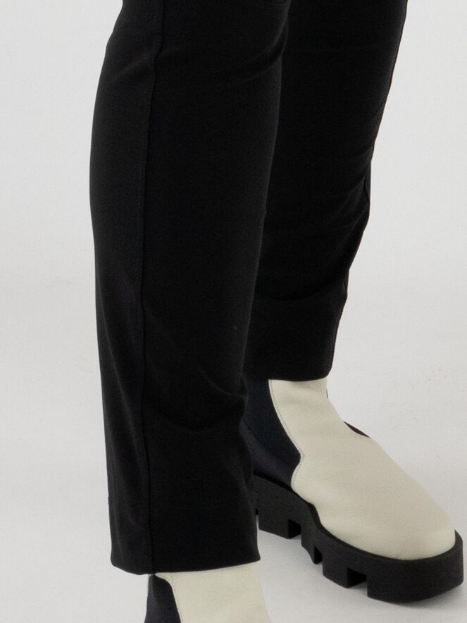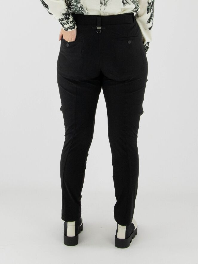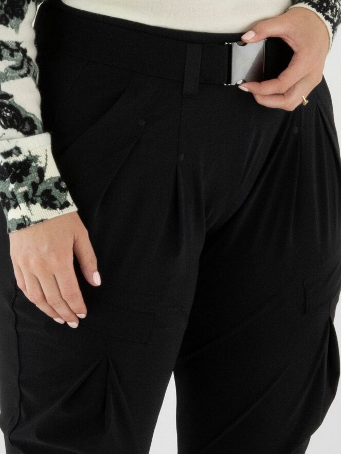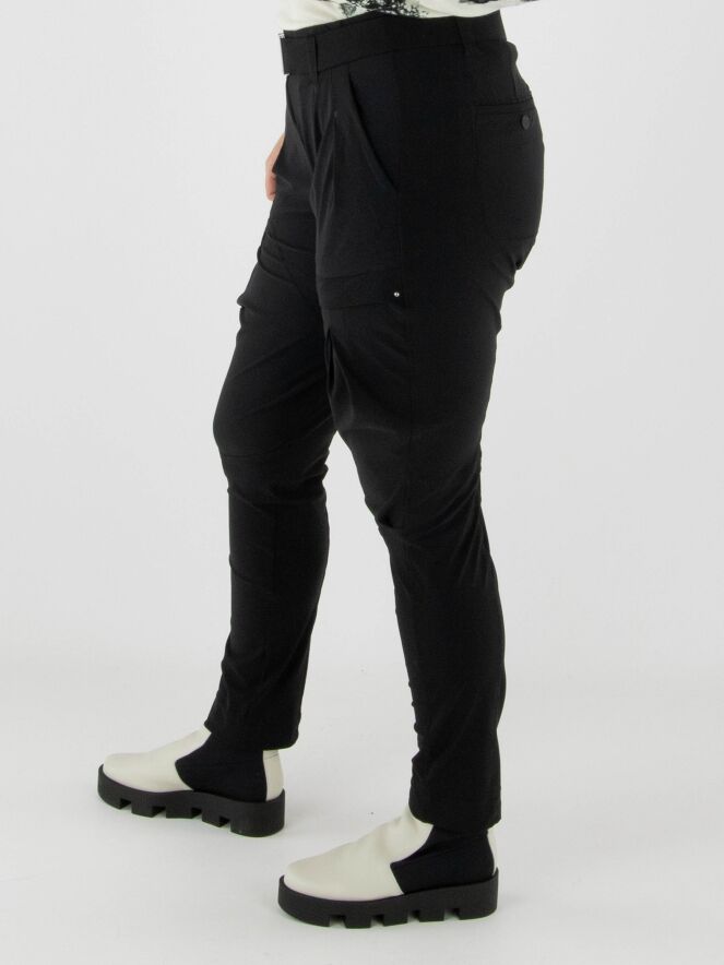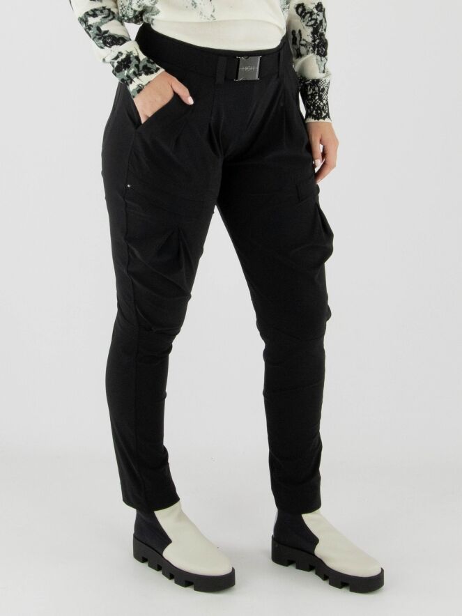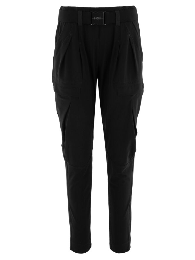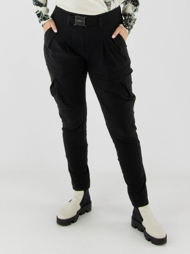 Trousers by High in black. The waistband features a black elastic belt with a rectangular silver buckle, with a few pleats underneath. A pleat runs along the outer thigh. The trousers have side pockets and should be hand-washed.