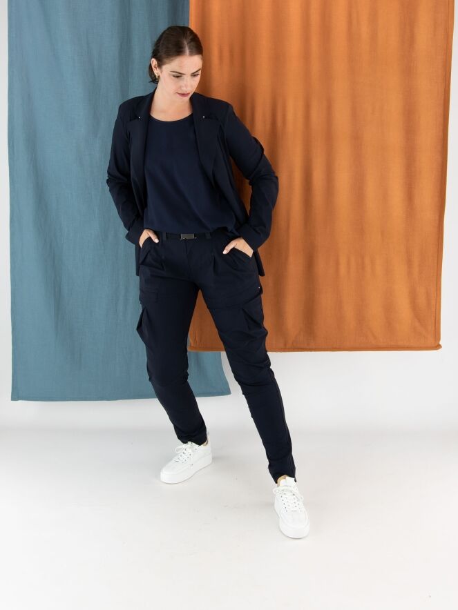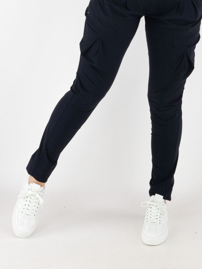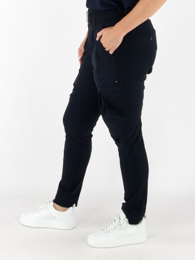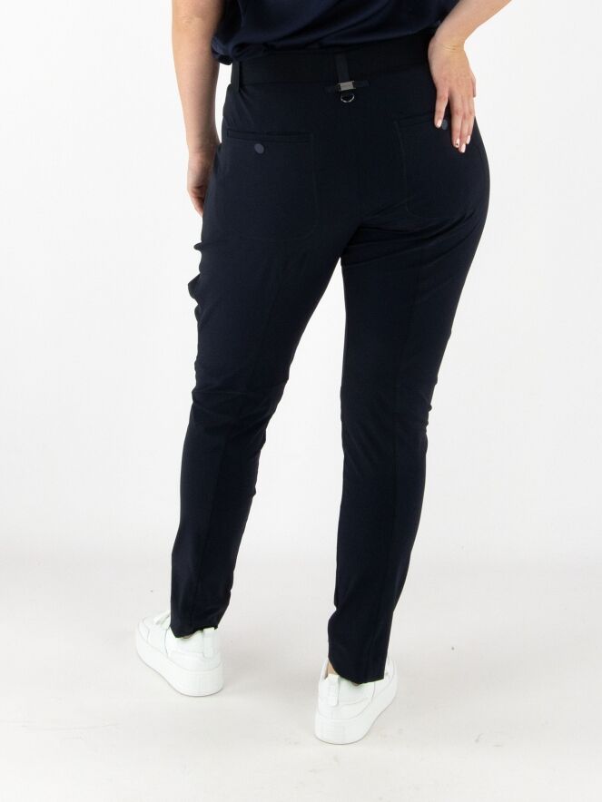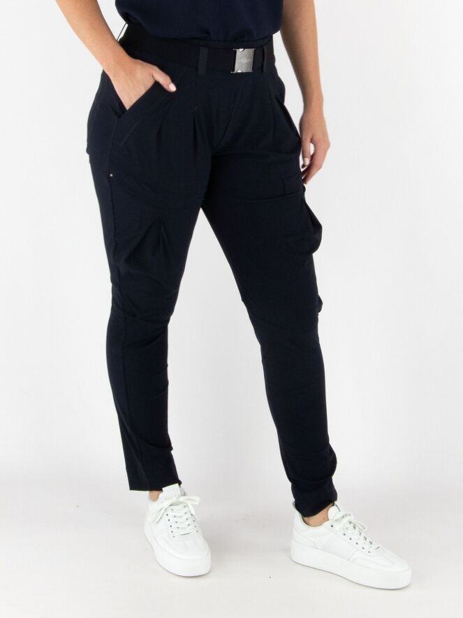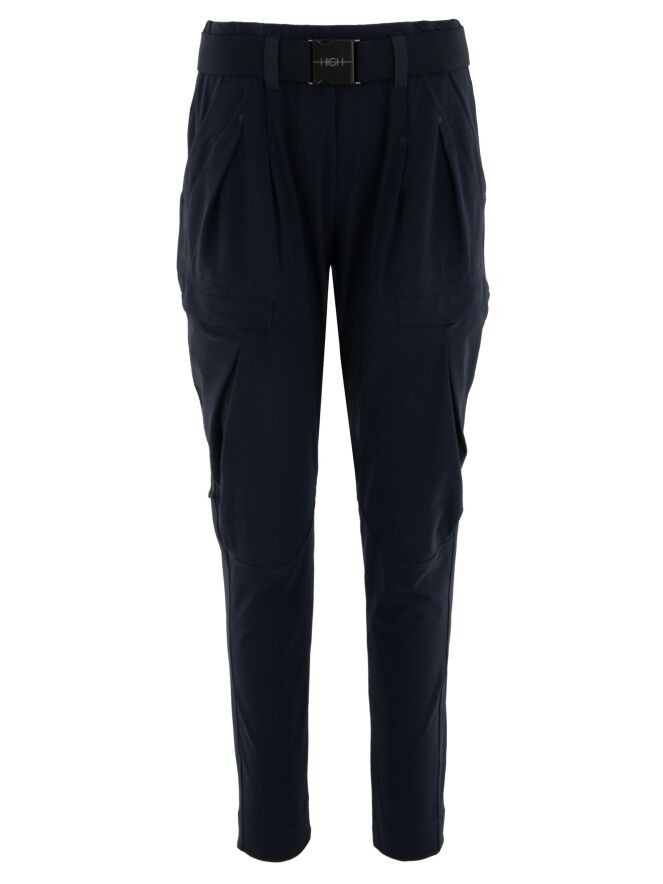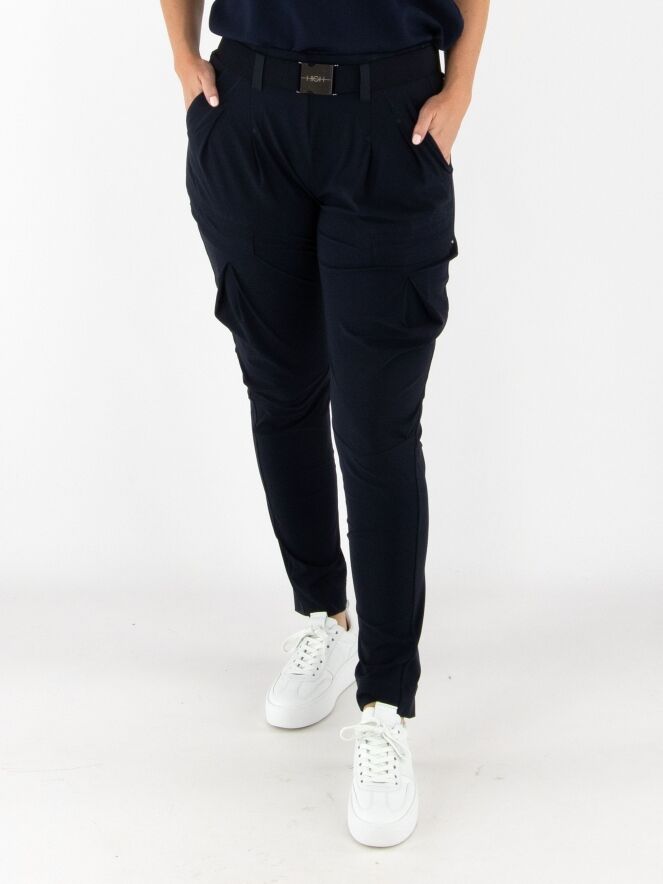 Trousers by High in navy blue. The waistband features a black elastic belt with a rectangular silver-colored buckle. Below the waistband are a few pleats. A pleat runs down the outside of the upper leg. The trousers have side pockets and should be hand-washed.