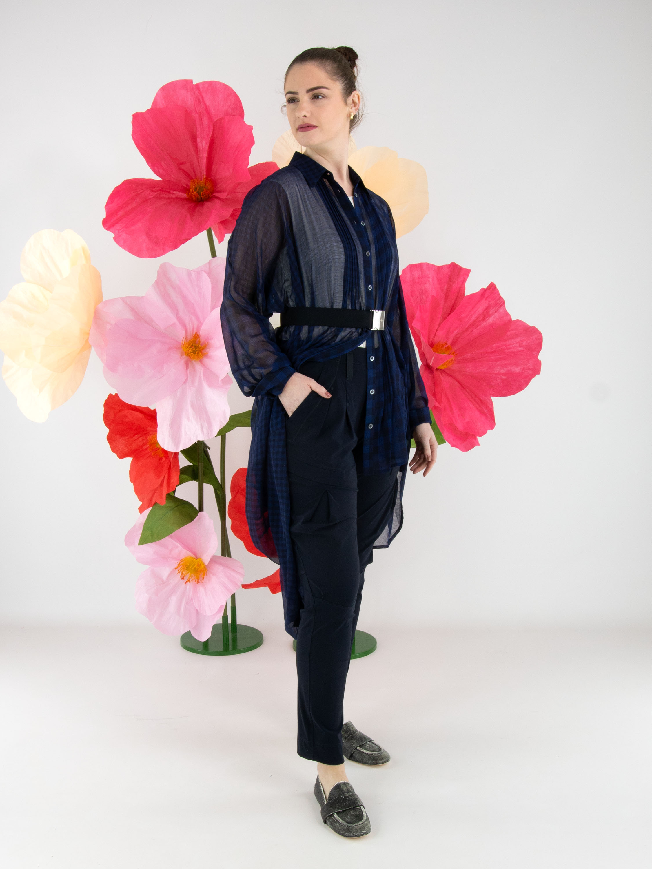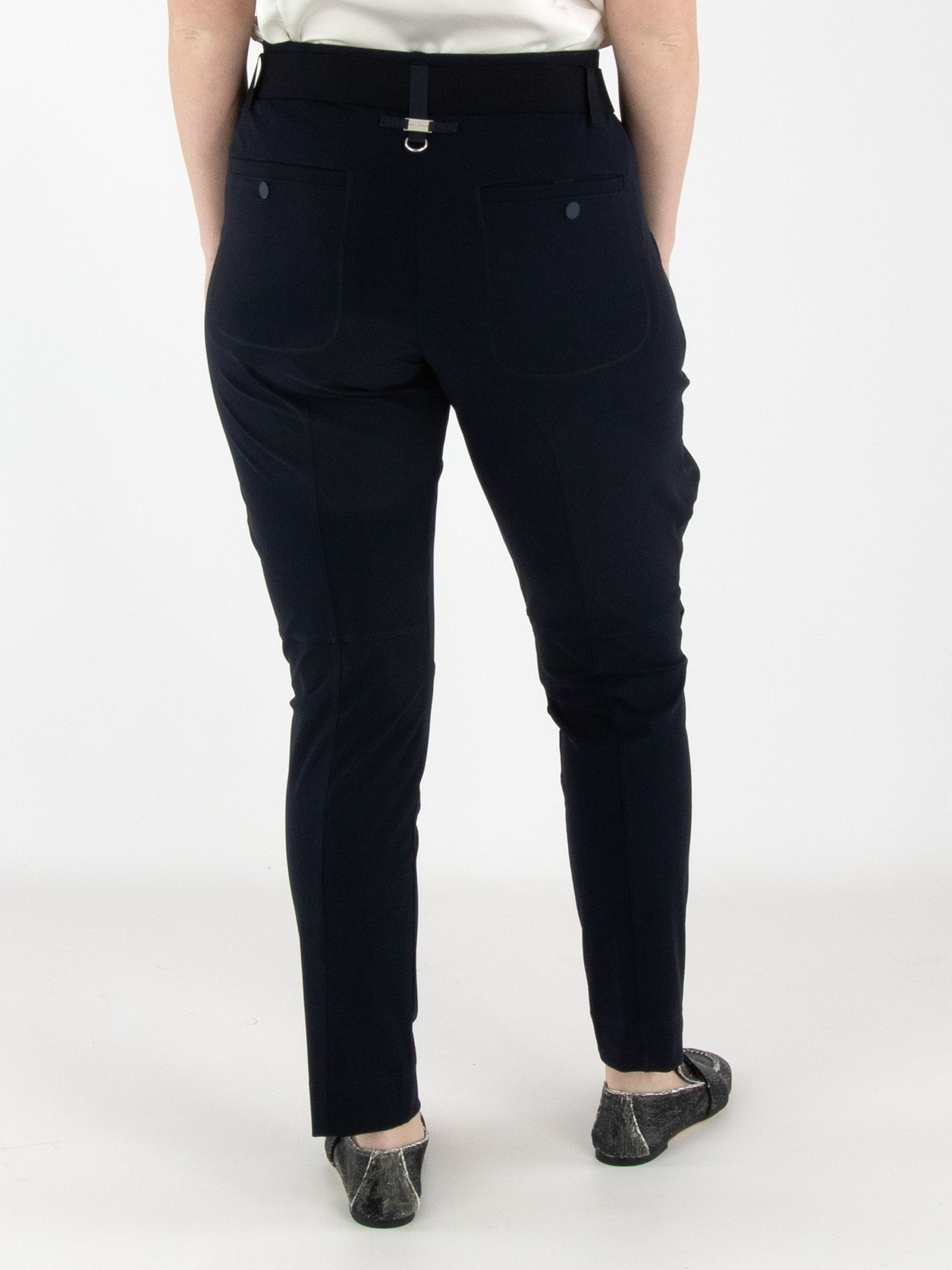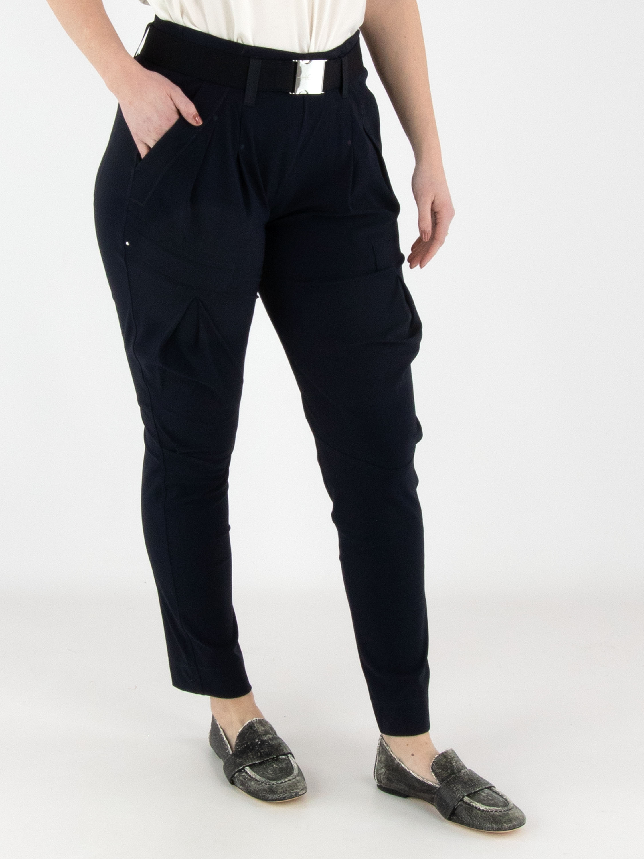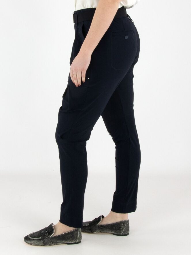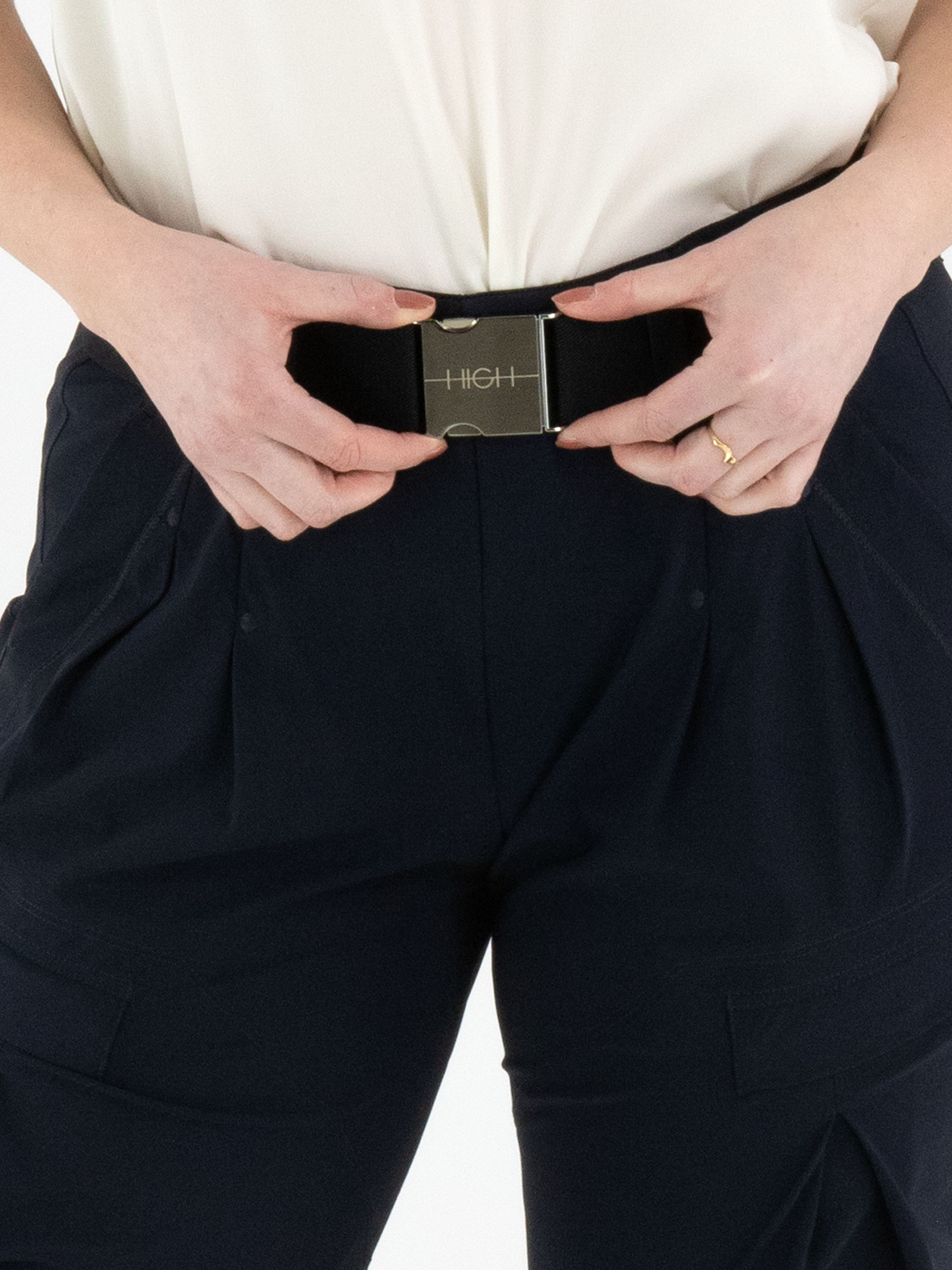 Trousers by High in navy blue. The waistband features an elasticated belt with a rectangular silver-coloured buckle, with several pleats beneath it. A pleat runs along the outer side of the upper leg. The trousers have side pockets and can be hand-washed.