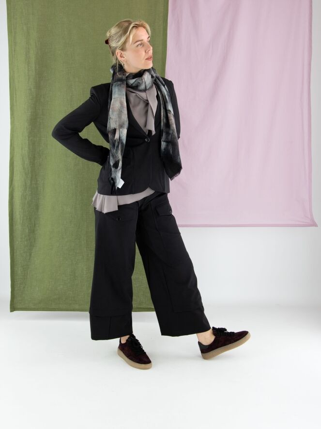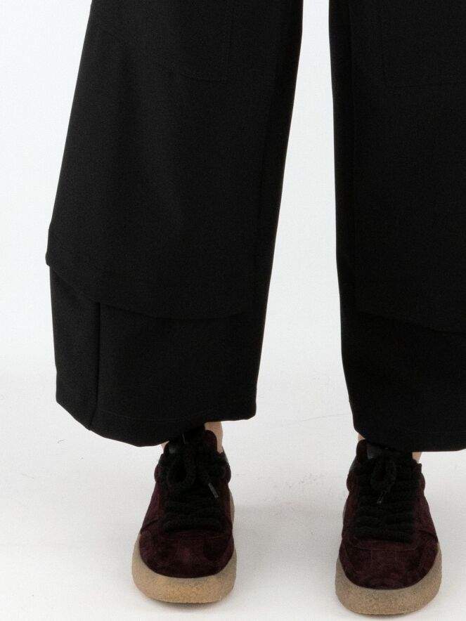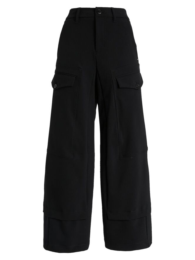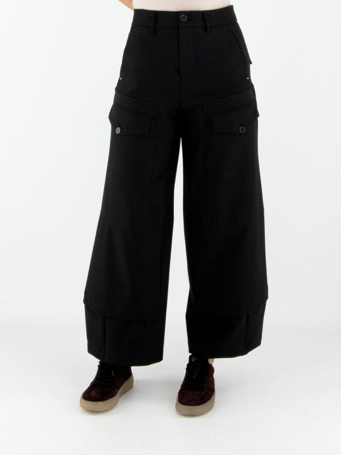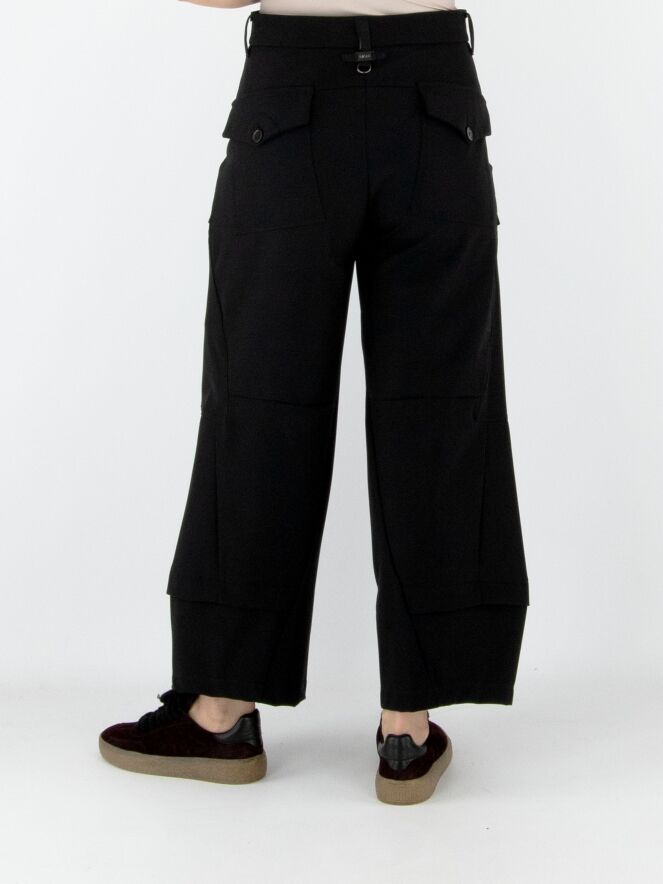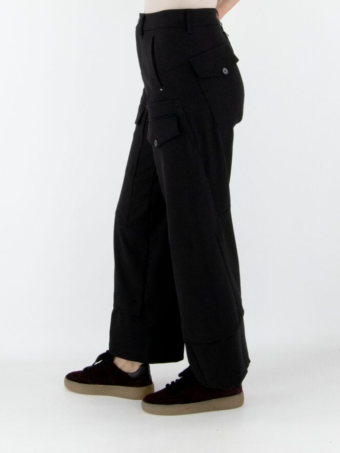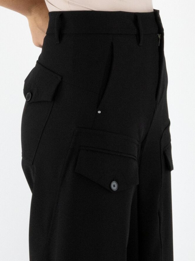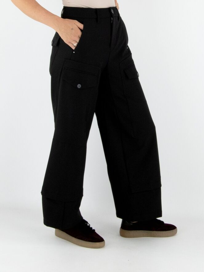 Trousers by High in black. Two flap pockets with button closures are positioned on the upper thighs. Slanted side pockets are placed below the waistband. A crossover trim at the hem creates the effect of a second fabric peeking out from under the leg. These trousers can be washed at 30 degrees.