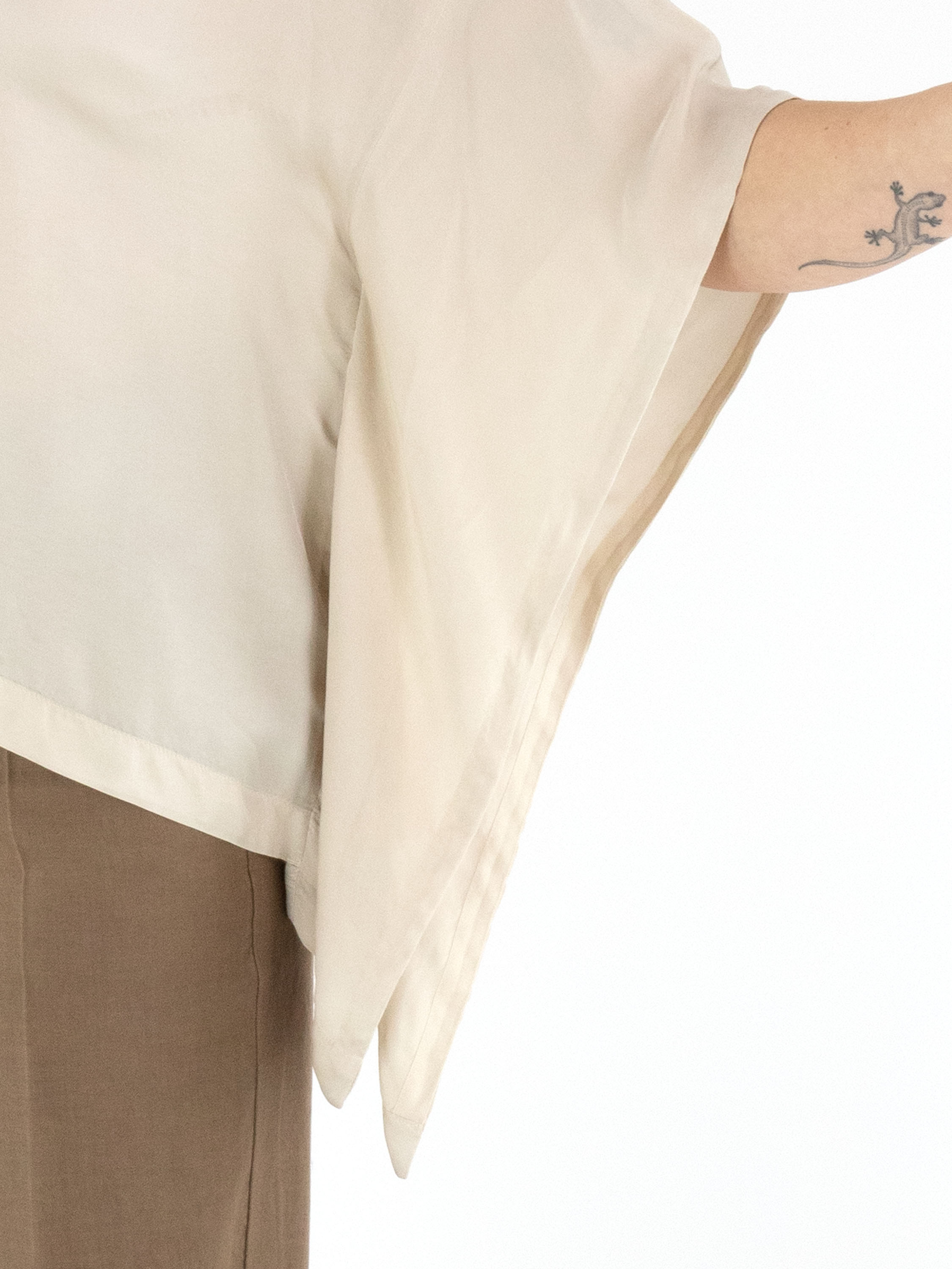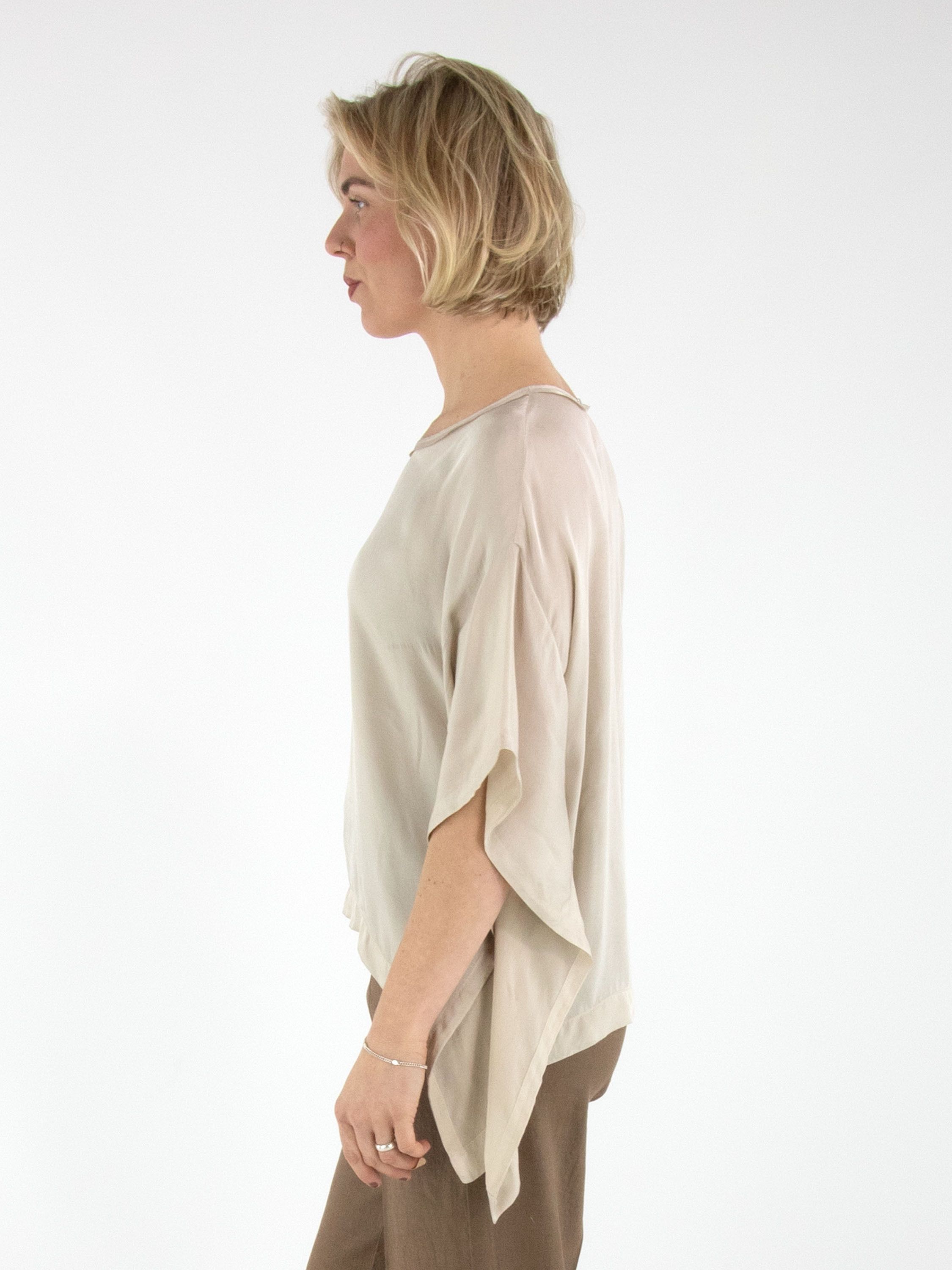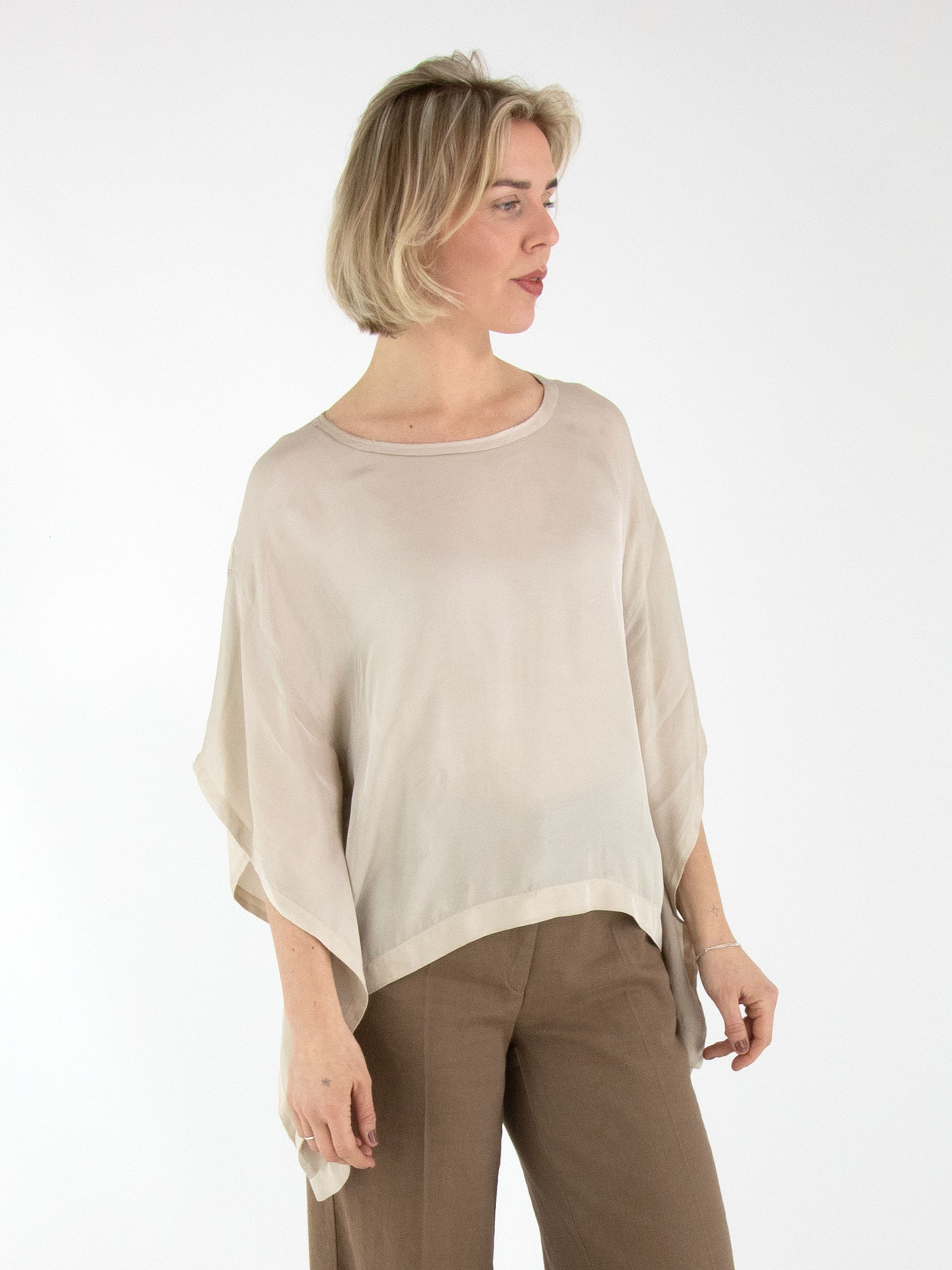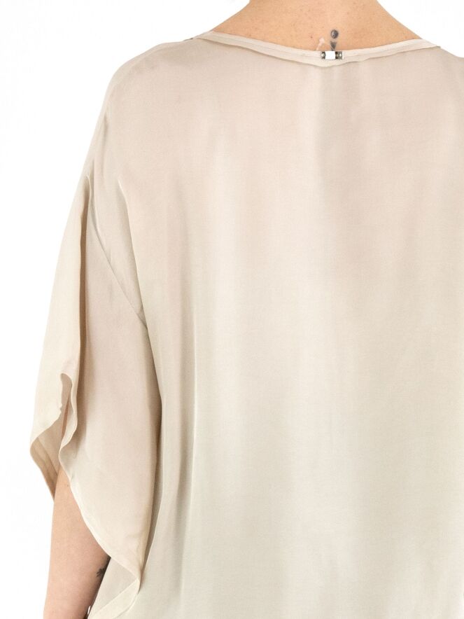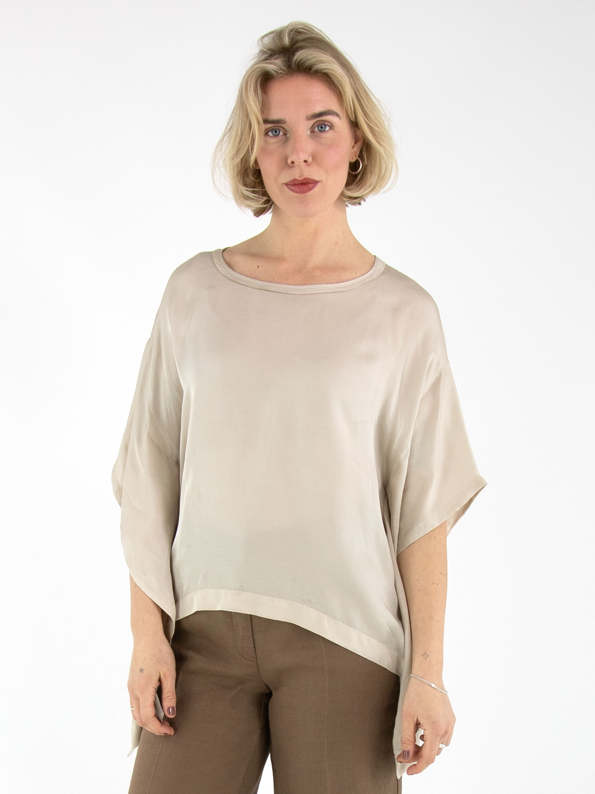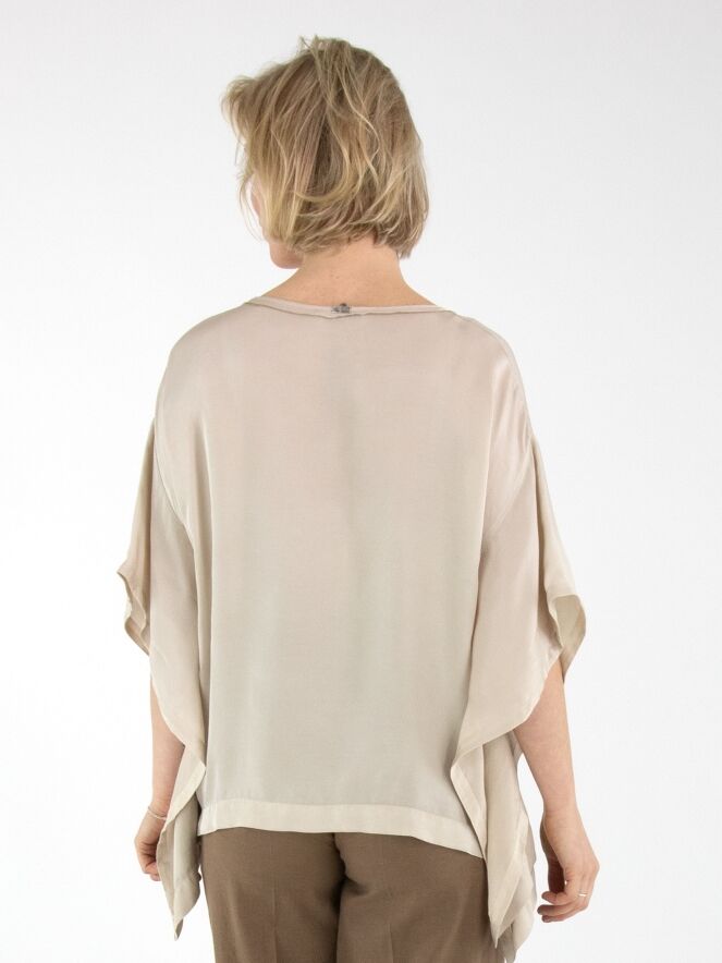 A matte satin shirt by High in beige. The shirt features a round neckline and batwing sleeves. This shirt can be washed at 30 degrees.