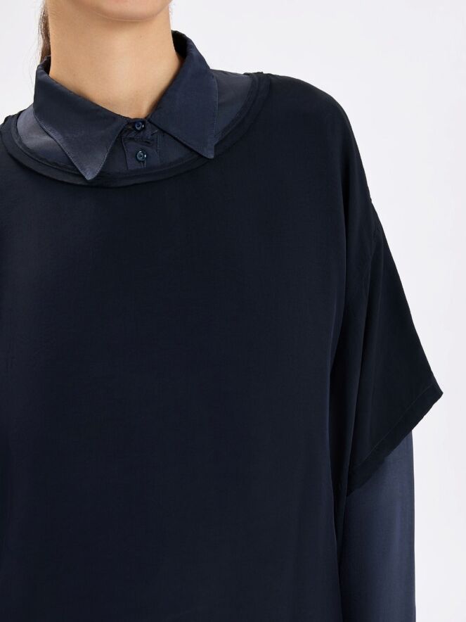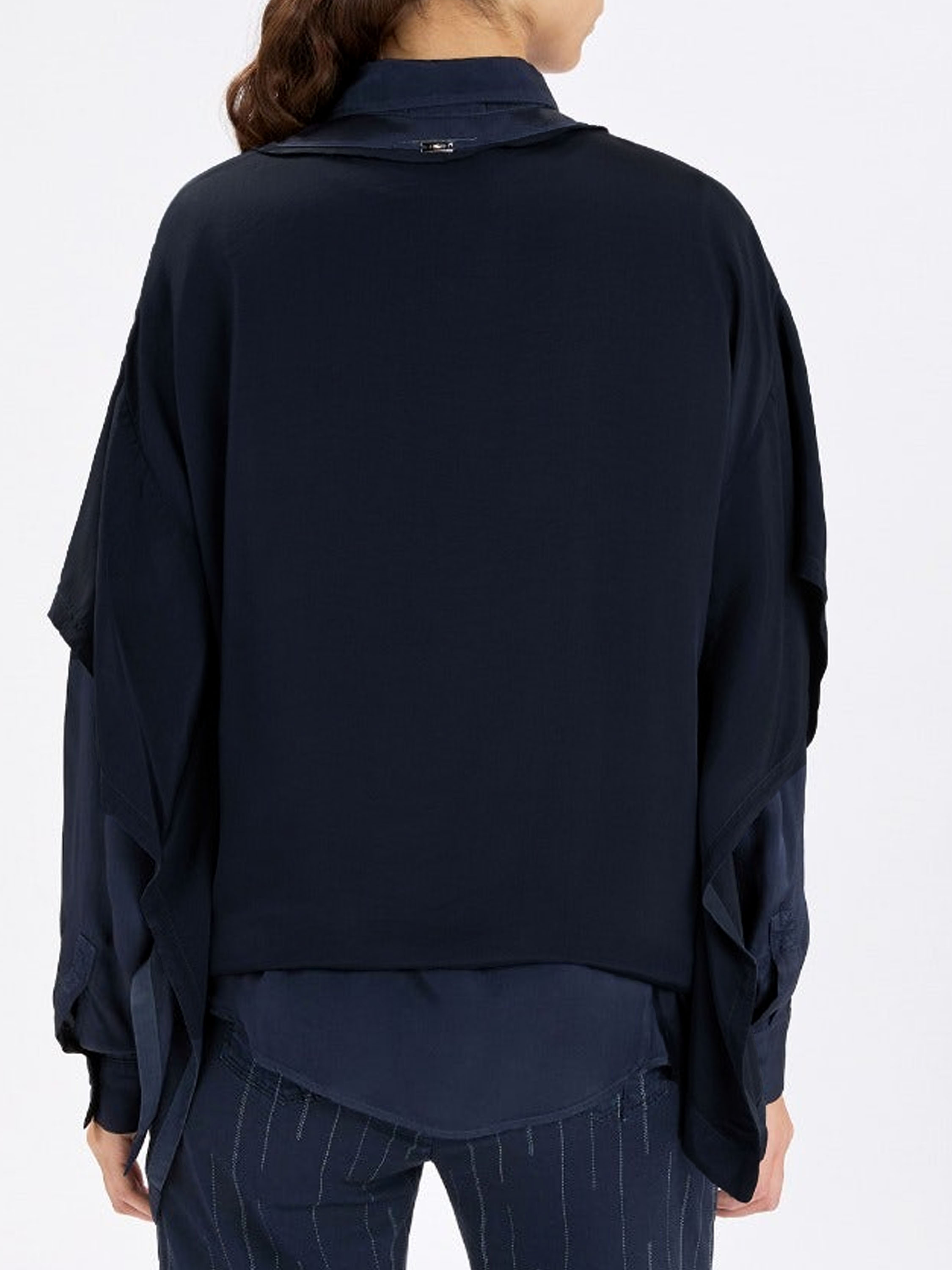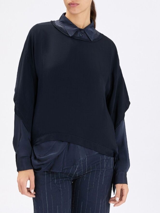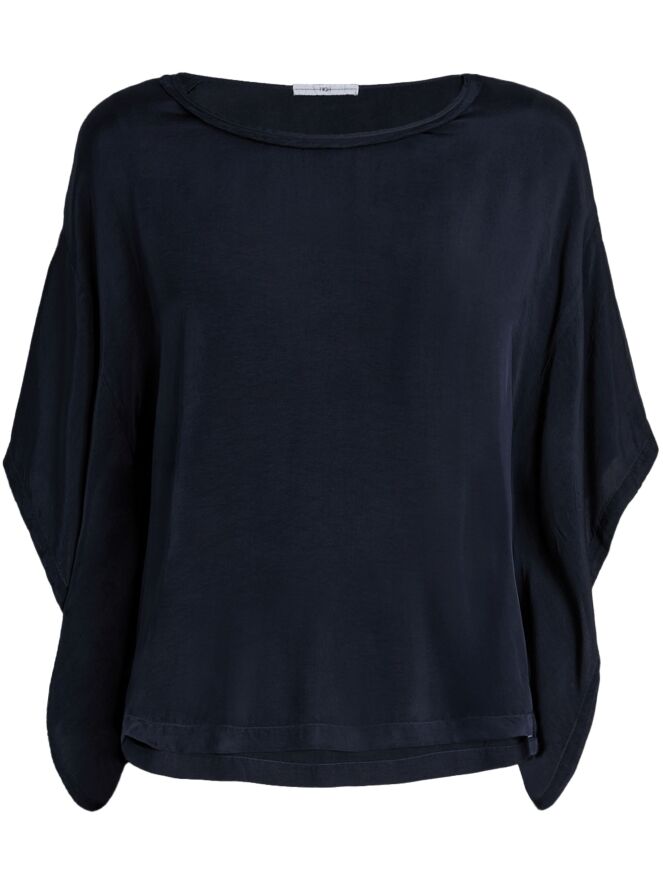 Matte satin shirt by High in navy blue. Designed with a round neckline and elegant batwing sleeves, it offers a fluid and feminine silhouette. This exclusive designer shirt can be washed at 30 degrees.