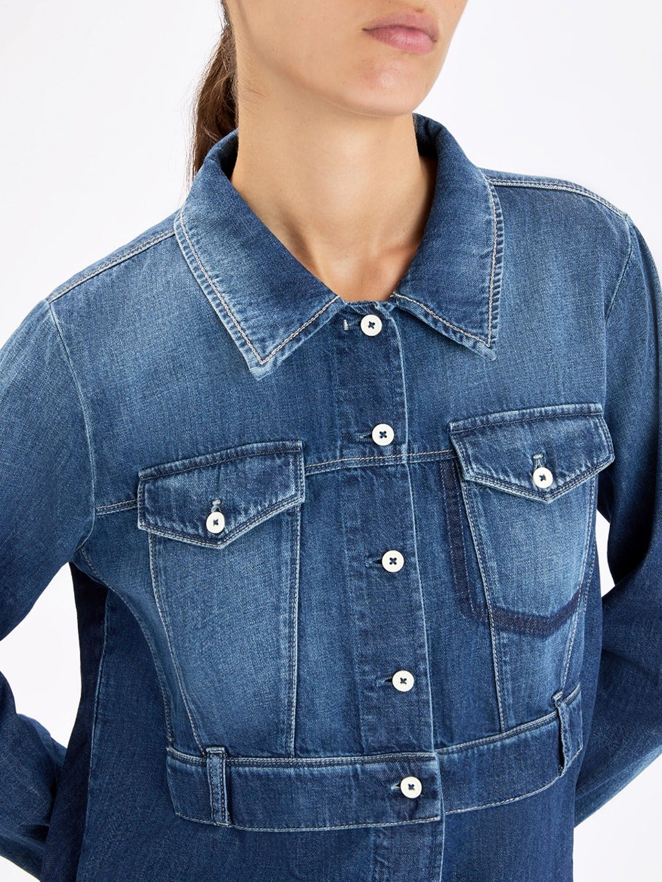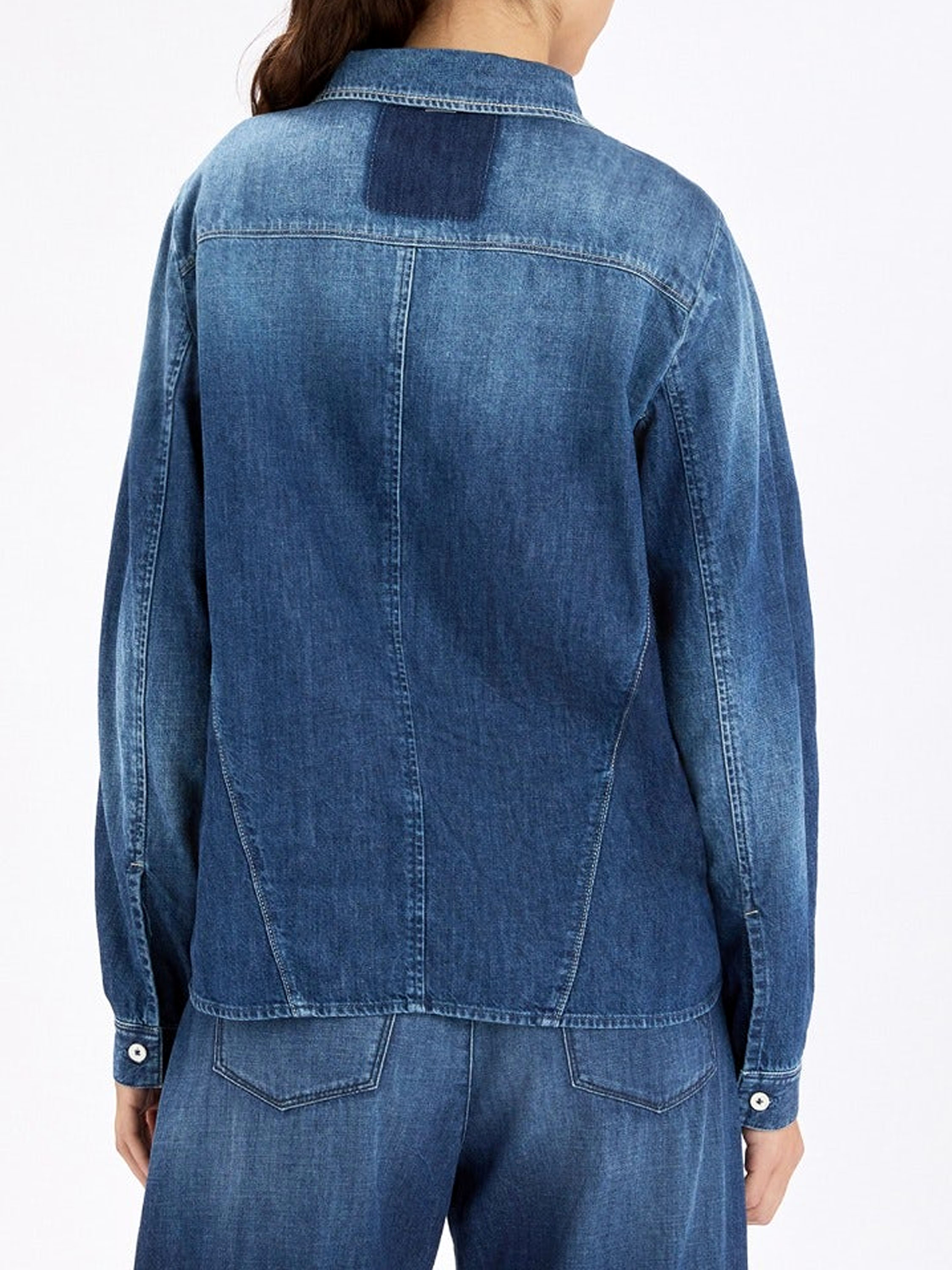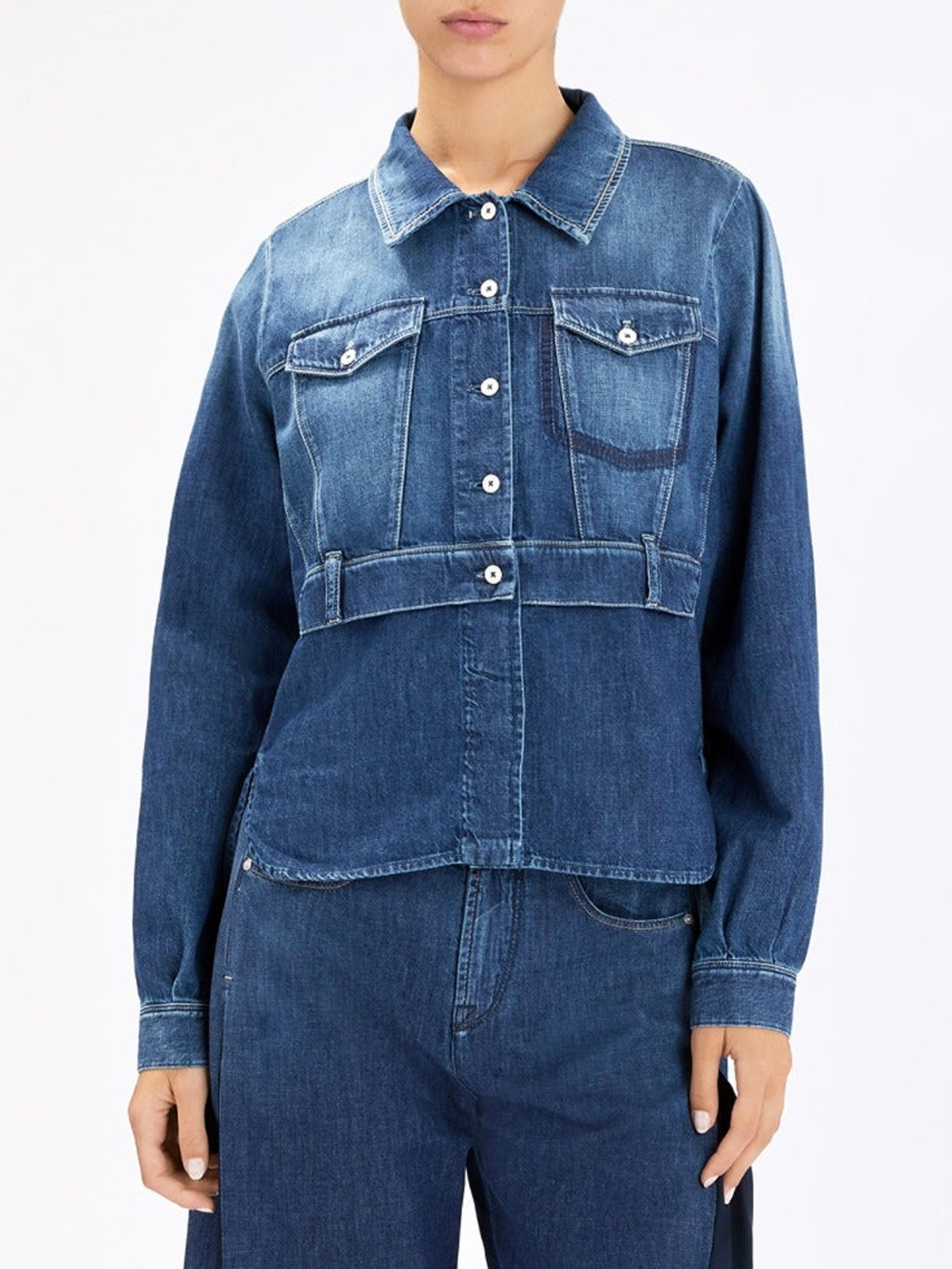 A denim blouse from High in a classic denim colour. At the front are two decorative chest pockets and, at waist level, an overlapping fabric detail with belt loops. At the hem, there is a short slit on both sides. This blouse can be washed at 30 degrees.