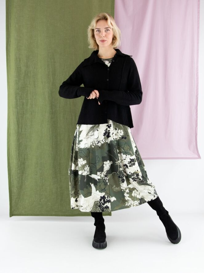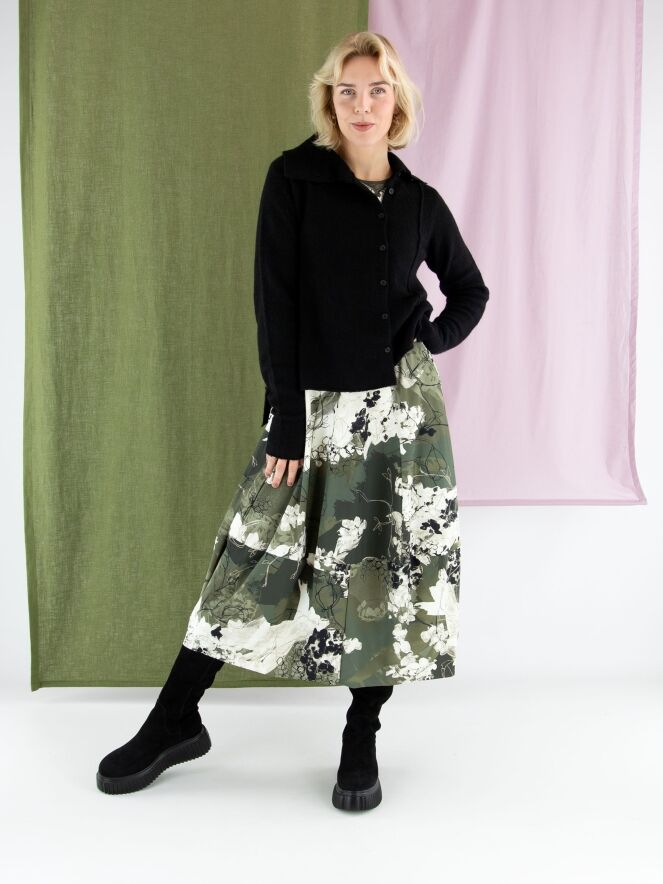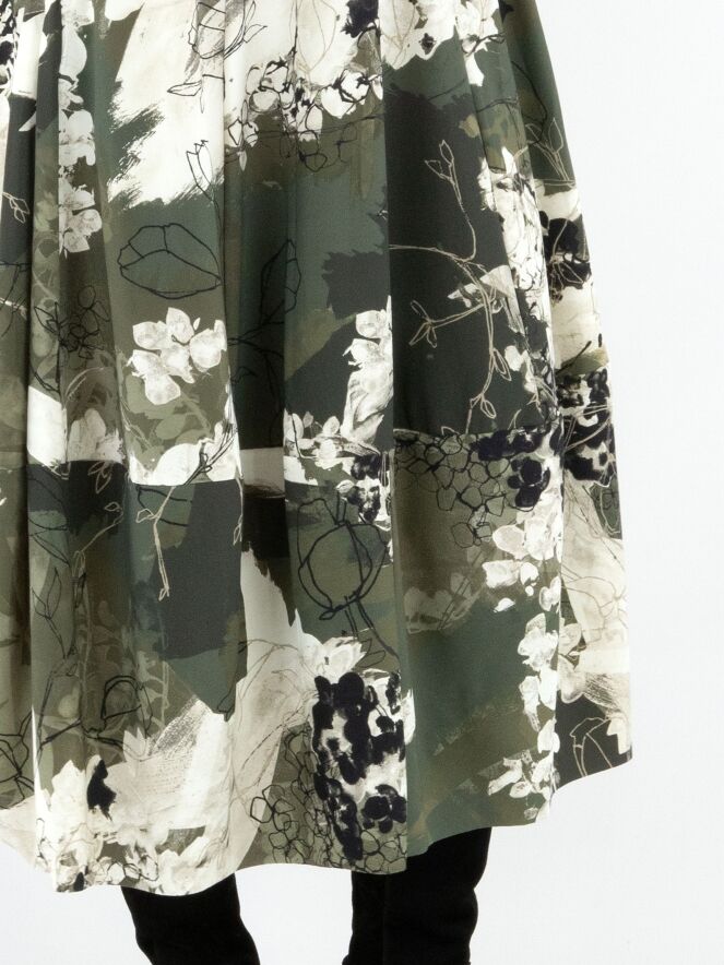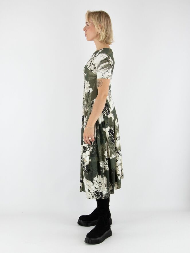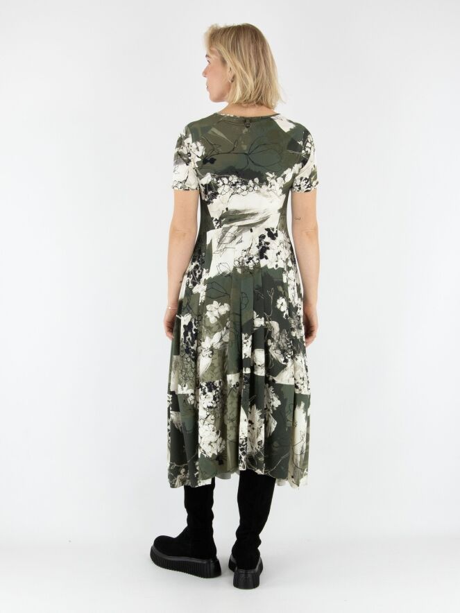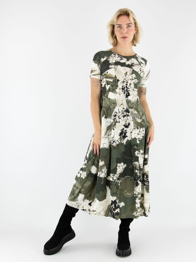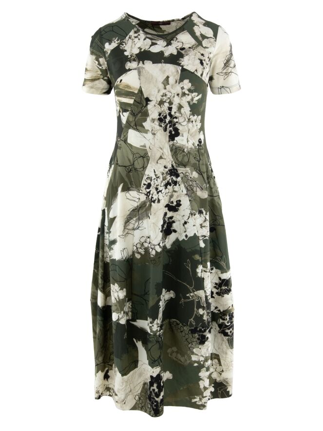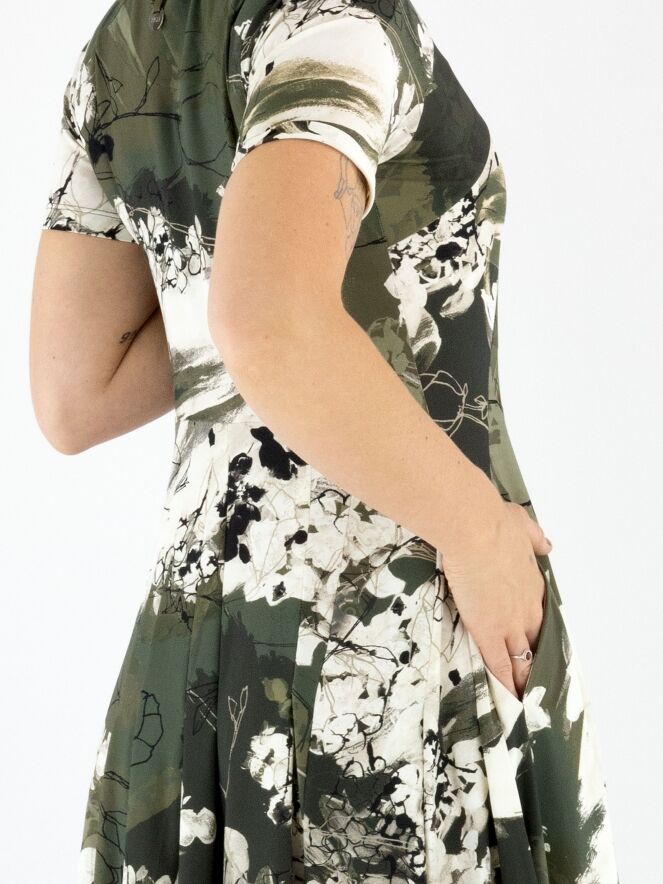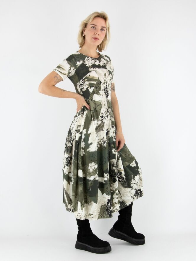 Dress by High with a graphic floral print in shades of black and olive green on an off-white background. Featuring a round neckline and short sleeves, the dress is designed with side pockets at the waist. From the waist down, it flows into an elegant balloon shape, creating a modern and feminine silhouette. This exclusive designer dress can be washed at 30 degrees.