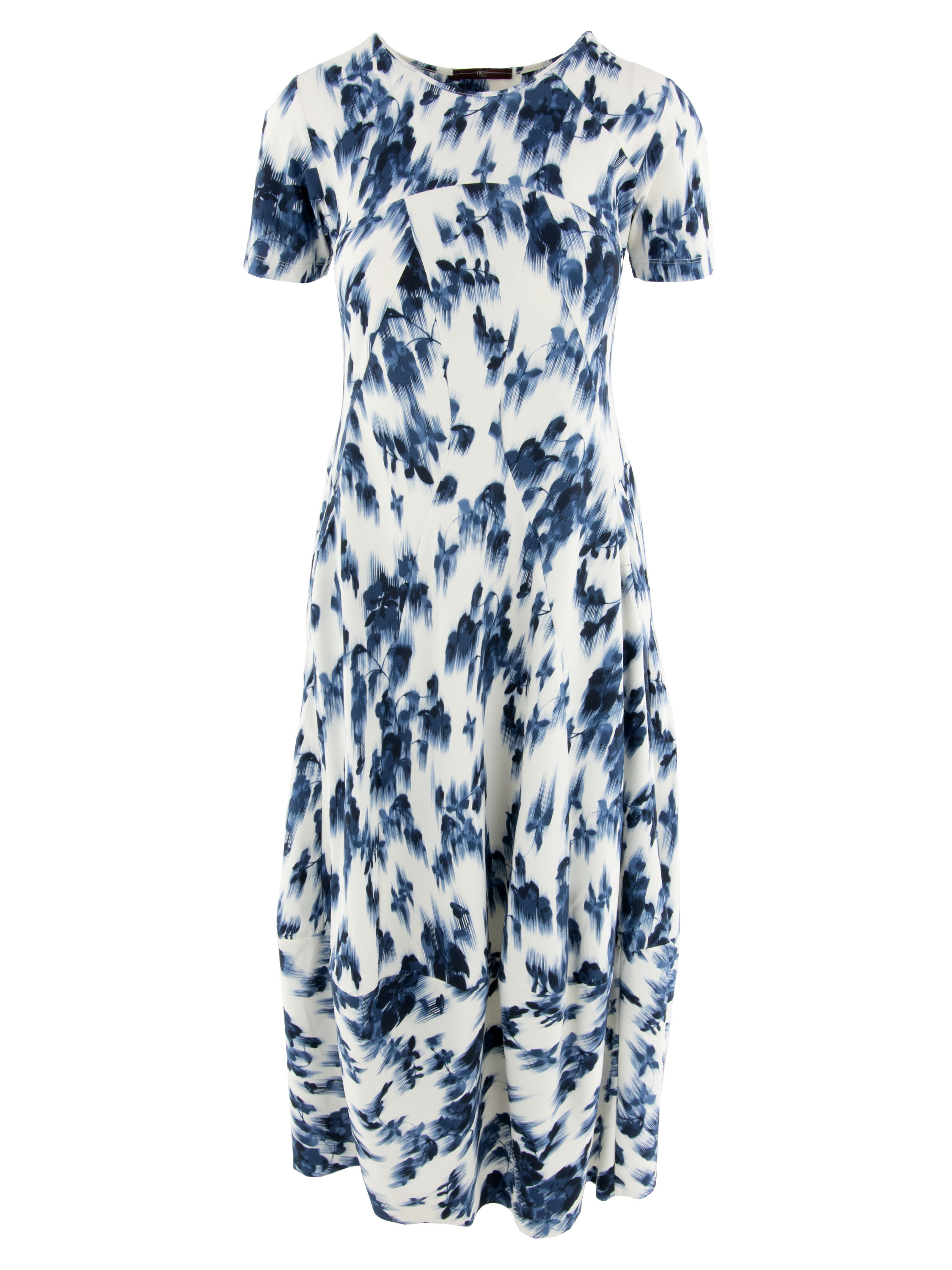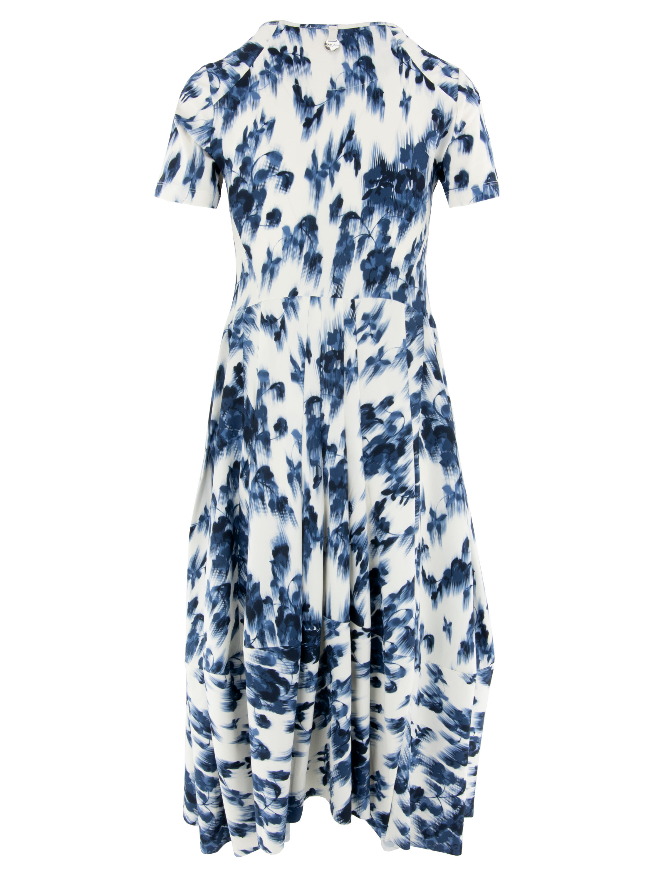 A dress from High Tech with a brushed floral print in various shades of blue on a white background. The dress has a round neckline and short sleeves. At waist level, there are slit pockets. From the waist, the dress has a subtle balloon shape. This dress can be washed at 30 degrees.
