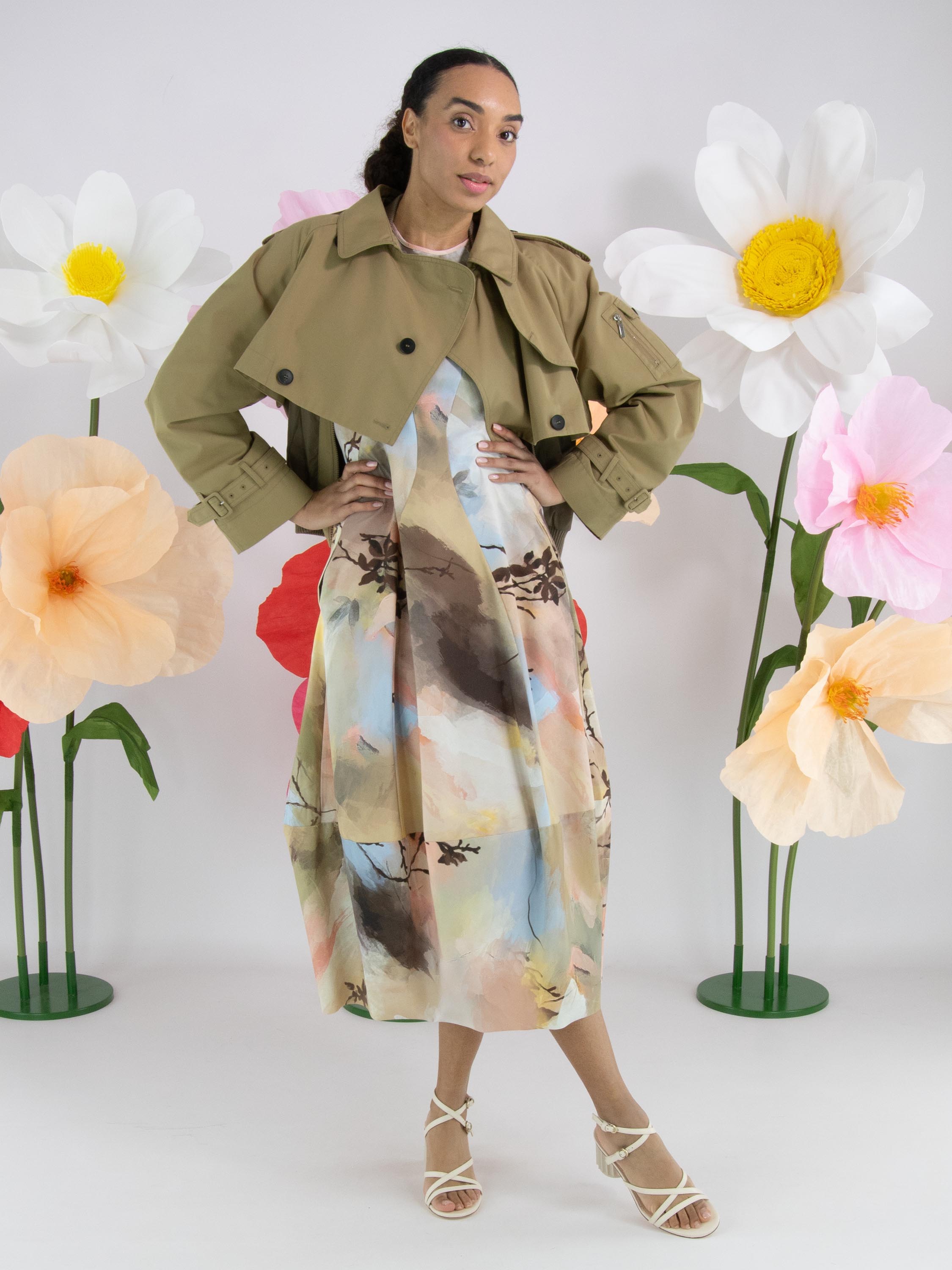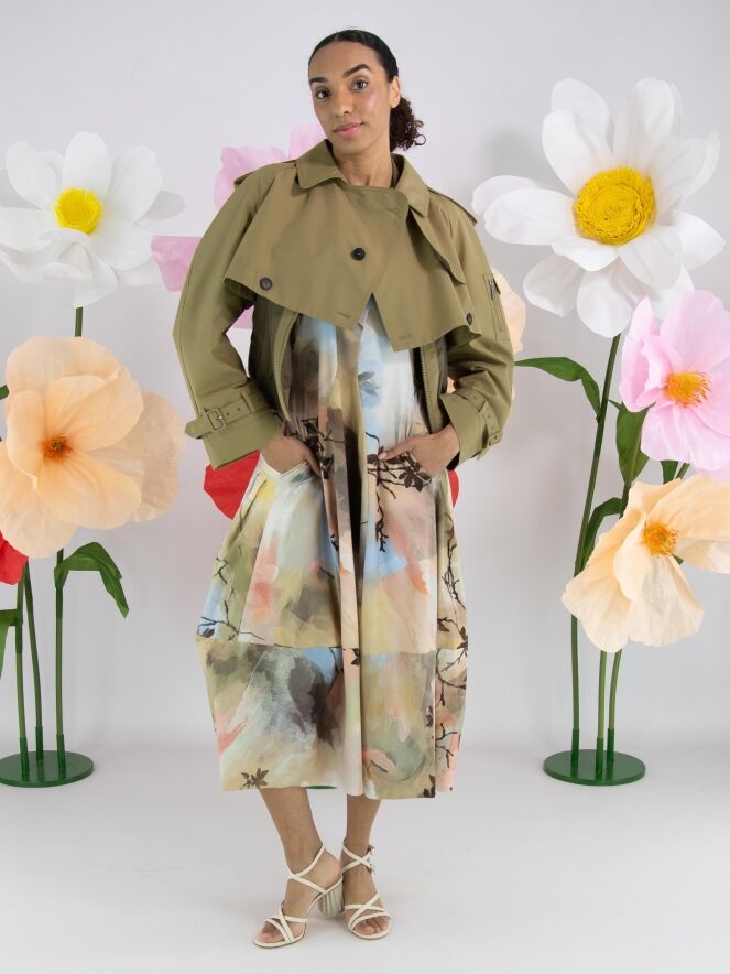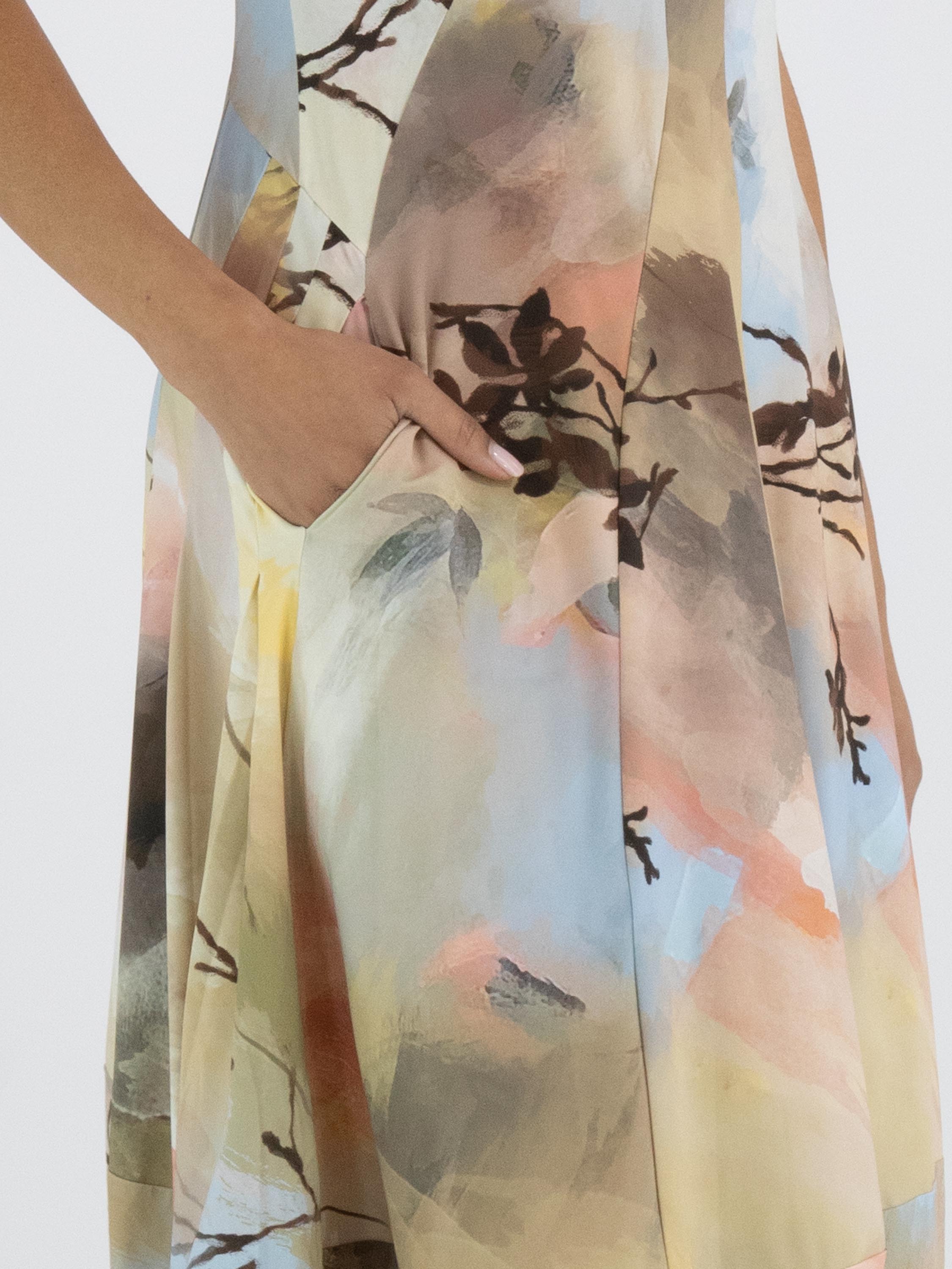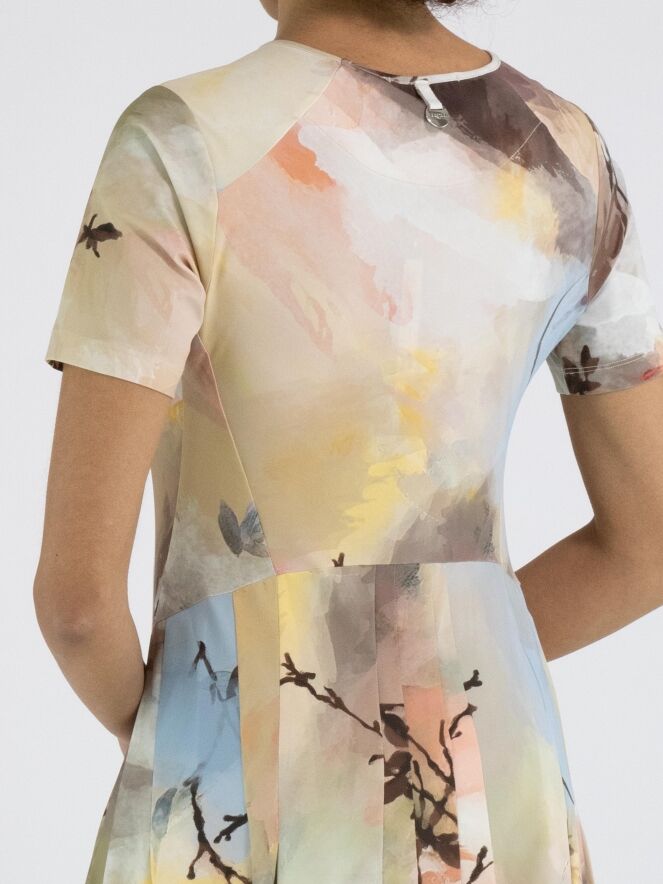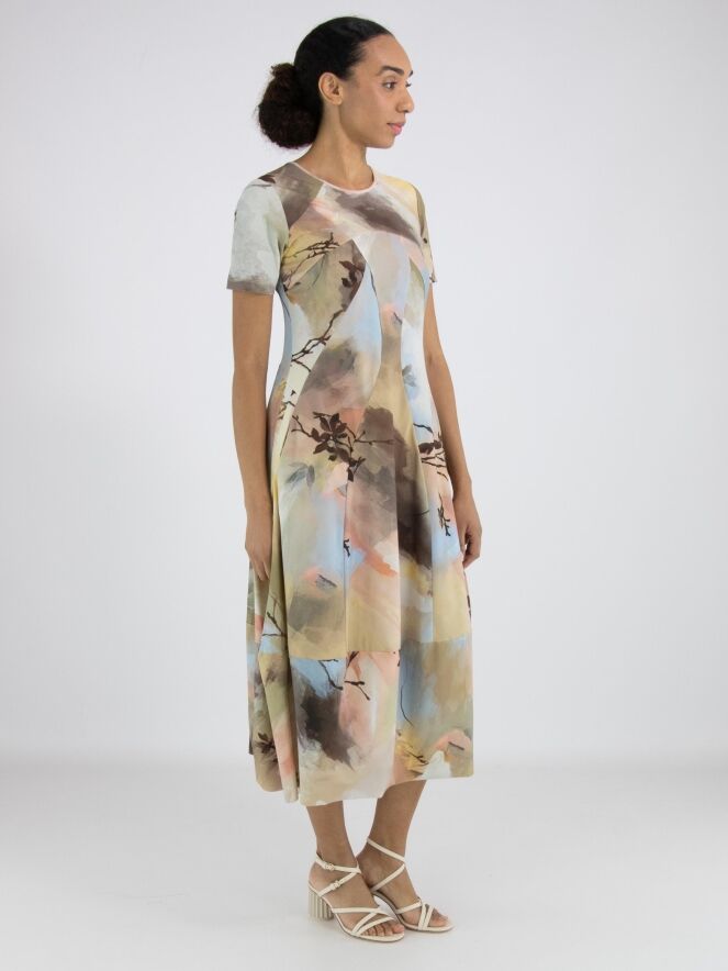 A dress from High Tech in a graphic multicolour watercolour print with main tones of various shades of taupe, pastel blue and salmon. The dress has a round neckline and short sleeves. At waist level, there are slit pockets. From the waist, the dress has a balloon shape. This dress can be washed at 30 degrees.