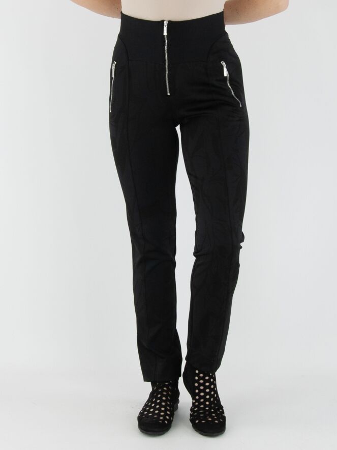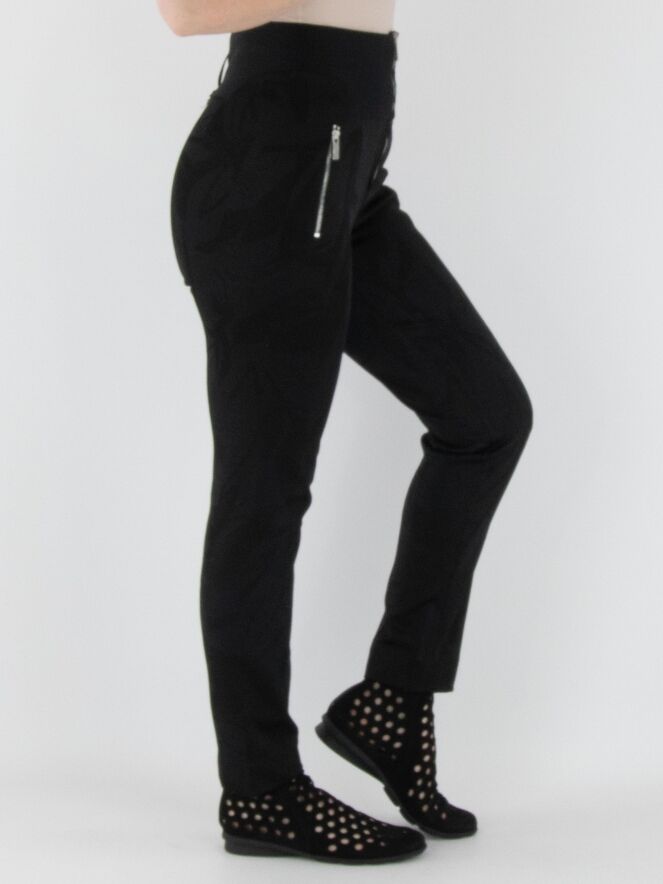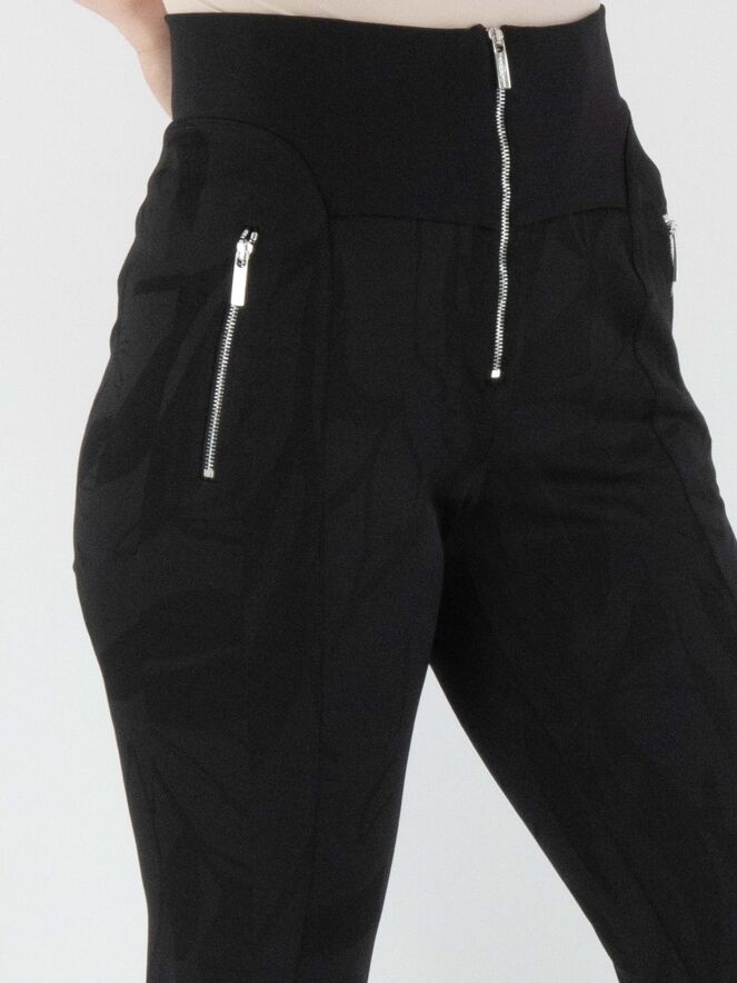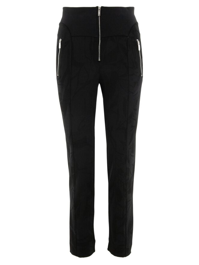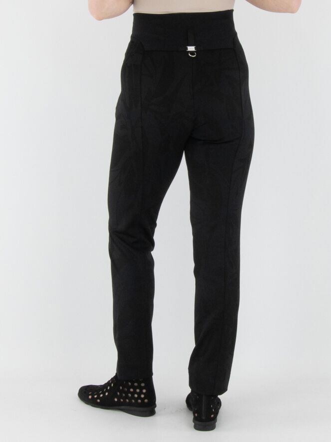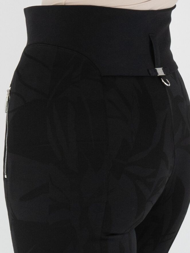 A high-waisted pair of trousers from High in black, featuring a graphic leaf print woven into the fabric. The waistband has a wide, finely ribbed knit band with a zipper in the center. These trousers should be hand-washed.
