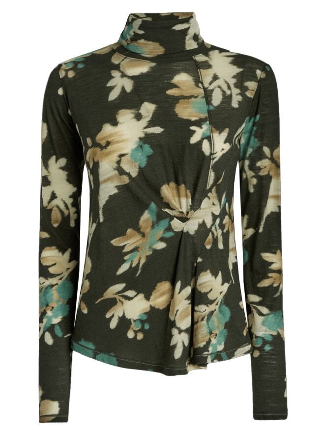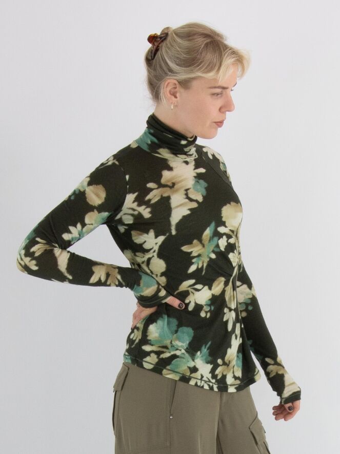 A shirt by High with a graphic floral print in shades of beige, taupe, and turquoise on an olive green background. It features a draped turtleneck and long sleeves. This shirt must be hand-washed.