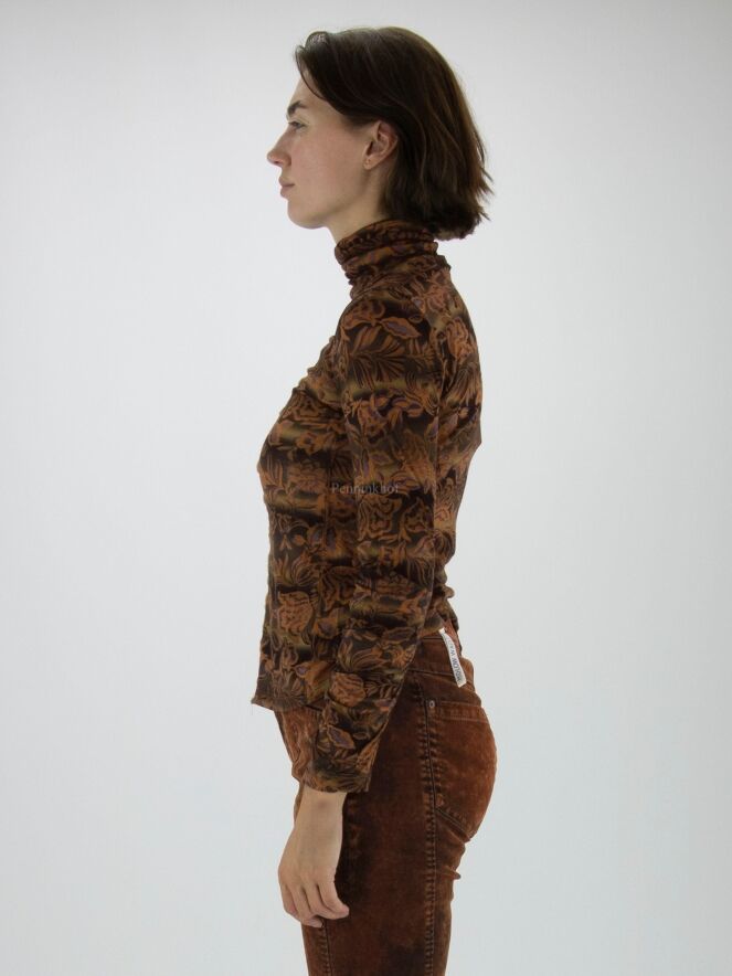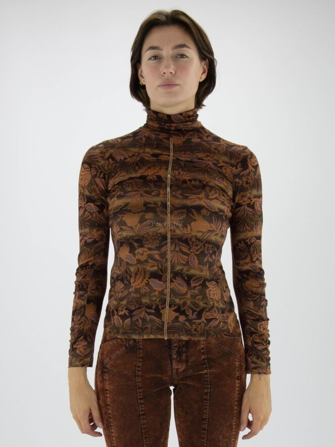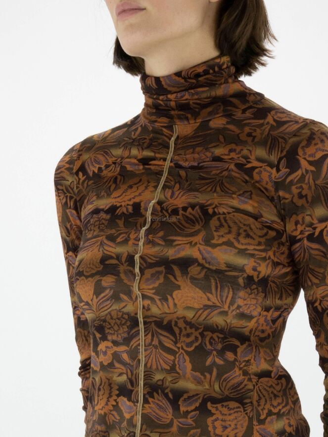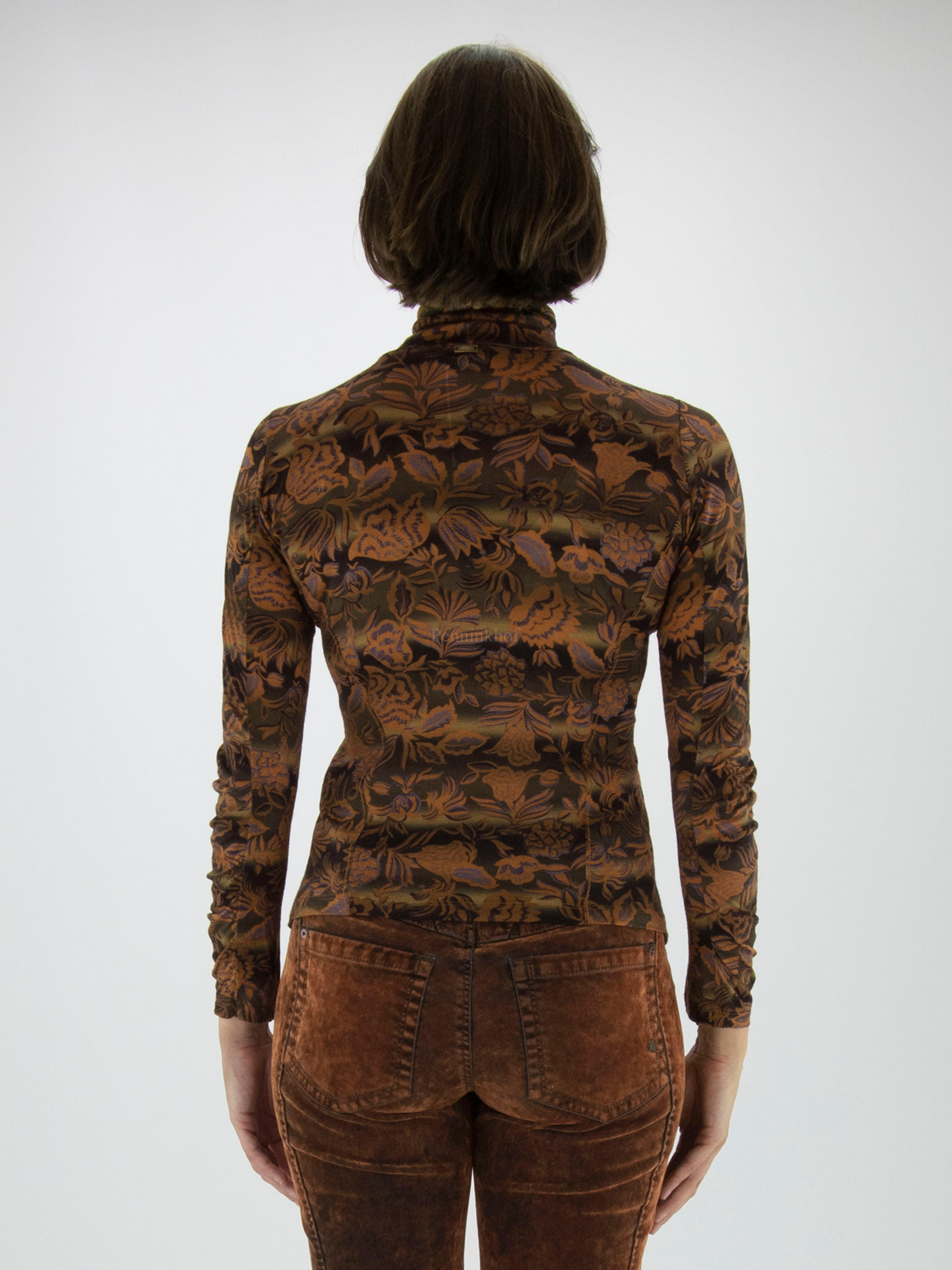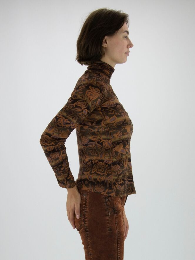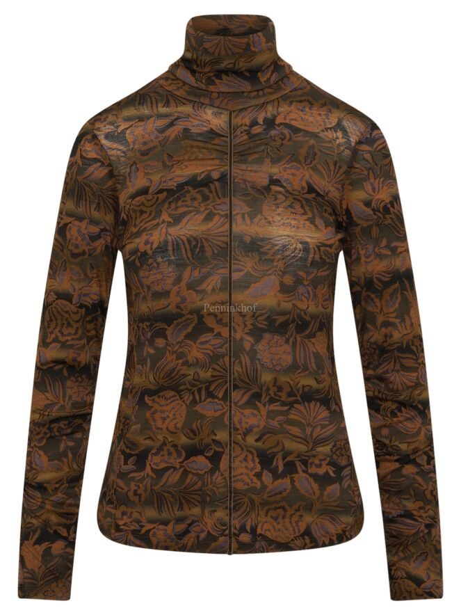 A shirt from High in a baroque print featuring the colours orange, purple and multiple shades of olive green. The shirt has a coll and long sleeves. This shirt may be hand washed.