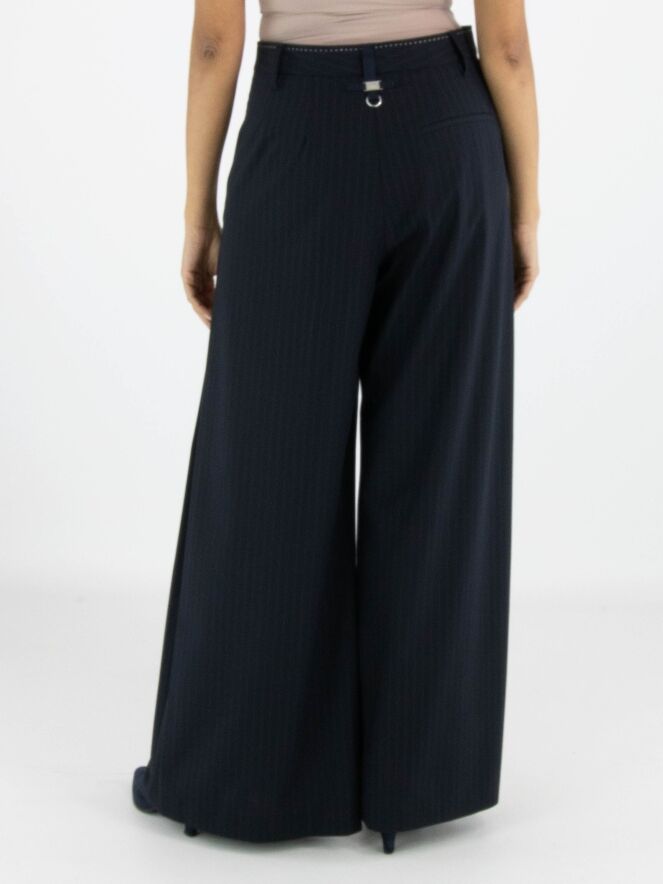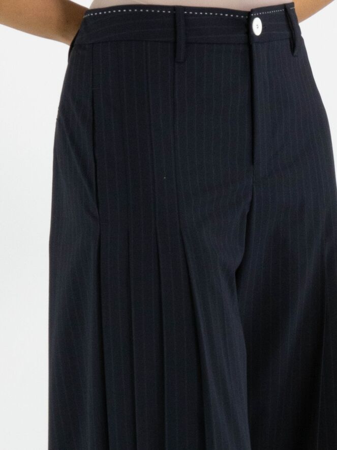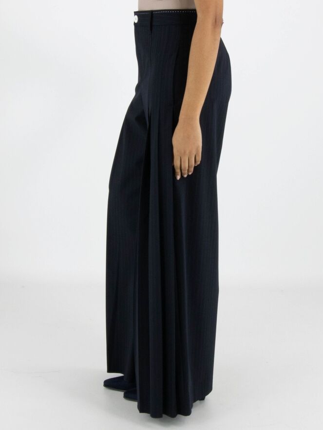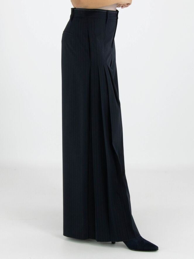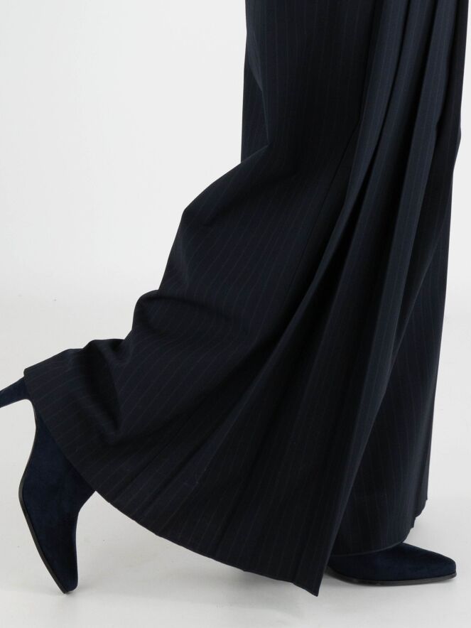 A wide-leg trouser from High in a pinstripe texture in navy blue. From the front at hip level, several pleats on each side extend downwards, creating a subtle plissé effect towards the legs. These trousers must not be washed.
