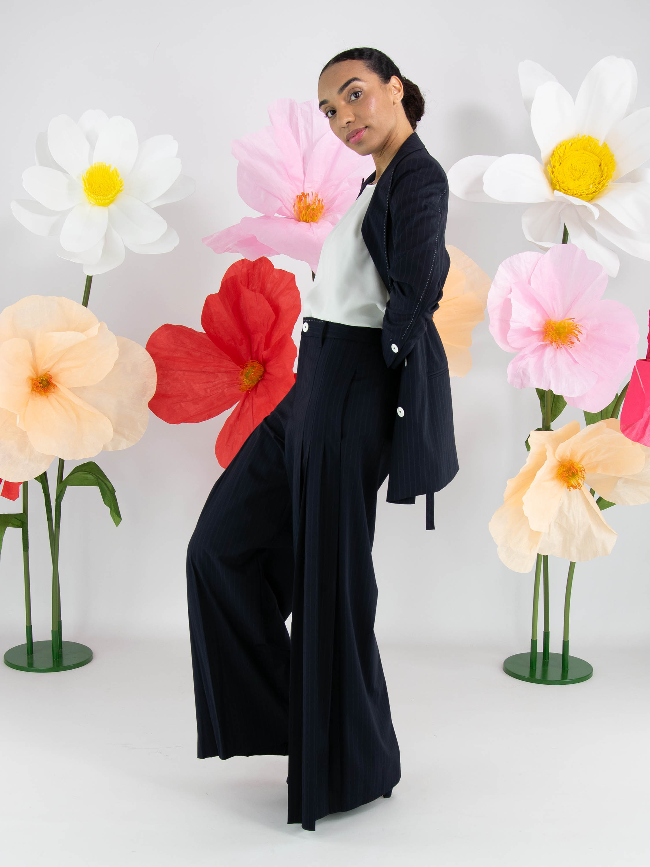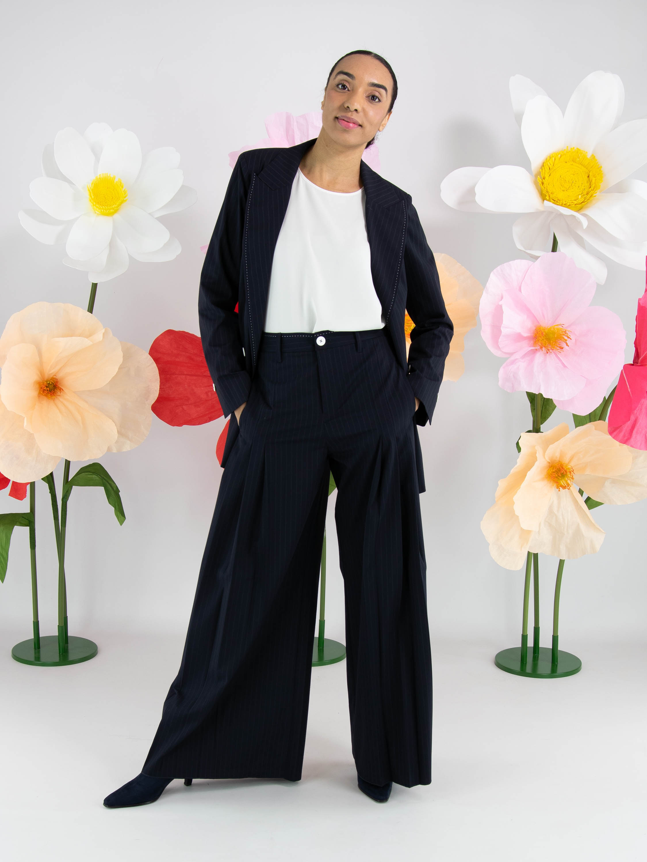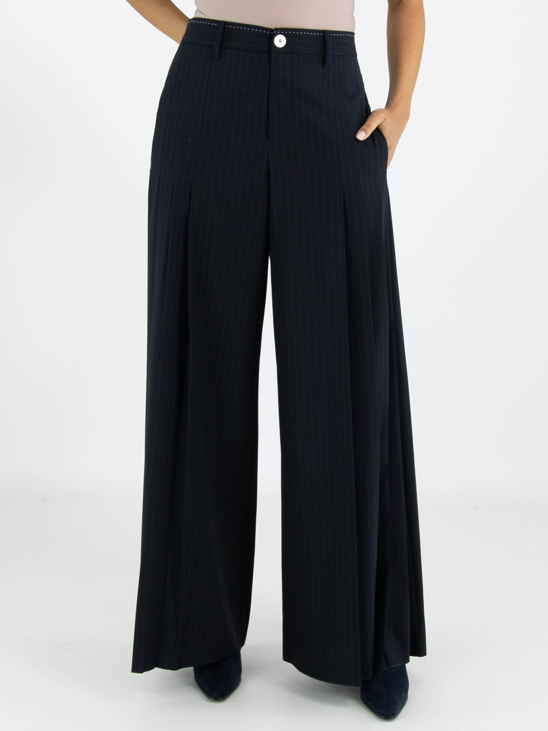 A wide-leg trouser from High in a pinstripe texture in navy blue. From the front at hip level, several pleats on each side extend downwards, creating a subtle plissé effect towards the legs. These trousers must not be washed.