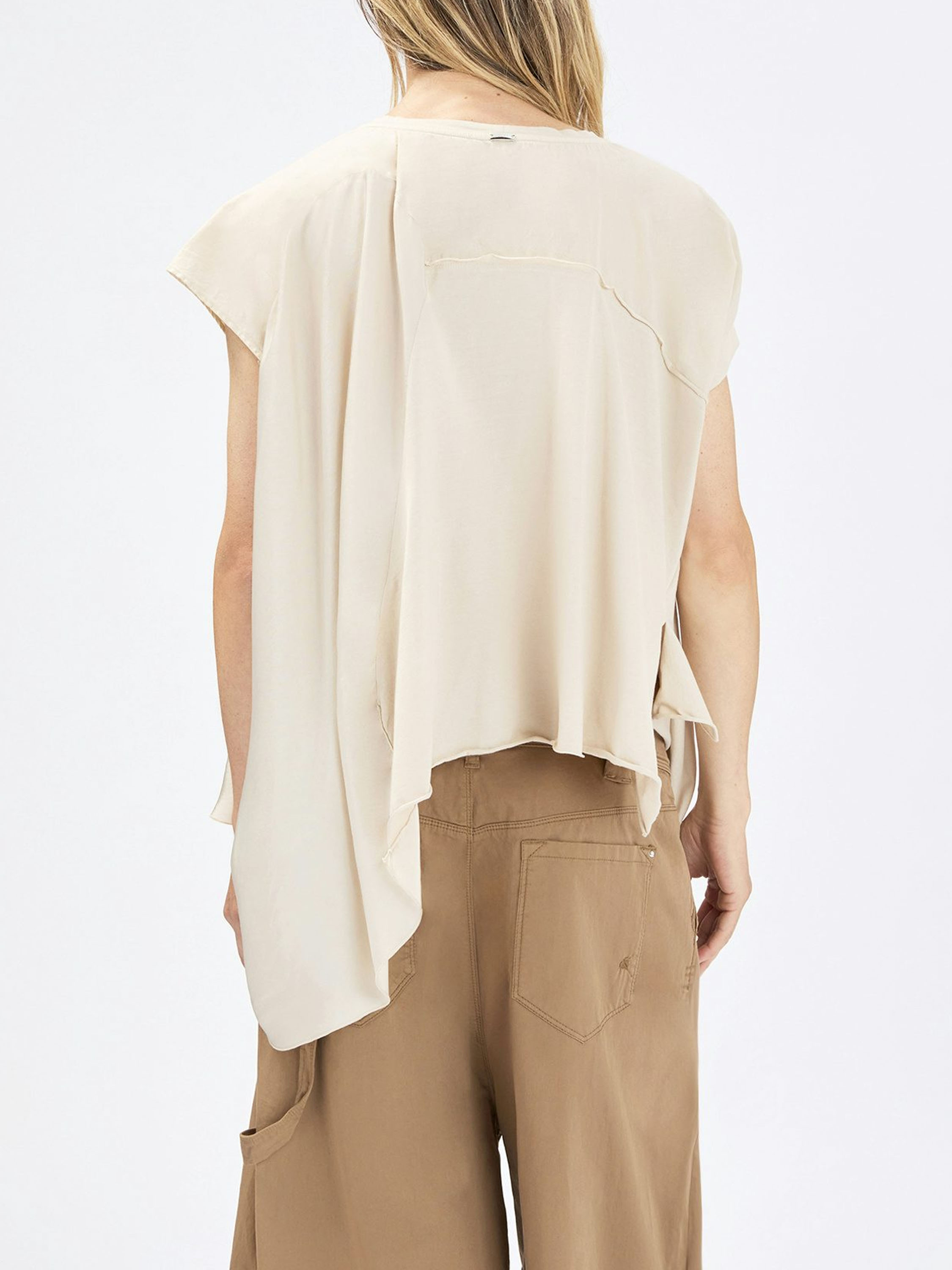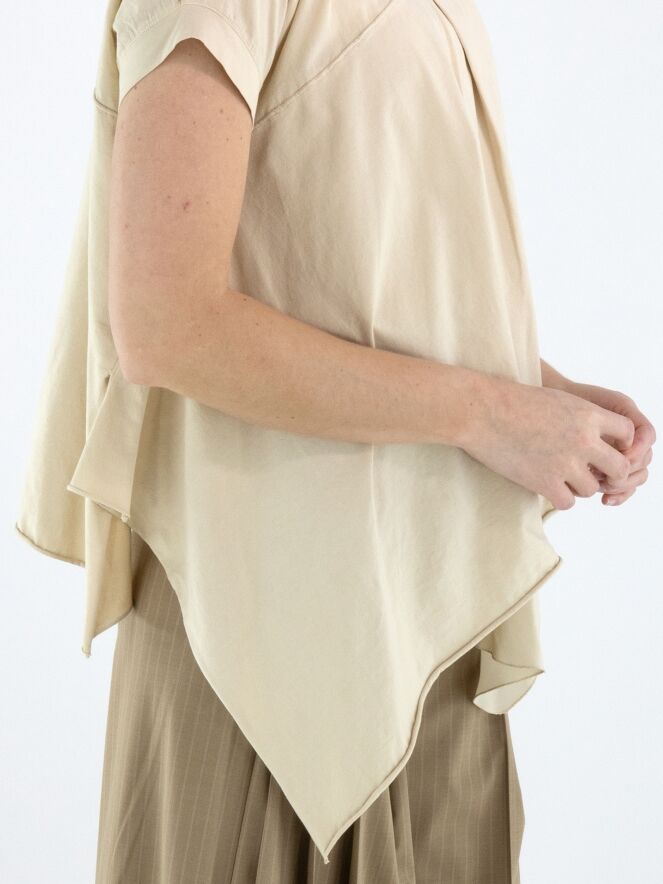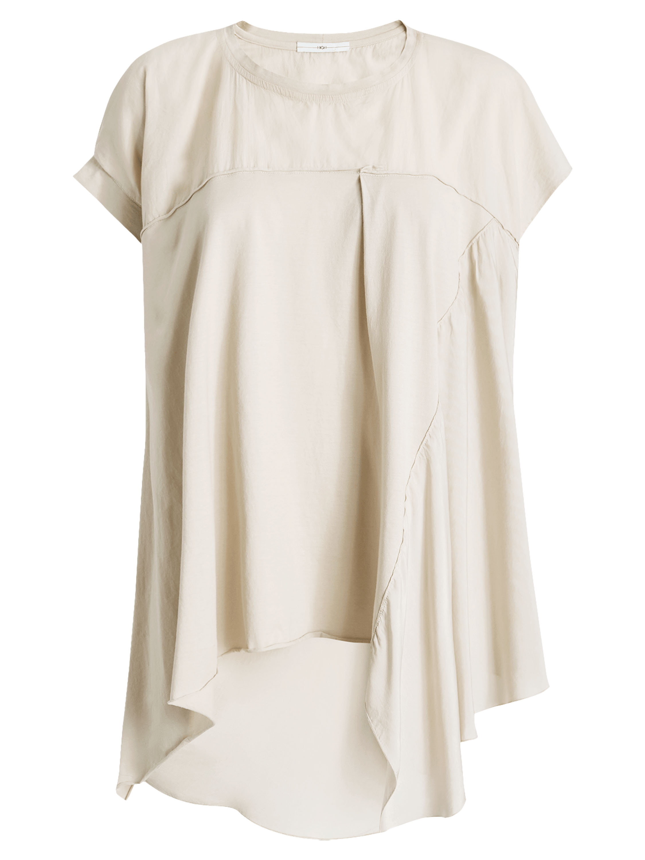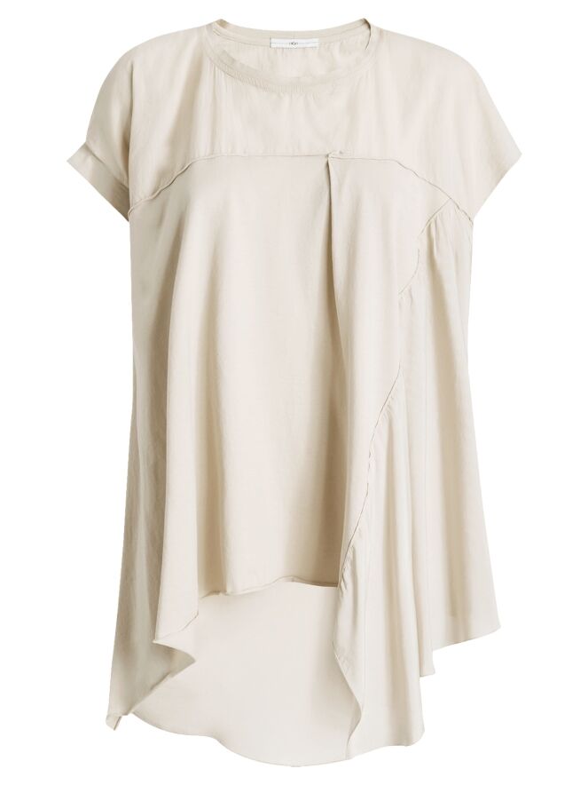 Top by High in a refined sand shade. A subtle seam above the bust adds structure to the design. The left front and back panels are crafted in a matte satin fabric, creating an elegant contrast in texture. Designed in an A-line silhouette, the sides fall longer than the center, resulting in a fluid and contemporary look. This exclusive designer top should be hand-washed.