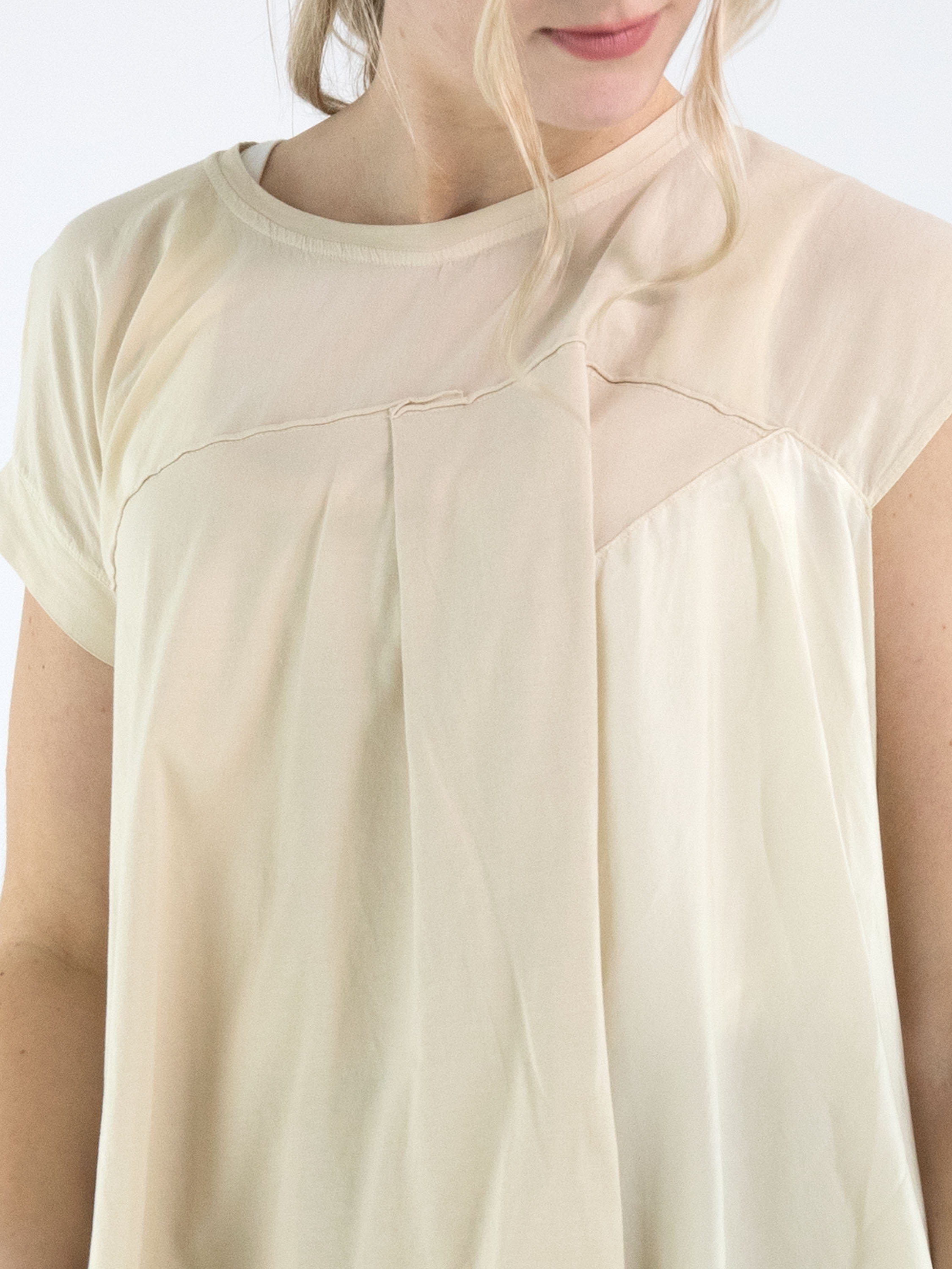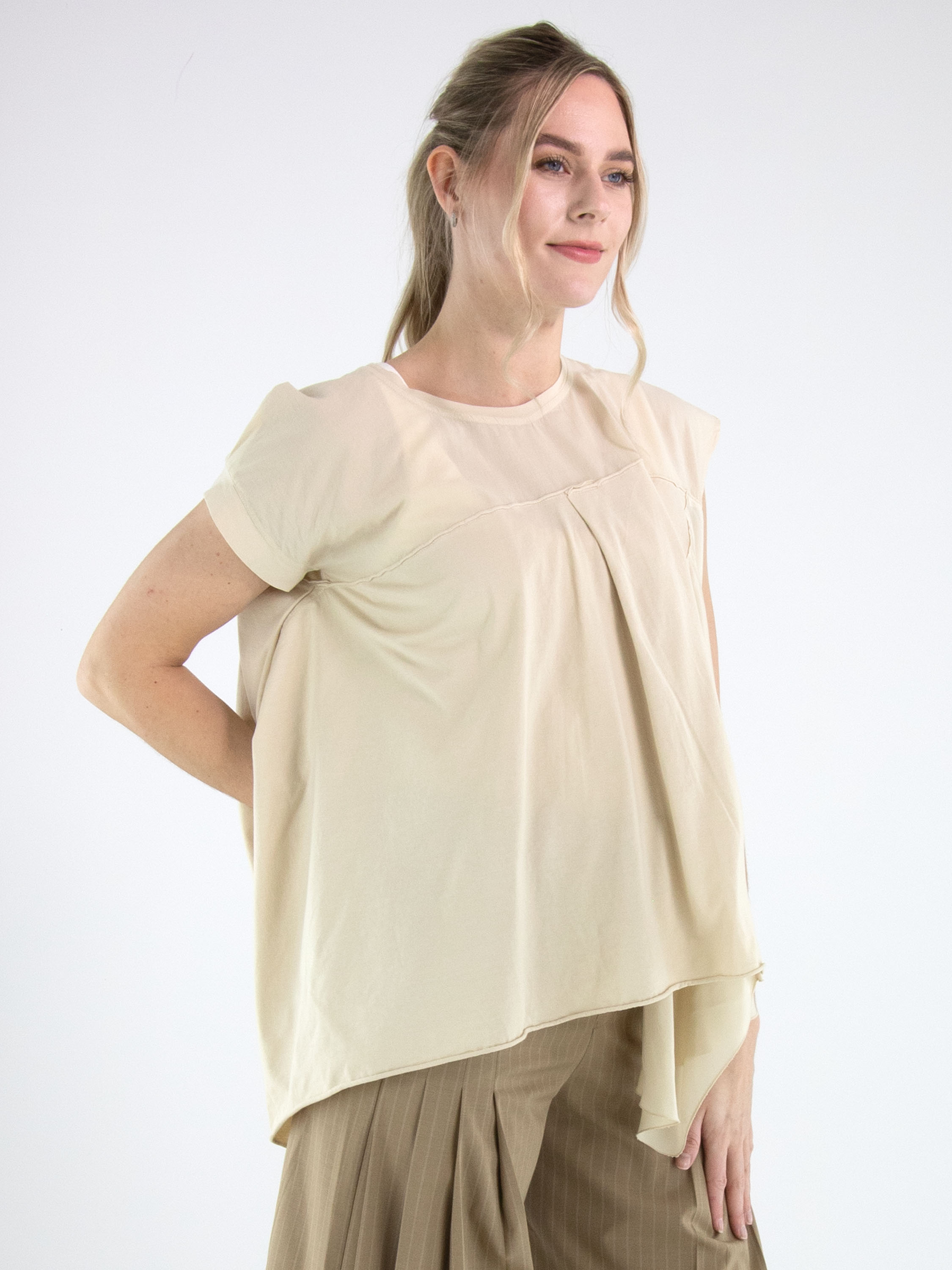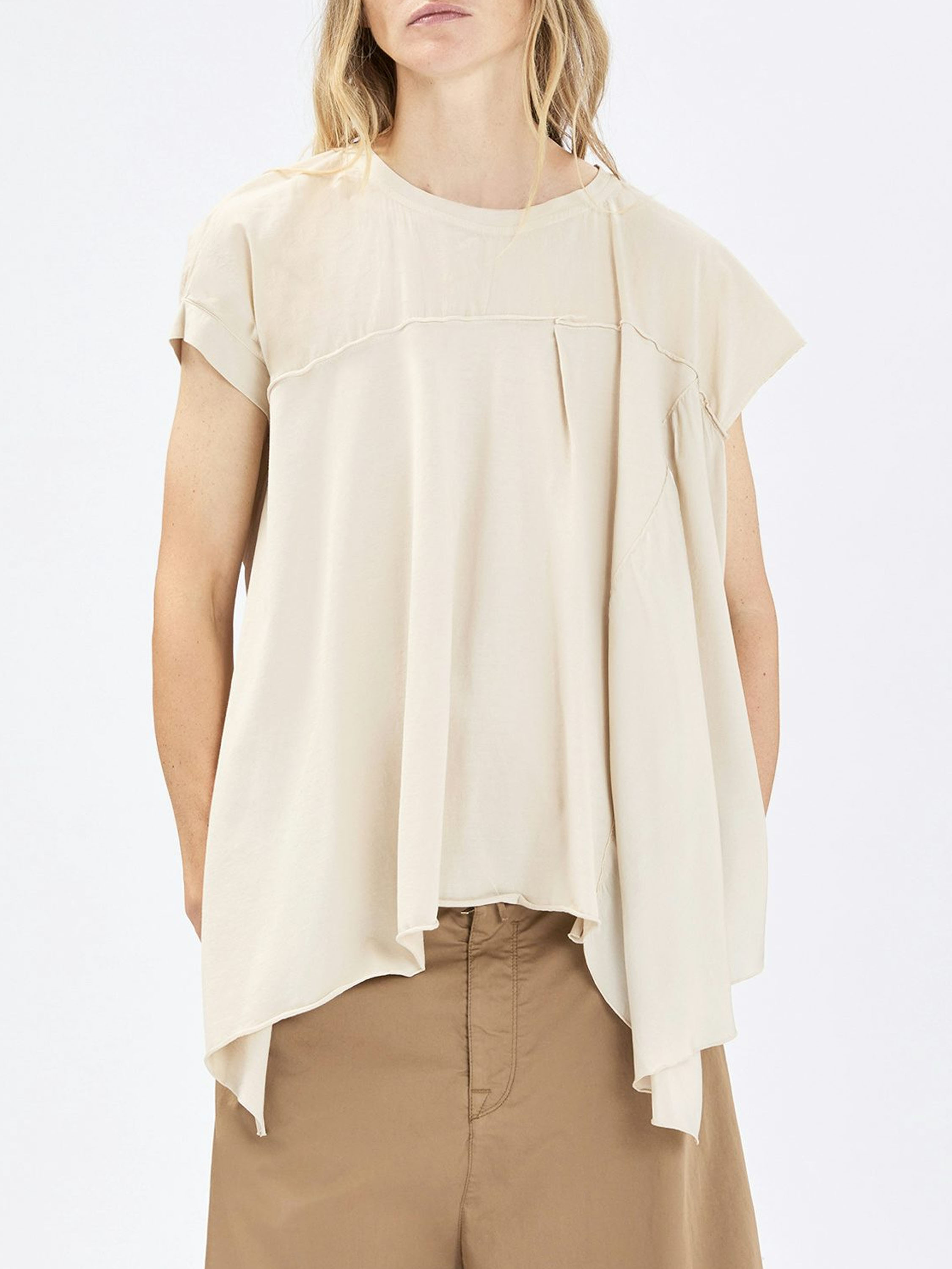 Top by High in a refined sand shade. A subtle seam above the bust adds structure to the design. The left front and back panels are crafted in a matte satin fabric, creating an elegant contrast in texture. Designed in an A-line silhouette, the sides fall longer than the center, resulting in a fluid and contemporary look. This exclusive designer top should be hand-washed.
