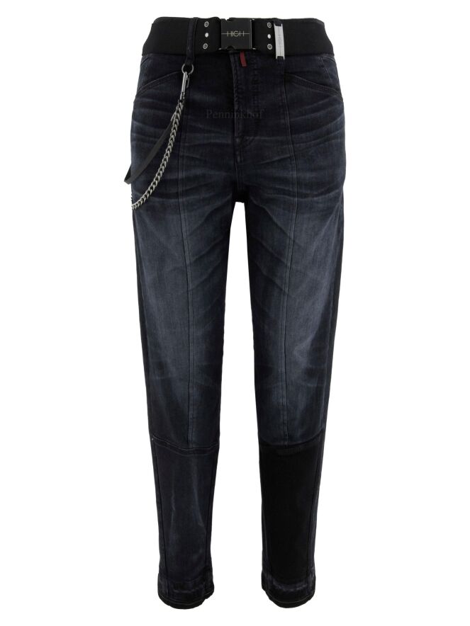 Washed jeans from High in black. At the waist is an elasticated belt with a square nickel-coloured buckle. From the right belt loop is a chain that runs to the back. These jeans may be washed at 30 degrees.