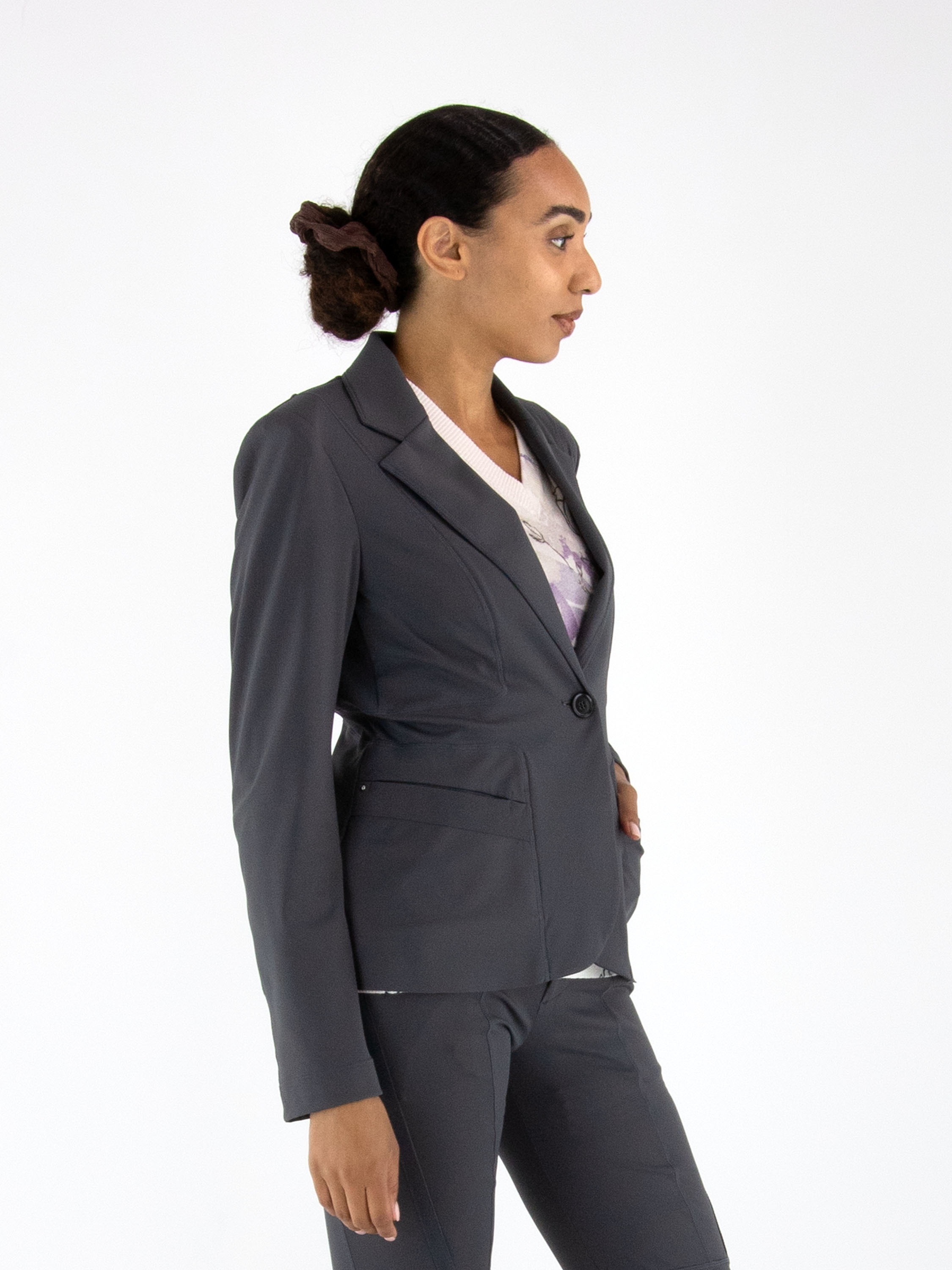 A blazer by High in an elegant grey shade. Decorative stitching in a block pattern runs from the shoulders down along the pockets, adding a refined detail. The blazer closes with a single button and is unlined, creating a light and modern silhouette. This blazer cannot be washed.