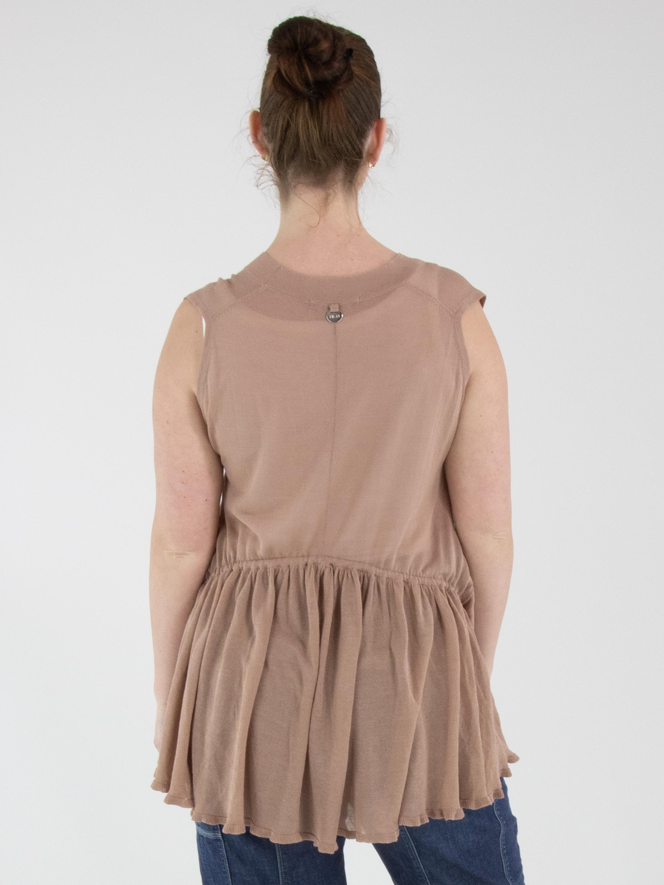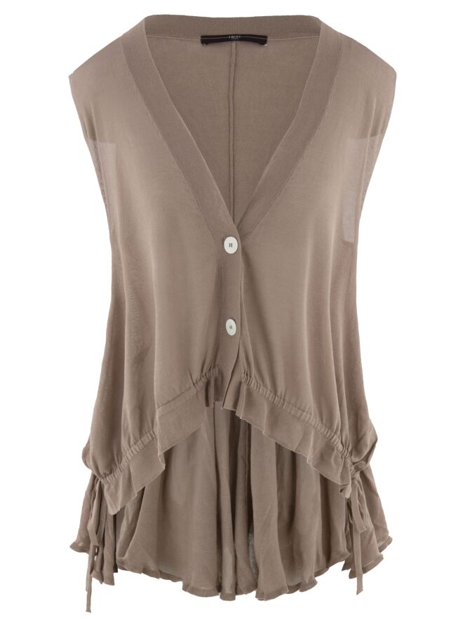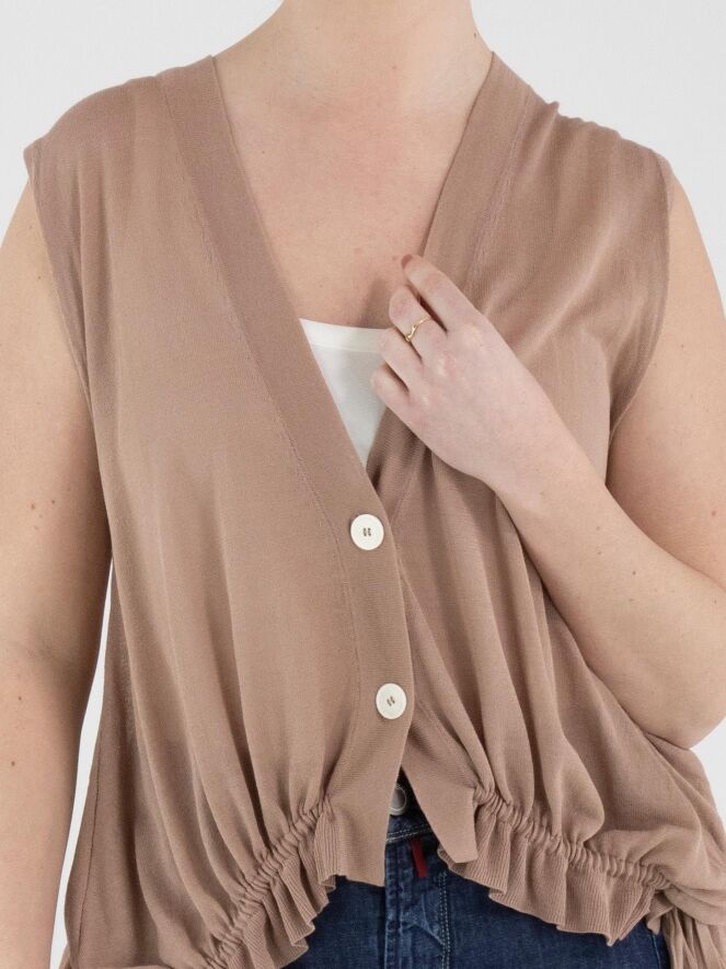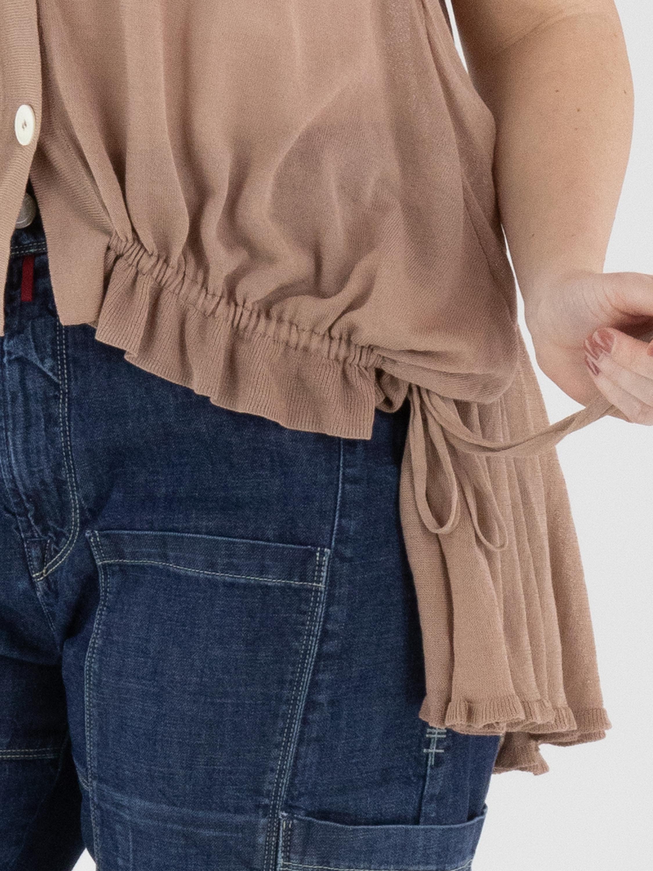 A lightly transparent cardigan by High in a soft mauve shade. The cardigan features a two-button closure. At the front hem, a ribbon is inserted into a tunnel construction, allowing a pleated effect to be created. At the back, this ribbon in tunnel construction is positioned at waist level. This cardigan can be hand-washed.