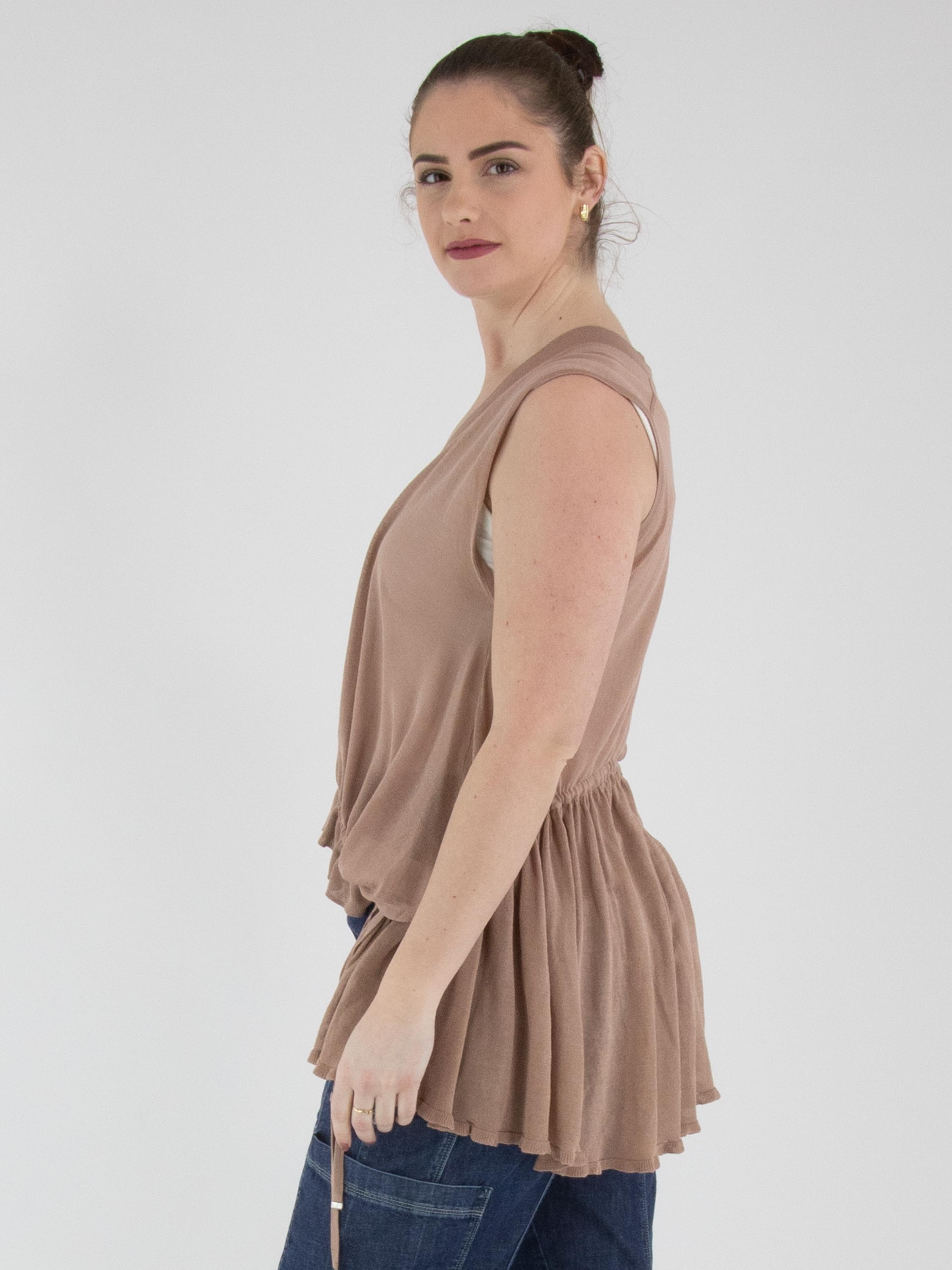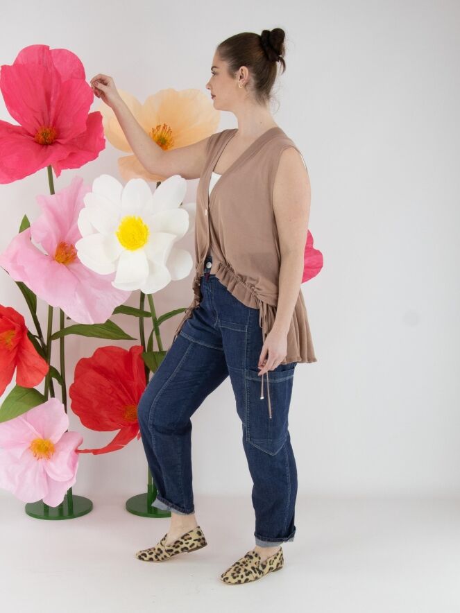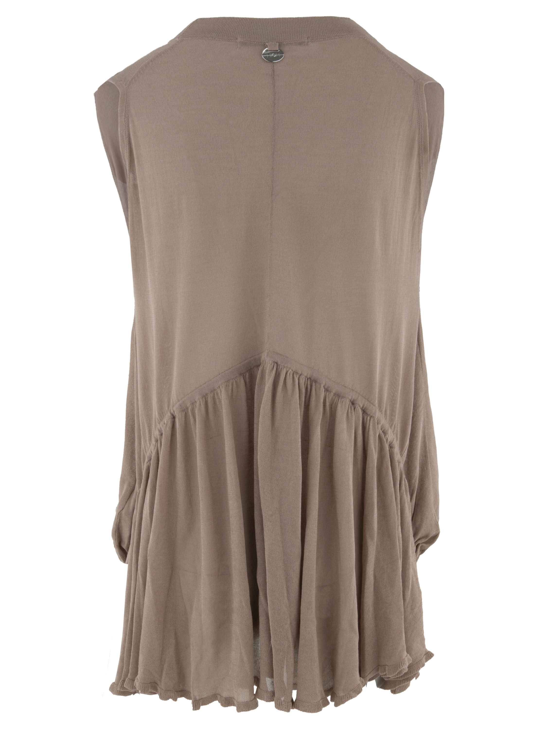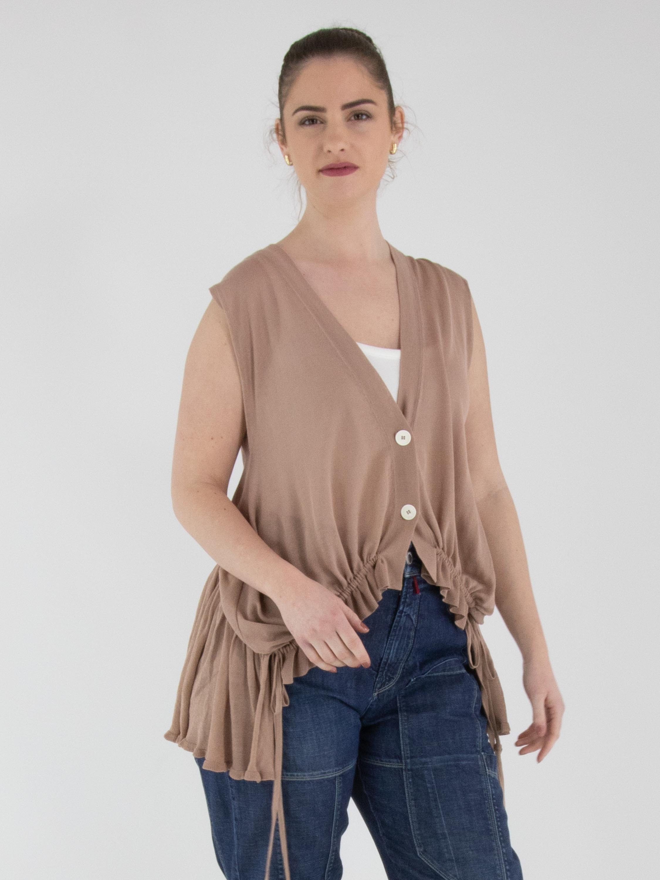A lightly transparent cardigan by High in a soft mauve shade. The cardigan features a two-button closure. At the front hem, a ribbon is inserted into a tunnel construction, allowing a pleated effect to be created. At the back, this ribbon in tunnel construction is positioned at waist level. This cardigan can be hand-washed.