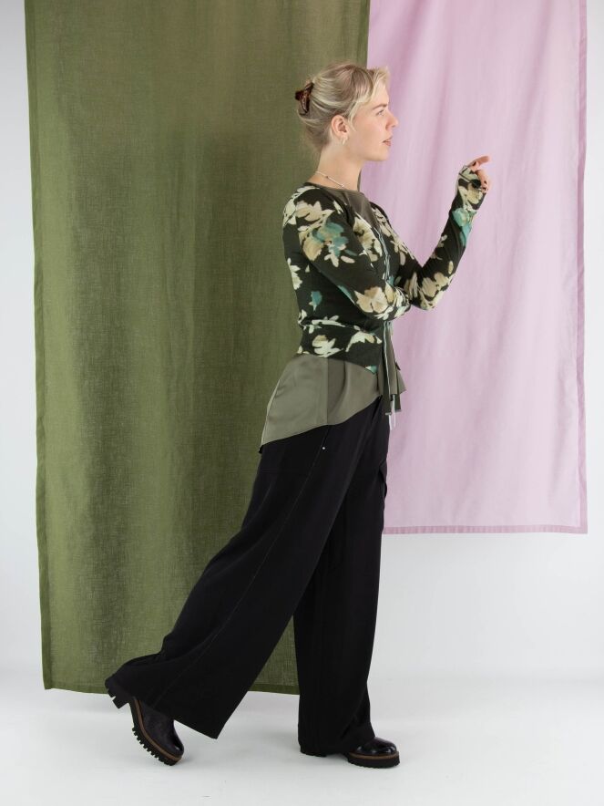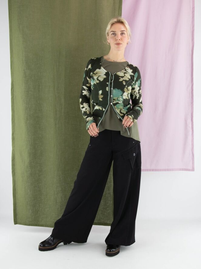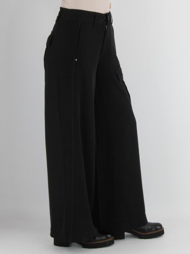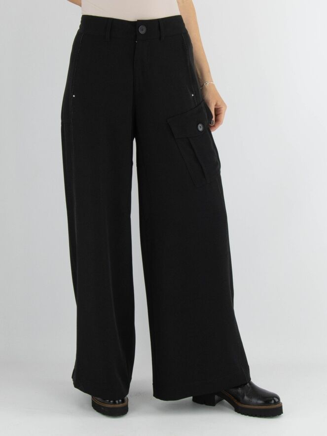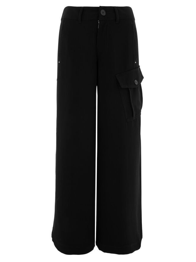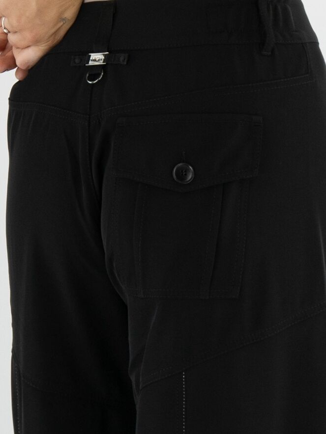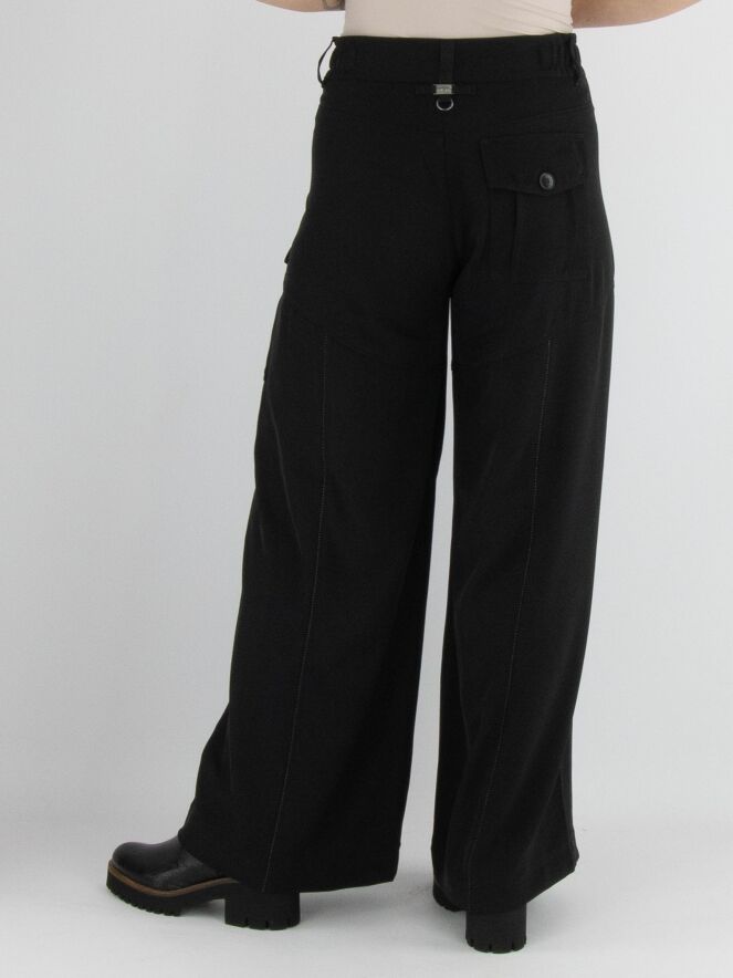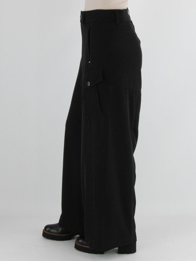 Trousers by High in black. The waistband features short elastic inserts at the sides. Below the hip, on the right thigh, there is a decorative pocket. The vertical seams are stitched with white thread. These trousers can be washed at 30 degrees.