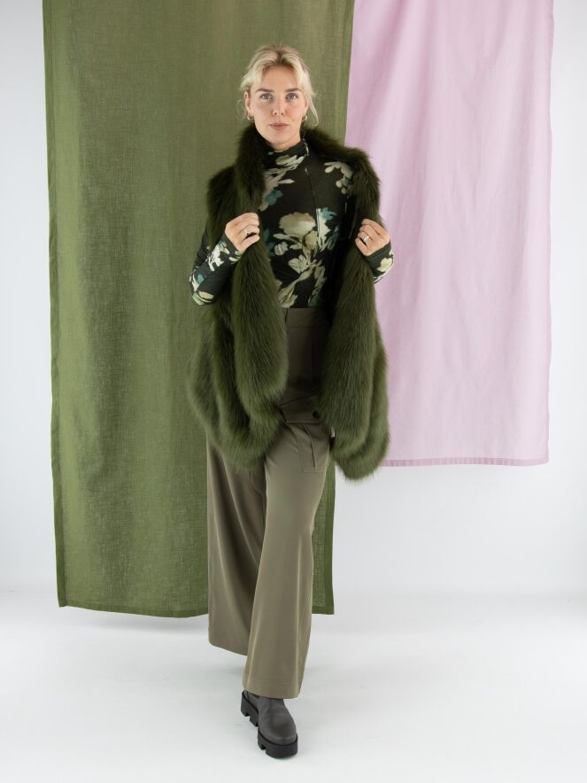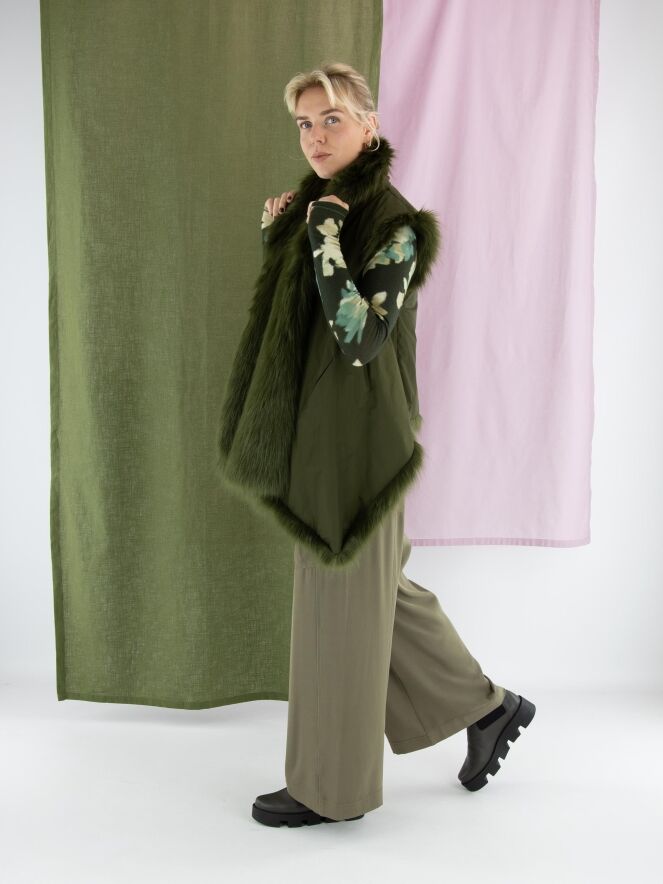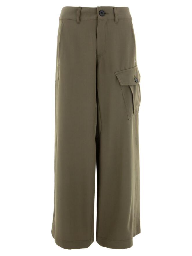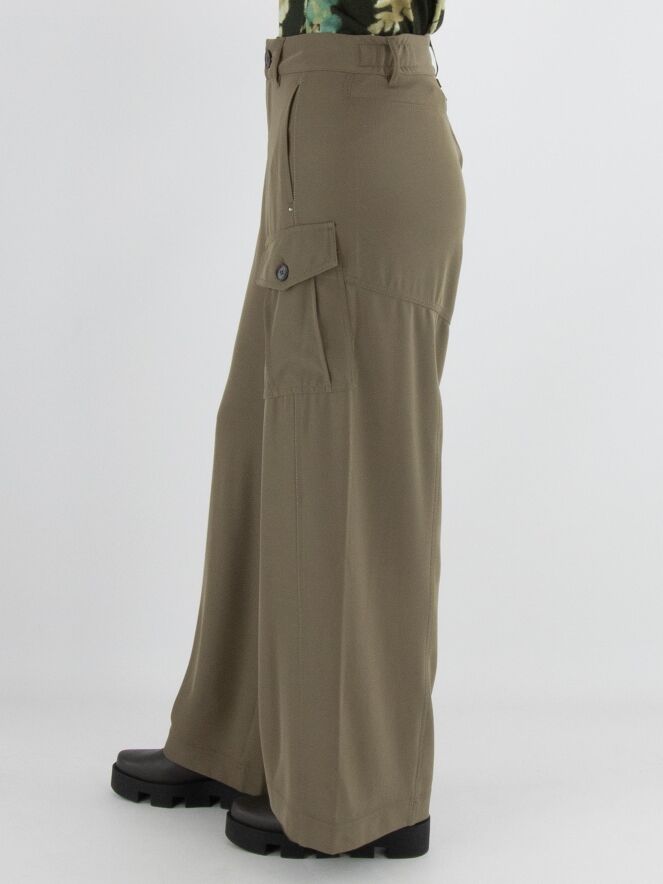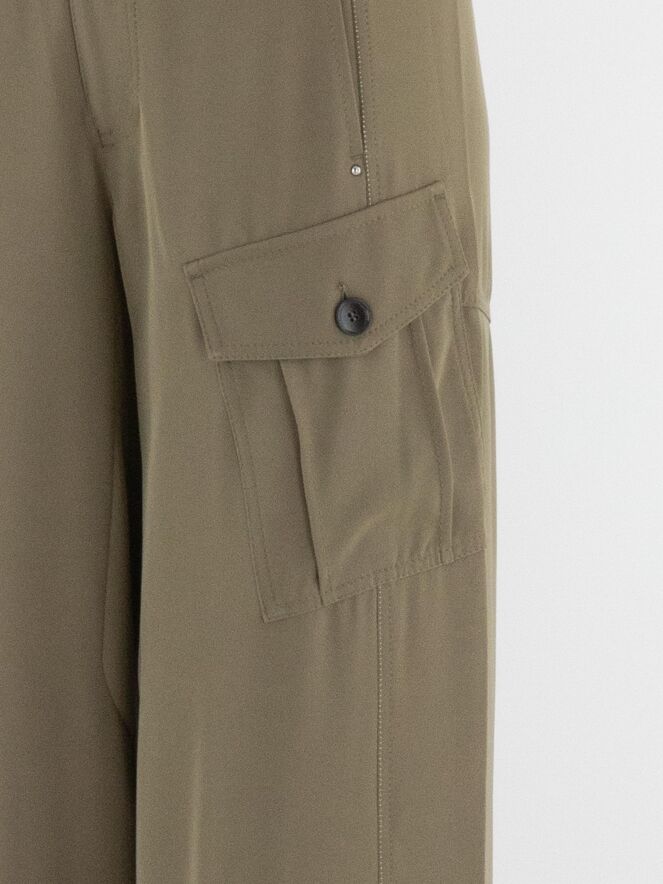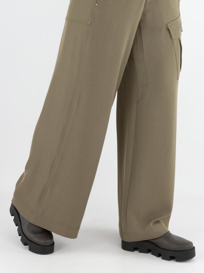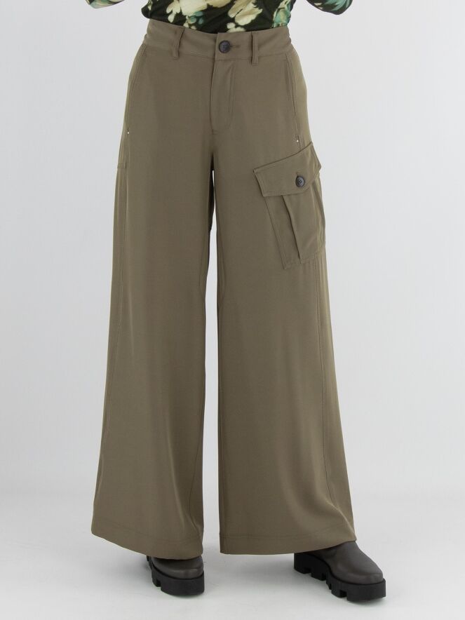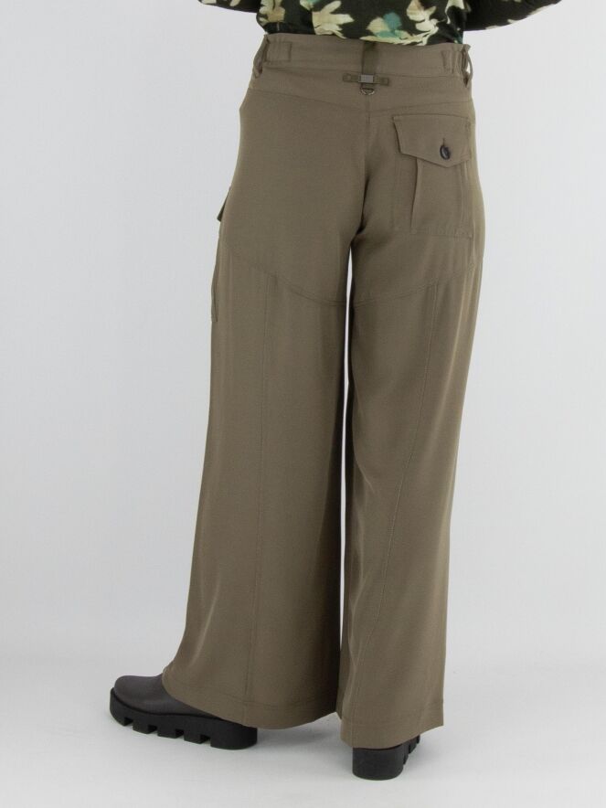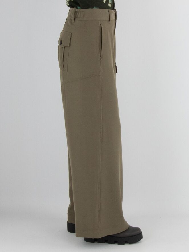 Trousers by High in olive green. The waistband features short elastic inserts at the sides. Below the hip, a decorative pocket is placed on the right thigh. The vertical seams are stitched with white thread. These trousers can be washed at 30 degrees.