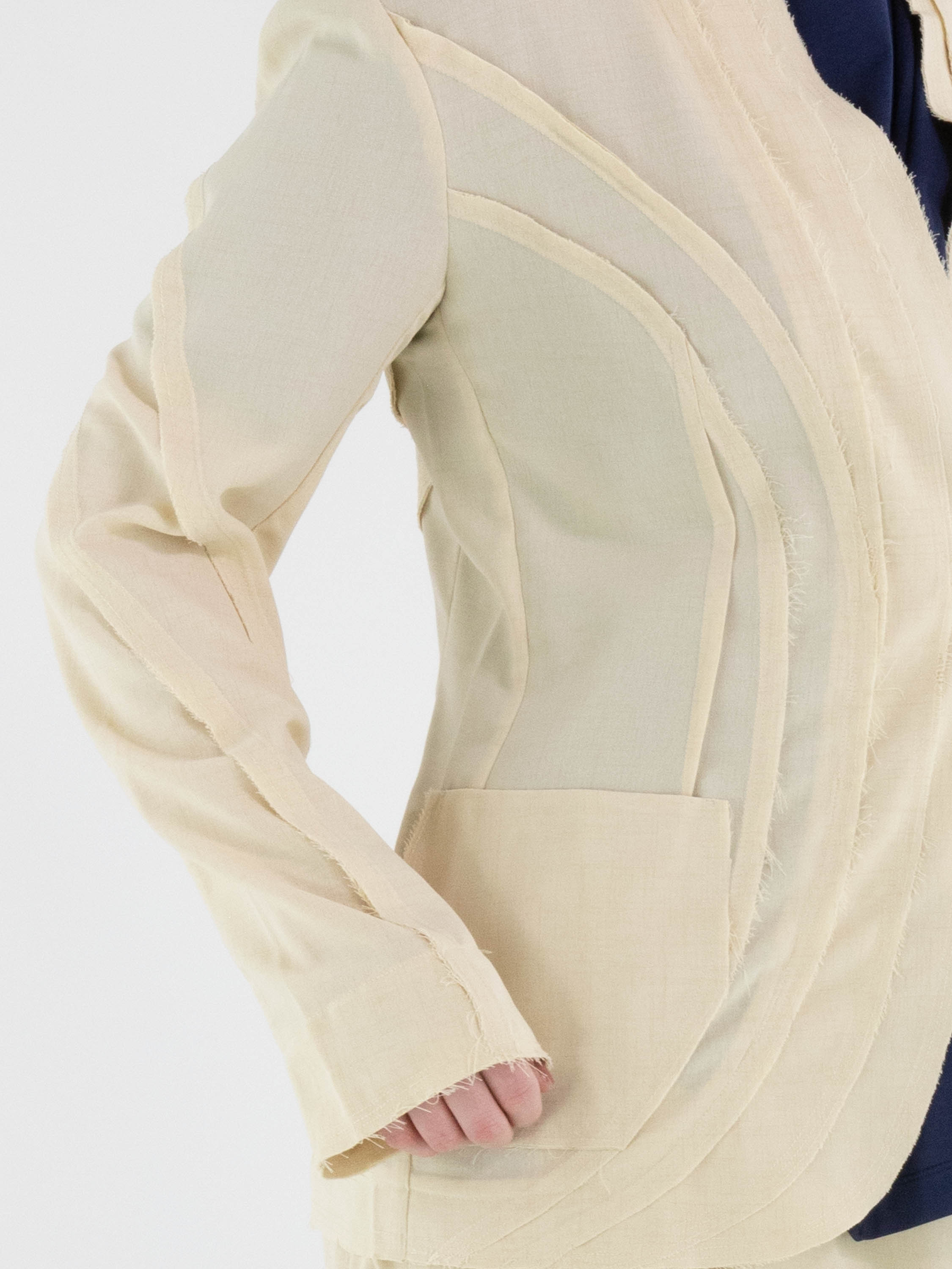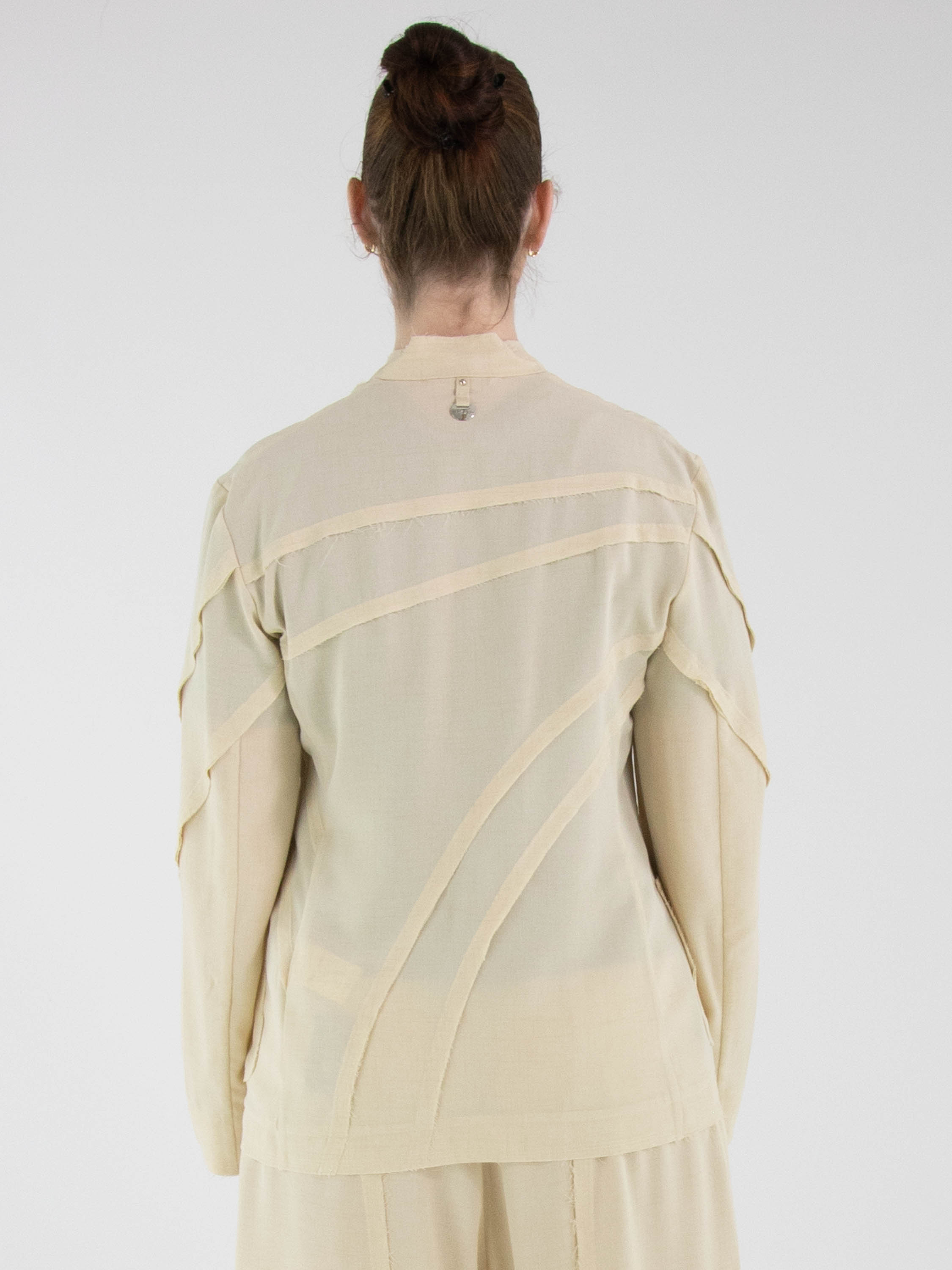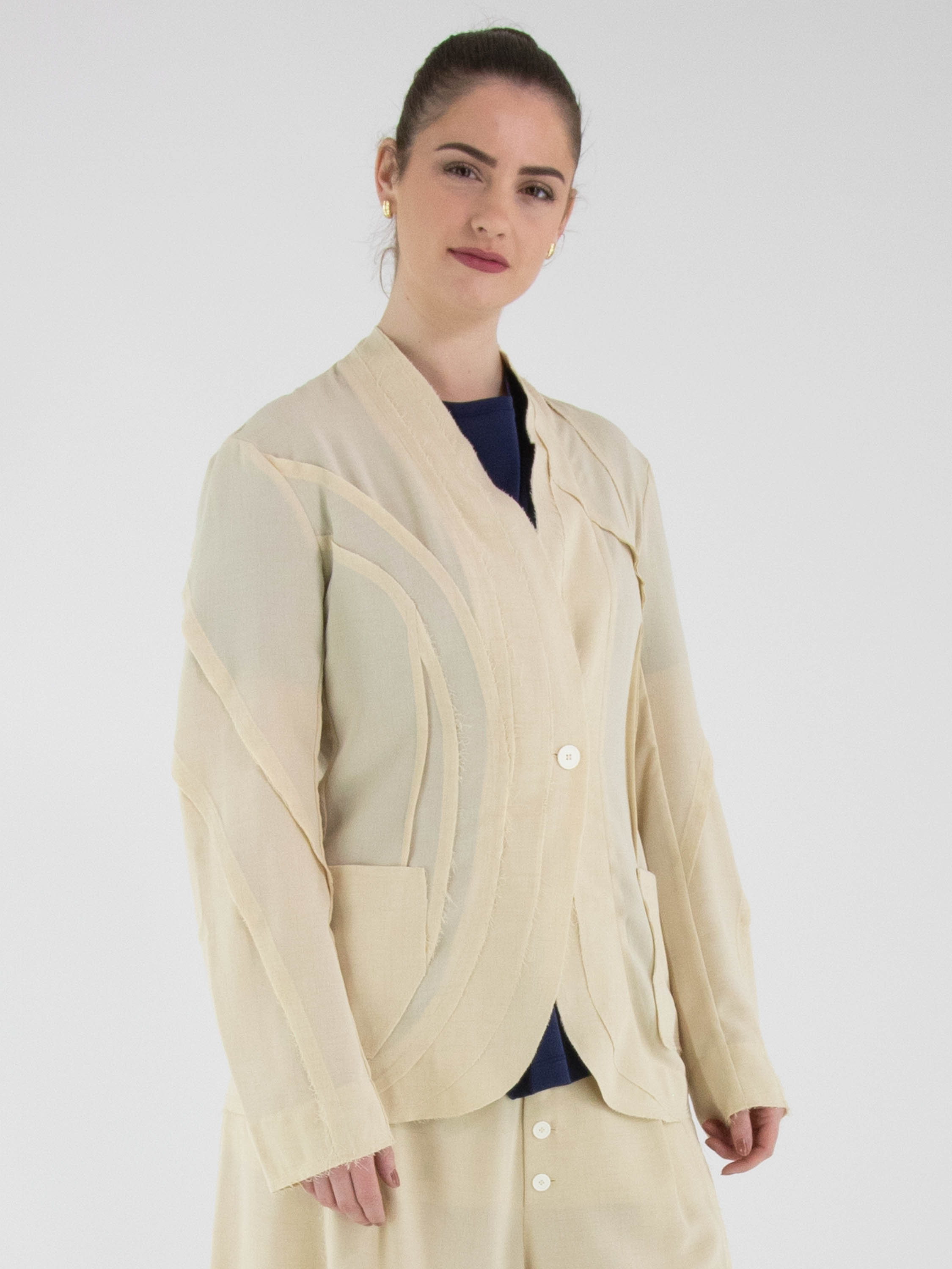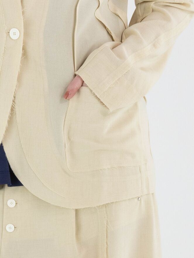 A lightly transparent blazer by High in a sand shade. The edges of the waist seams at both the front and back are delicately frayed. The blazer features a single-button closure. This blazer can be hand-washed.
