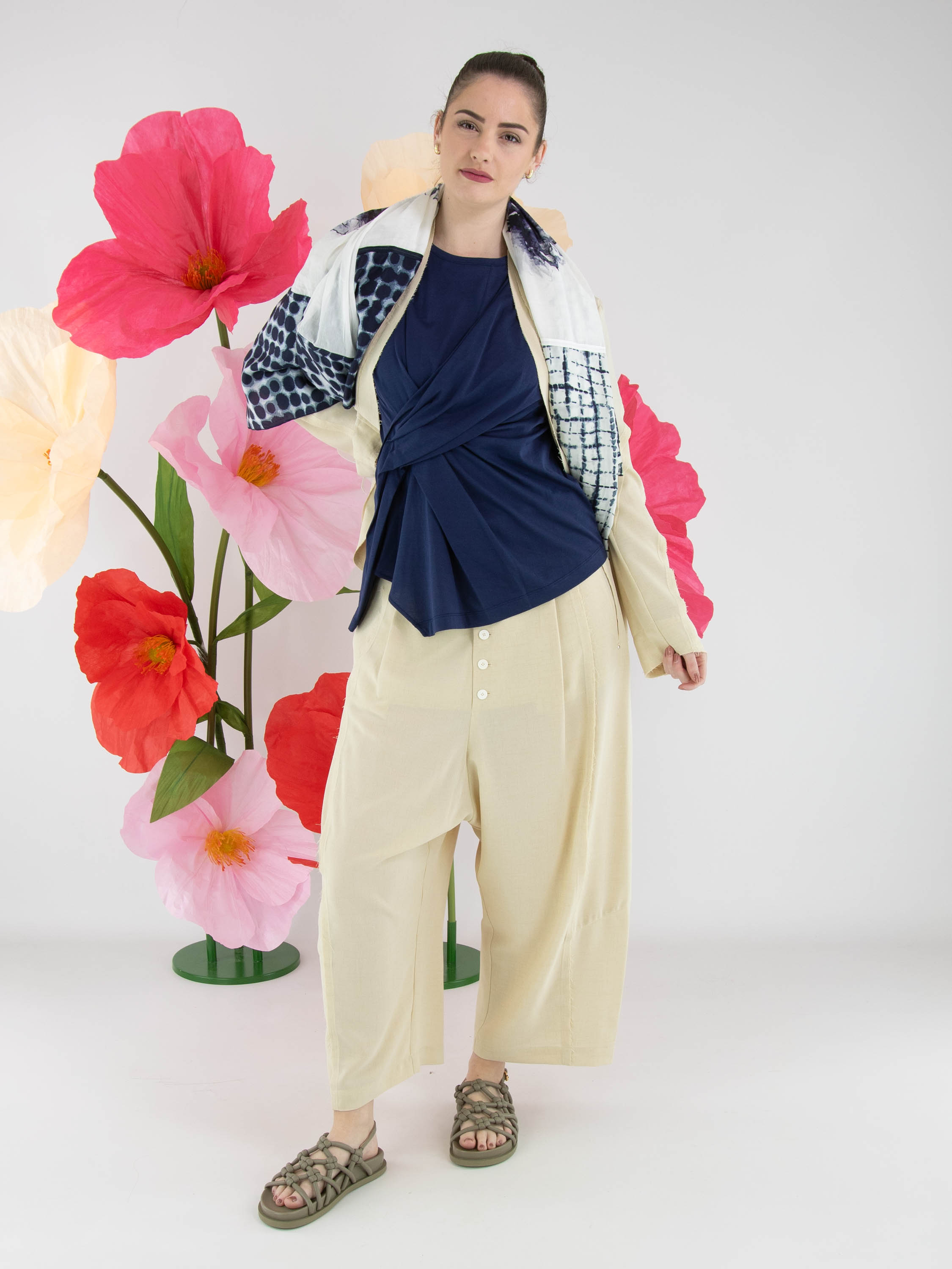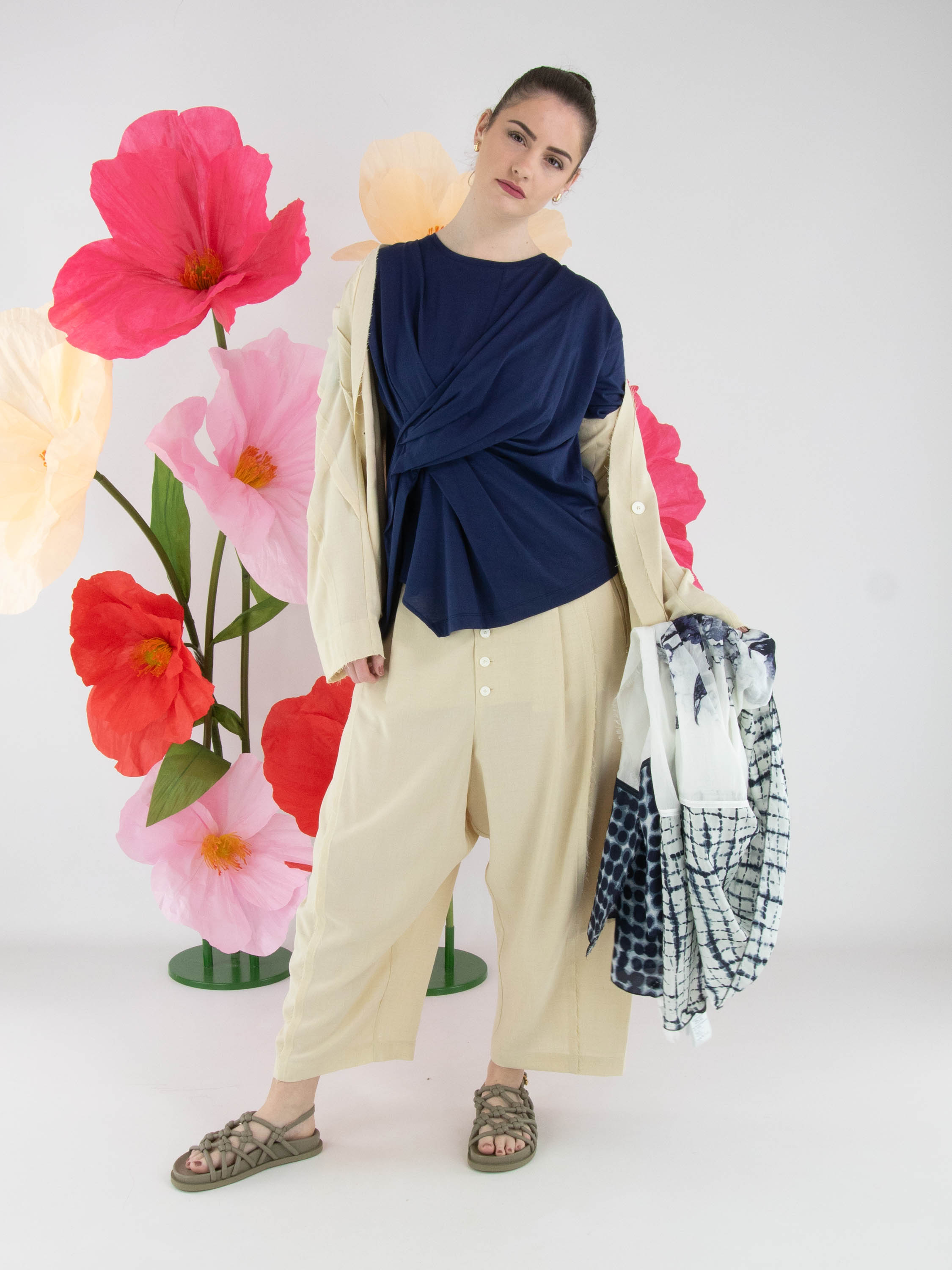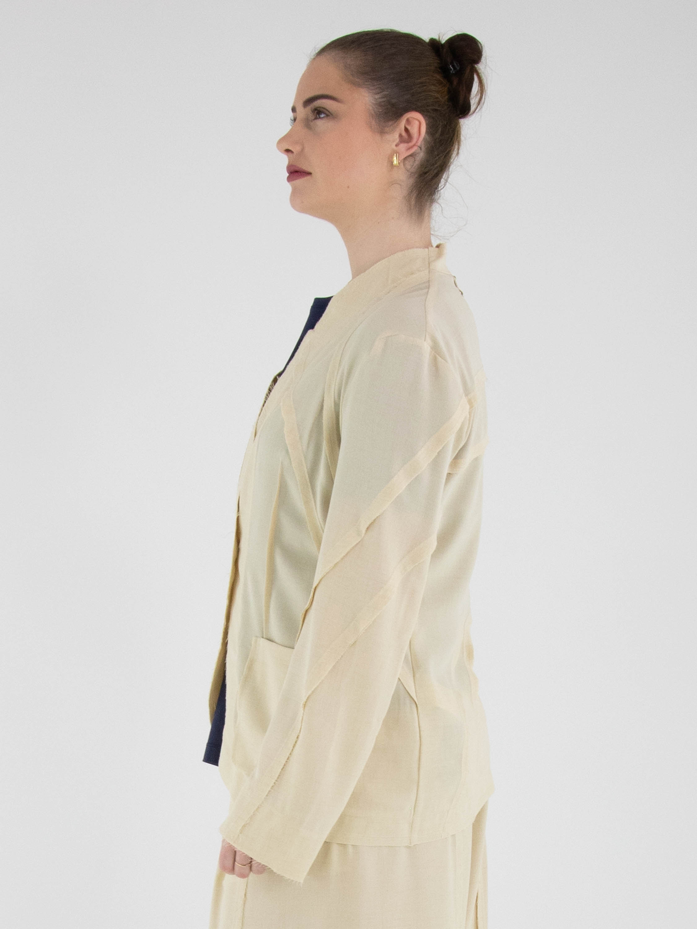 A lightly transparent blazer by High in a sand shade. The edges of the waist seams at both the front and back are delicately frayed. The blazer features a single-button closure. This blazer can be hand-washed.