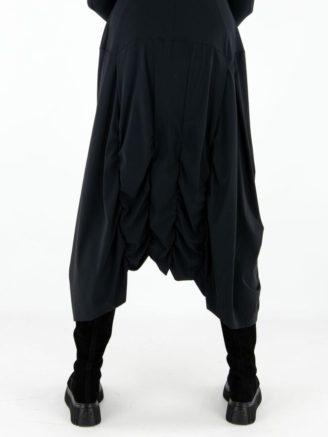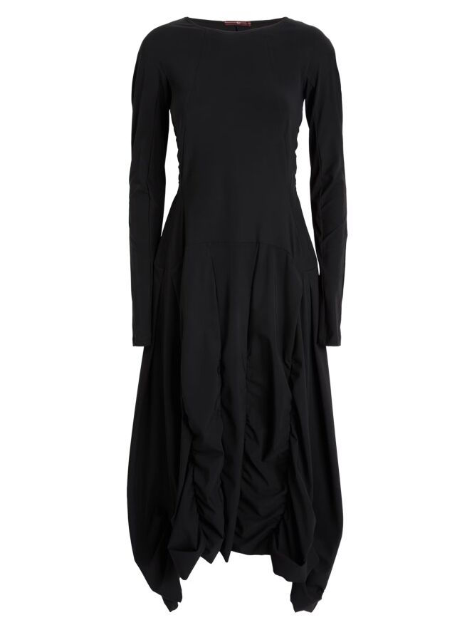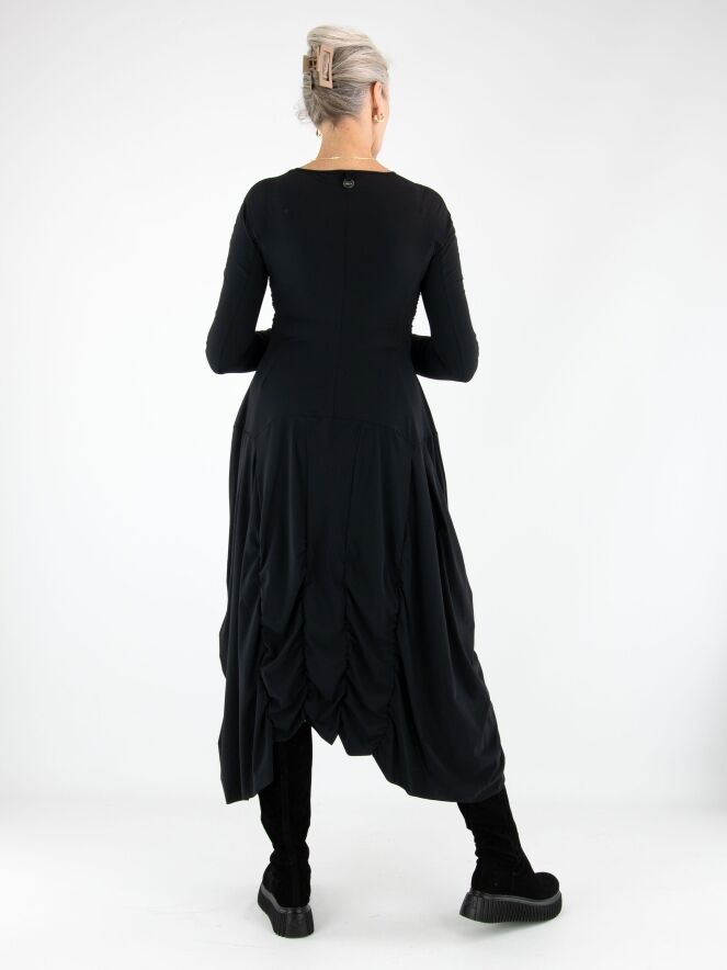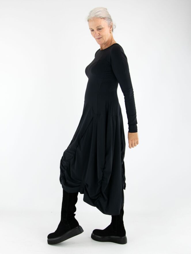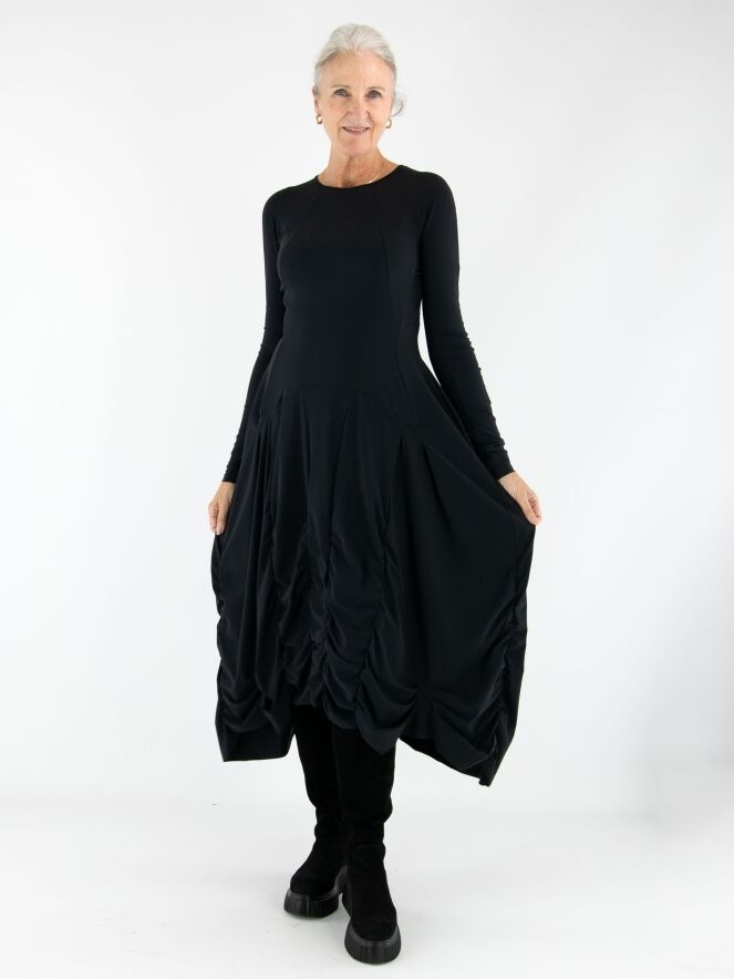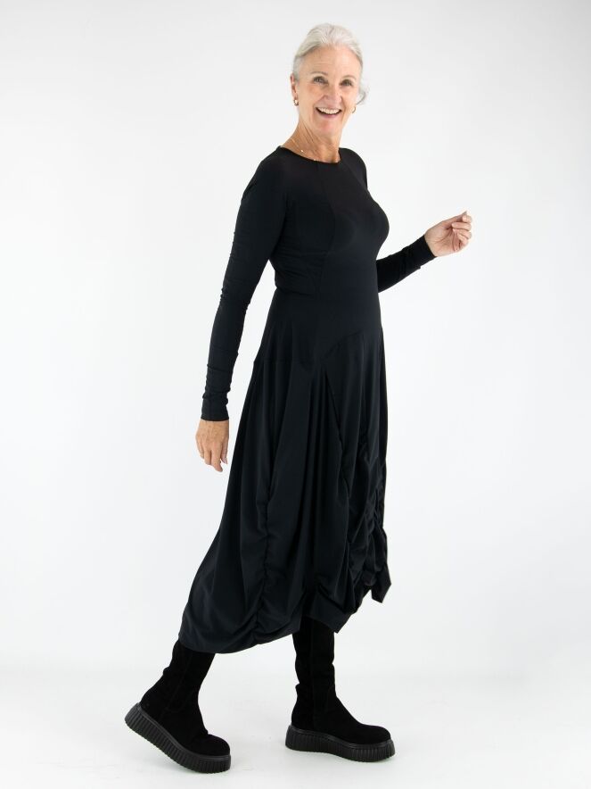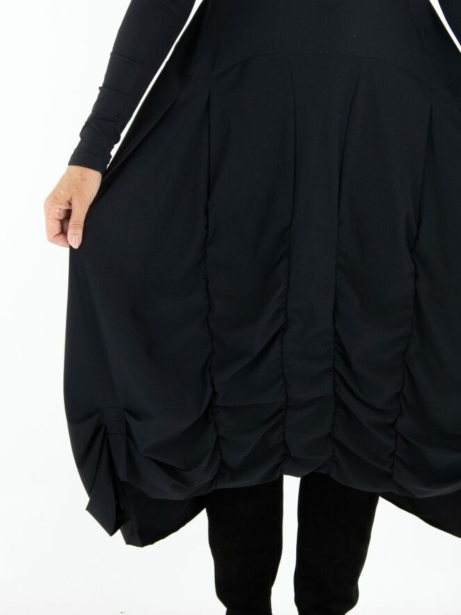 Een jurk van High in de kleur zwart. Het model heeft een ronde hals en lange mouwen. Vanuit de taille lopen aan de voor- en achterkant meerdere verticale stiknaden waarlangs de stof fijn is geplooid, wat een decoratief gesmokt effect creëert. Deze jurk kan op 30 graden worden gewassen.