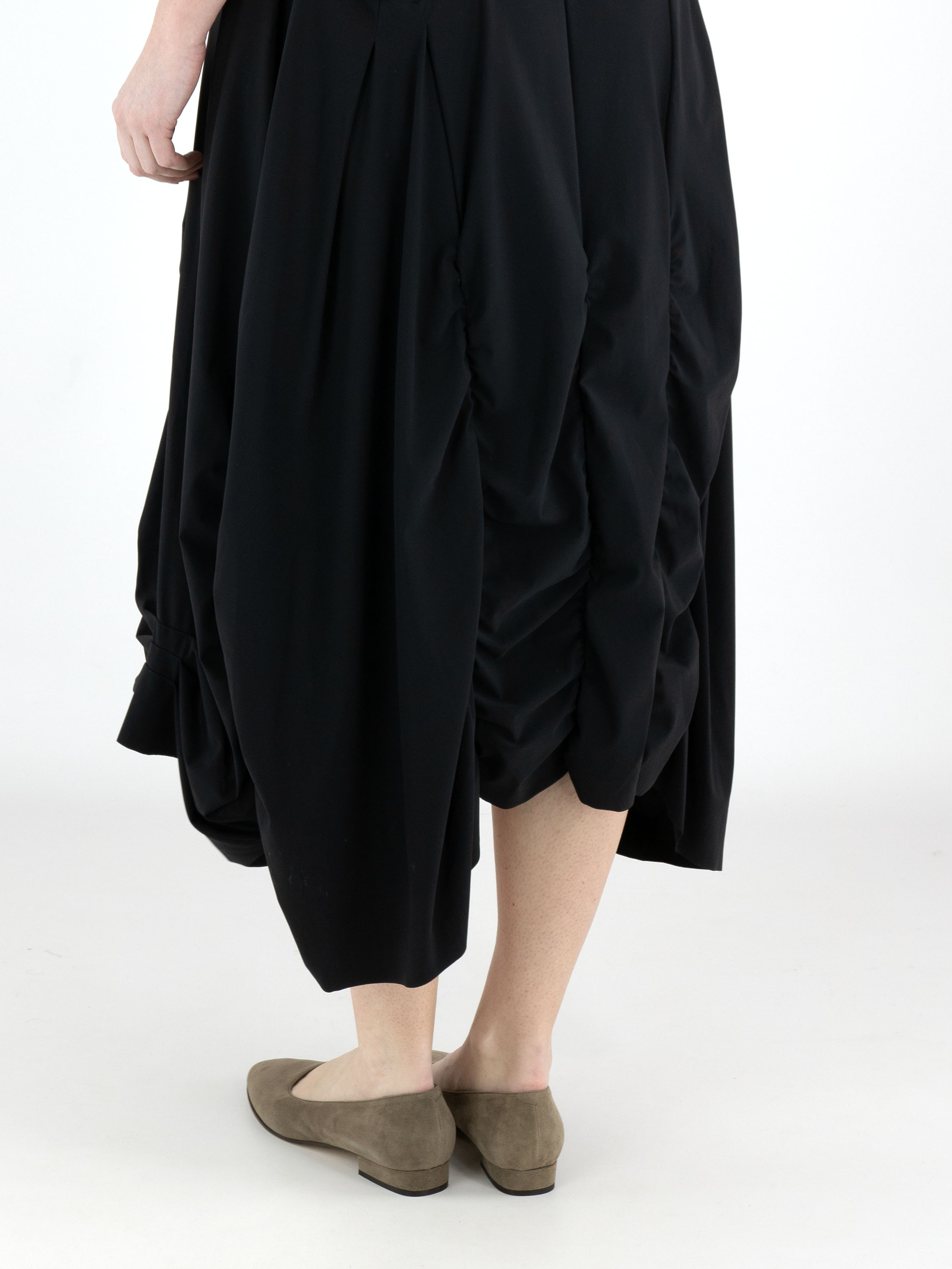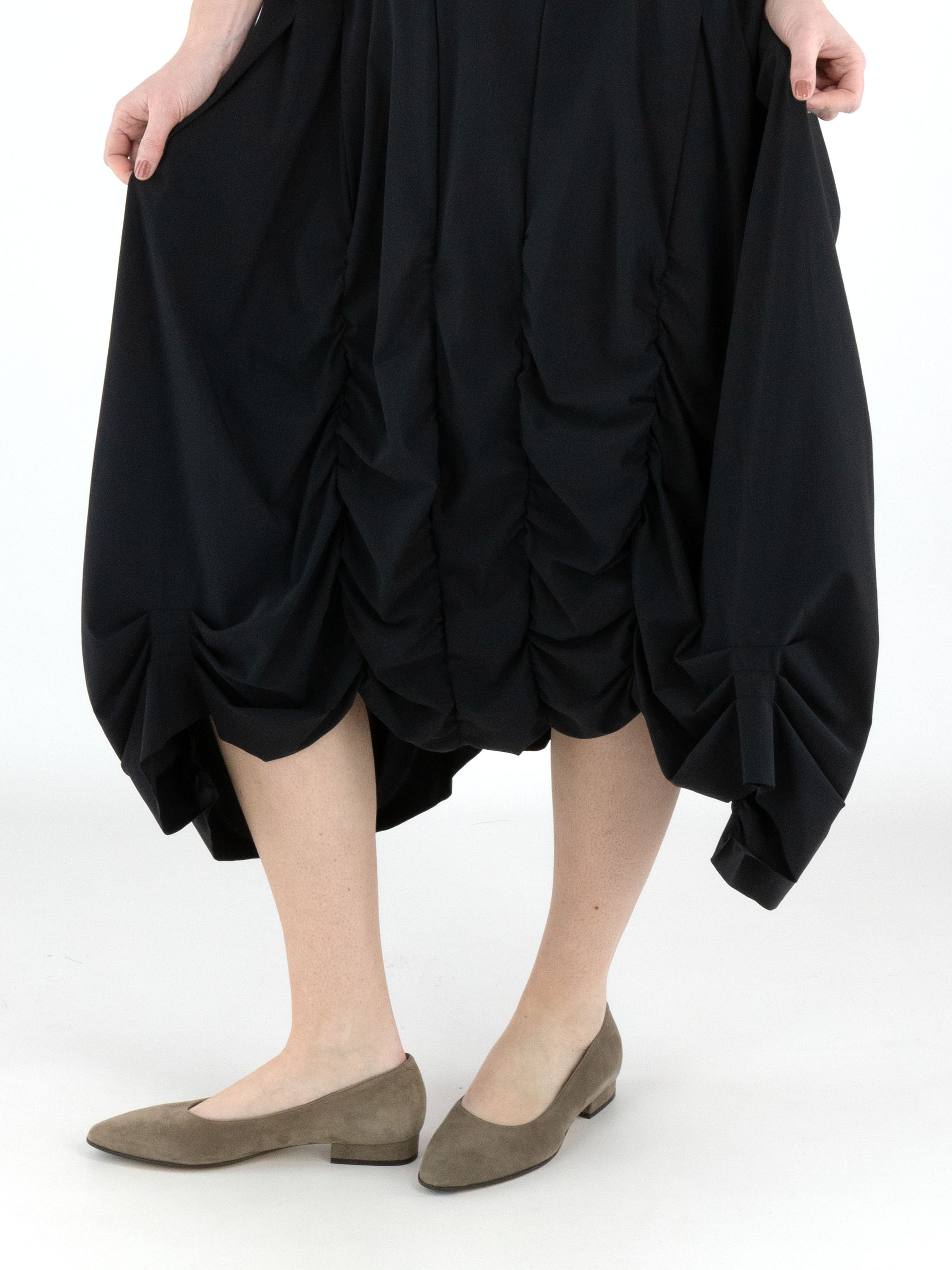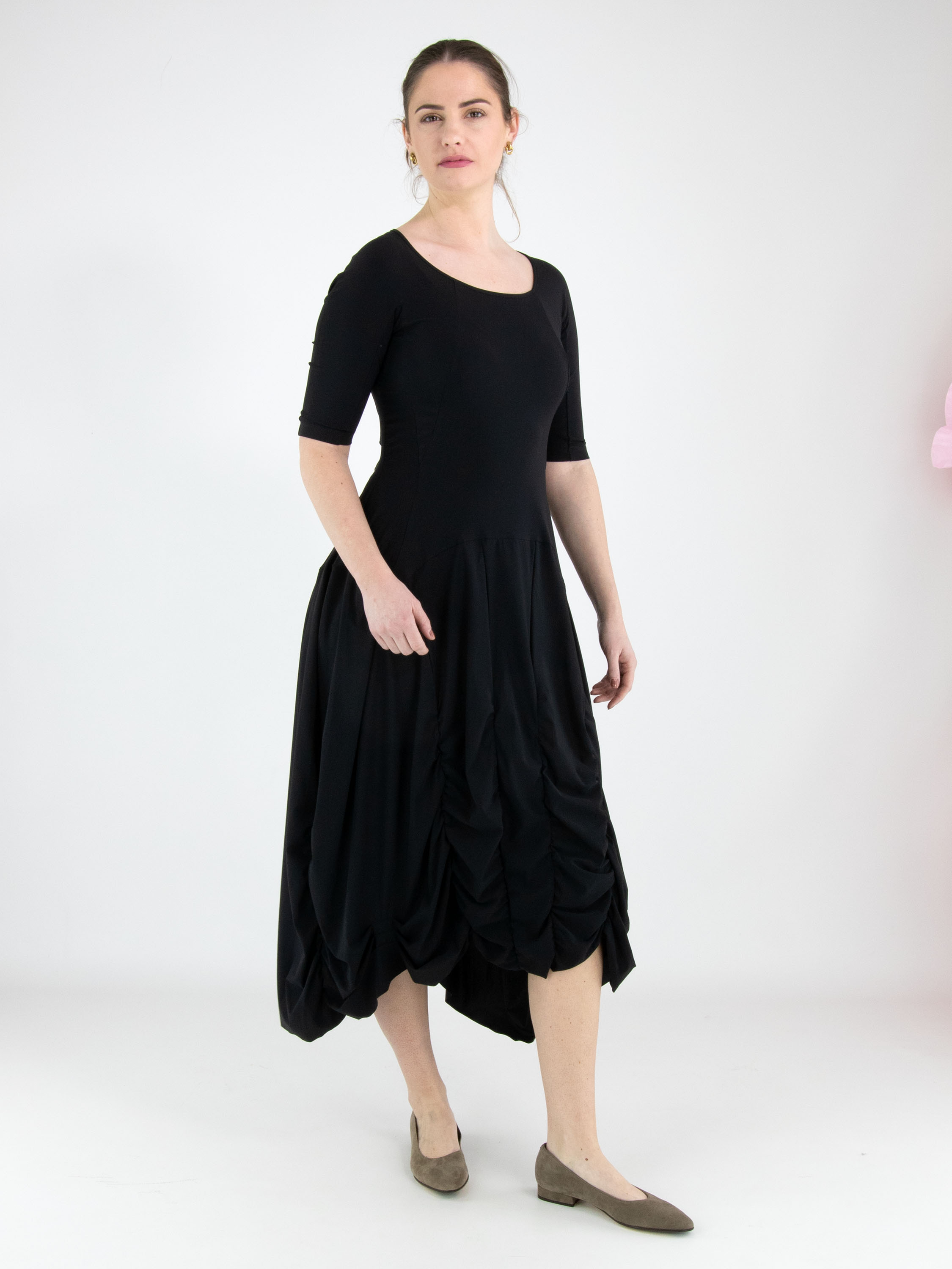 A dress from High Tech in black. The dress features a wide round neckline and short sleeves. From the waist, several vertical seams run downward, with pleated fabric creating a smocked effect. This dress can be washed at 30 degrees.