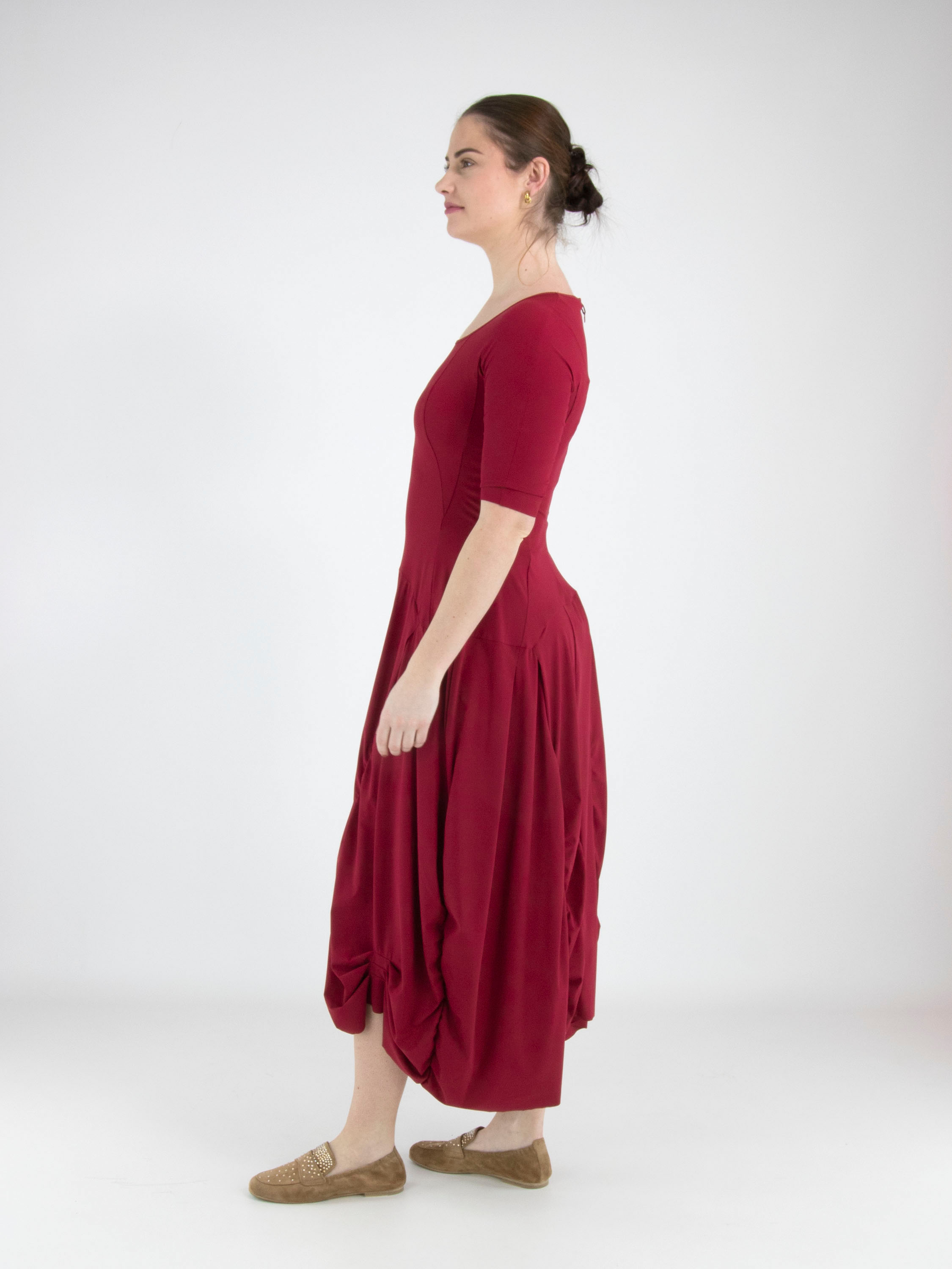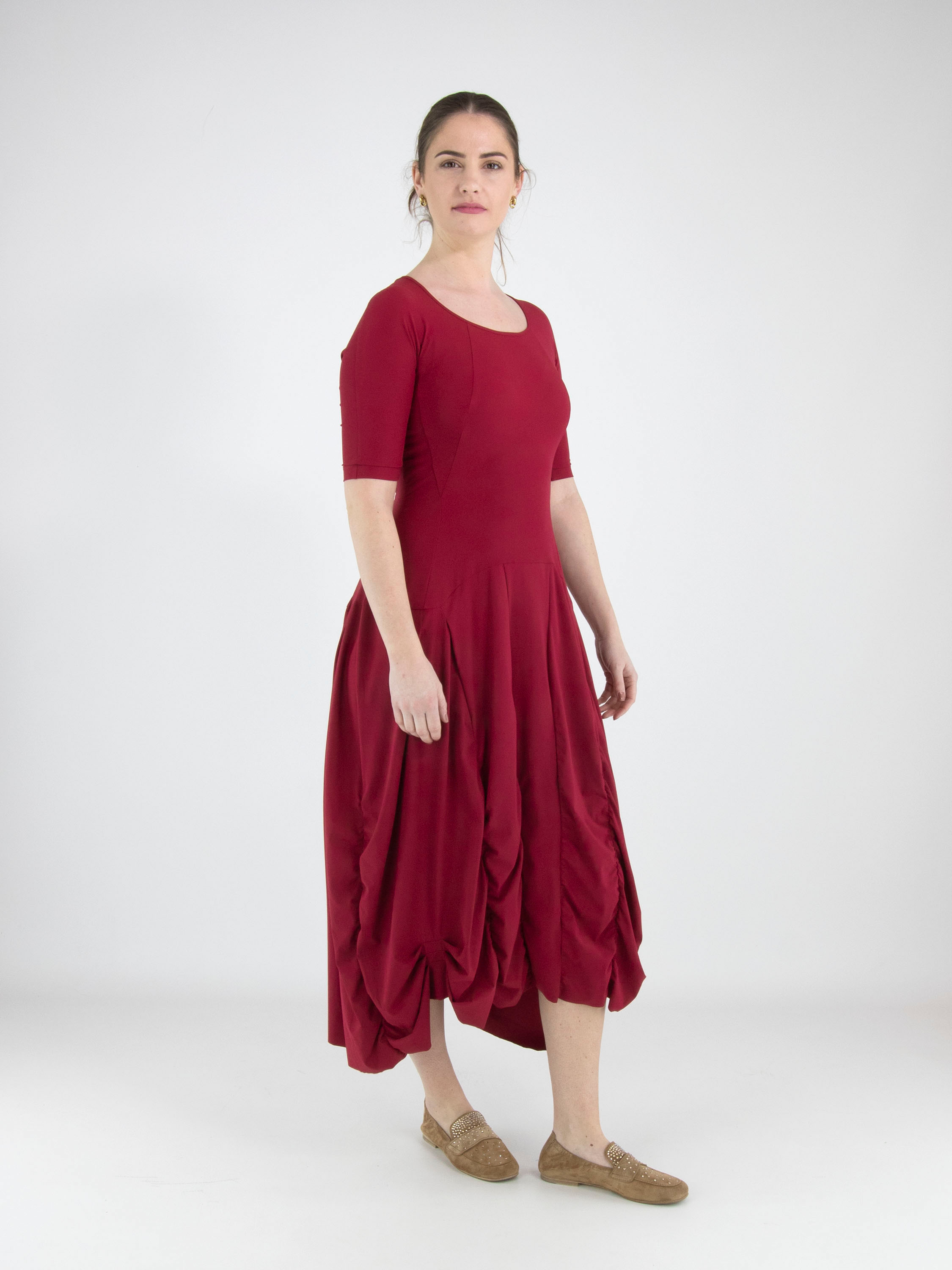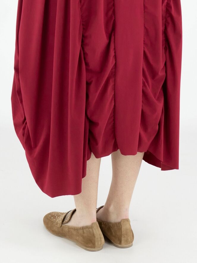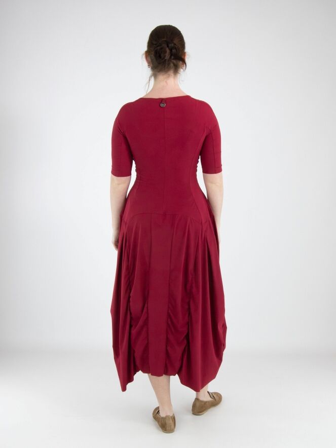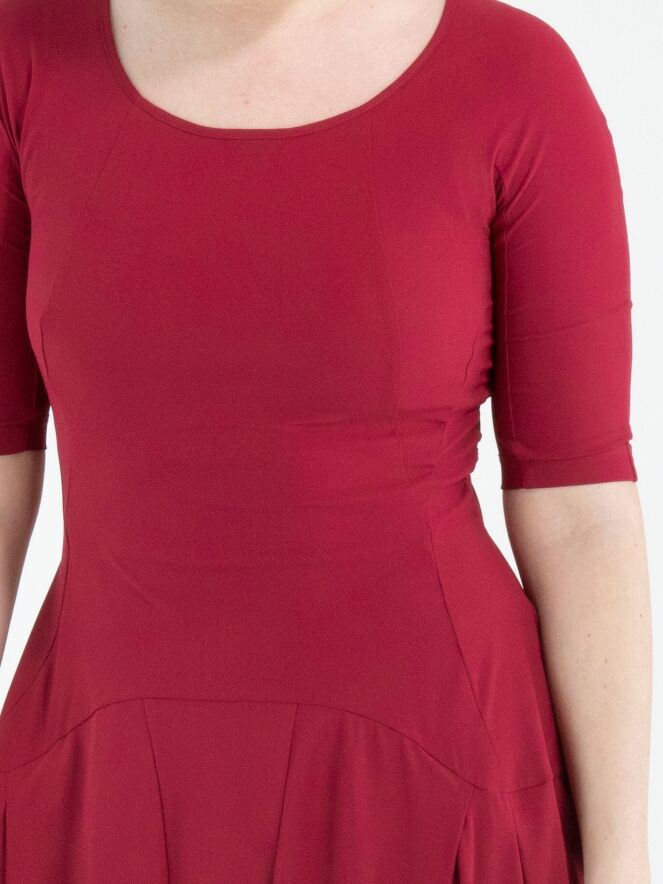 A dress from High Tech in a raspberry red colour. The dress has a wide round neckline and short sleeves. From the waist, several vertical seams run downward, along which the fabric is pleated, creating a smocked effect. This dress can be washed at 30 degrees.