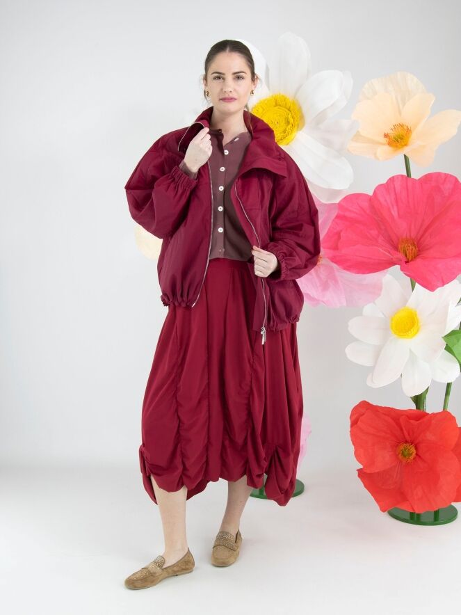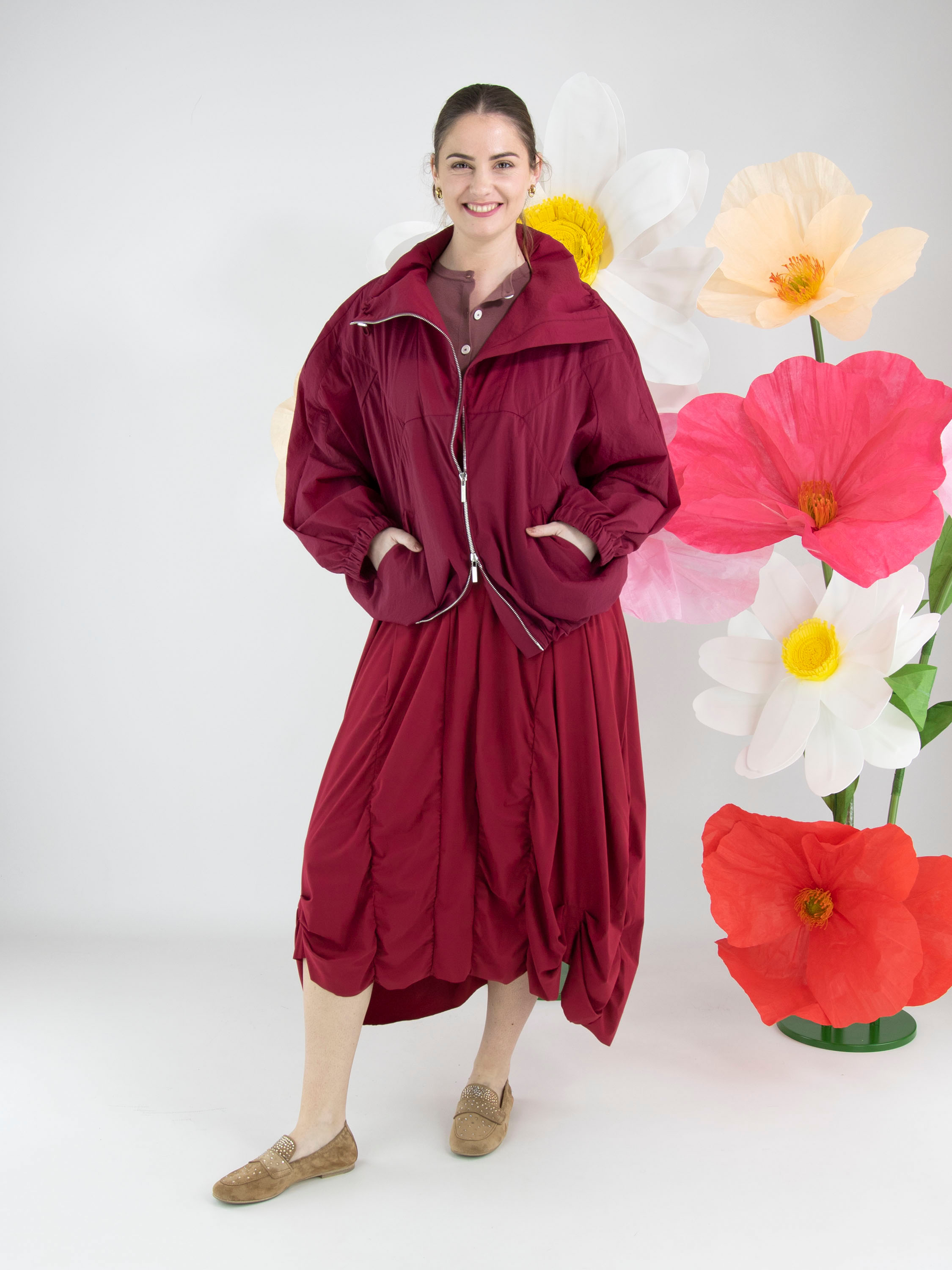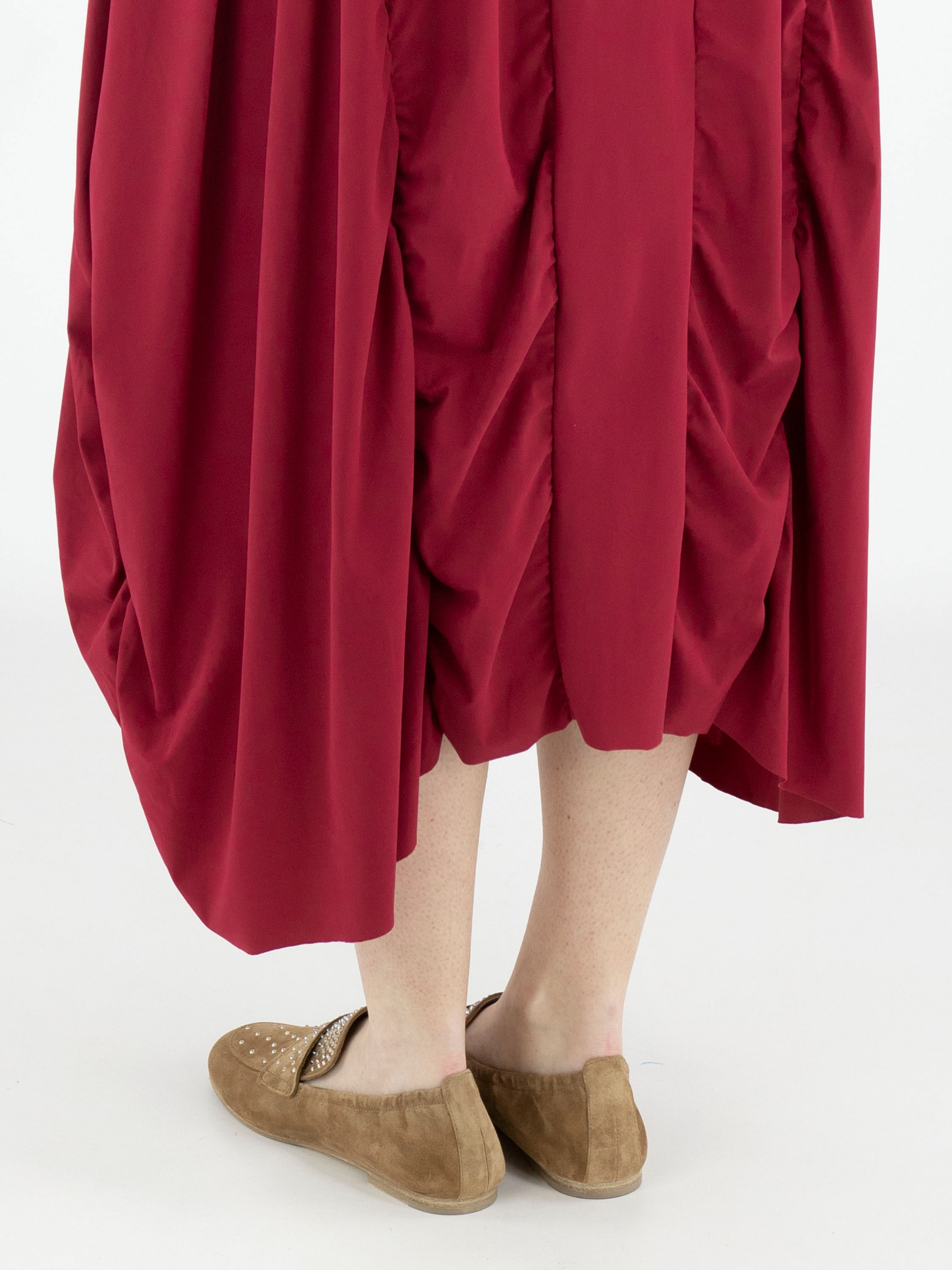 A dress from High Tech in a raspberry red colour. The dress has a wide round neckline and short sleeves. From the waist, several vertical seams run downward, along which the fabric is pleated, creating a smocked effect. This dress can be washed at 30 degrees.