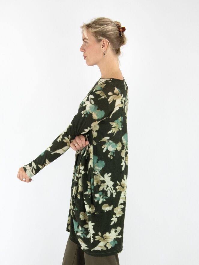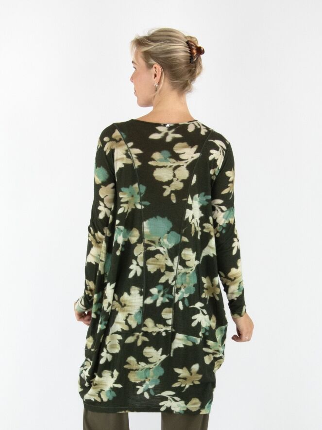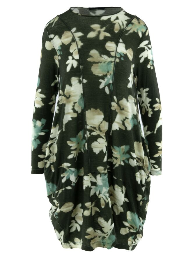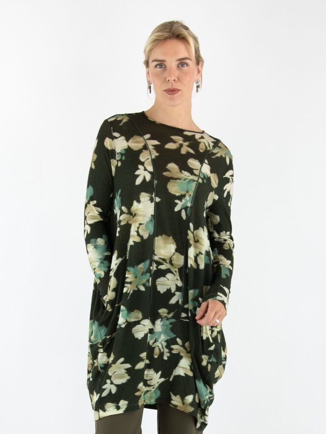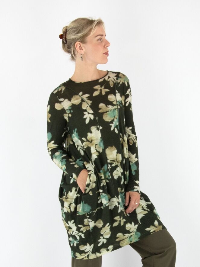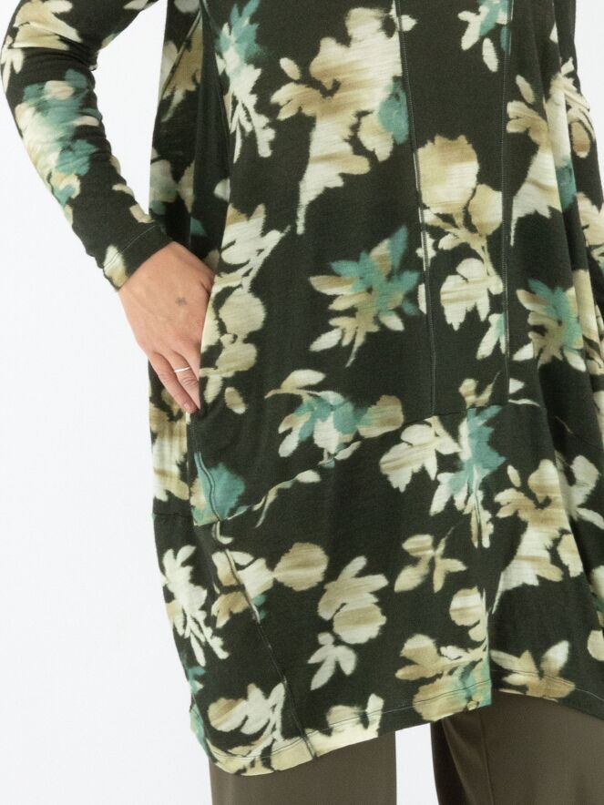 A tunic by High featuring a graphic floral print in shades of beige, turquoise and off-white on an olive green background. The tunic has a round neckline, long sleeves and tapers from the hip down. This tunic should be hand-washed.