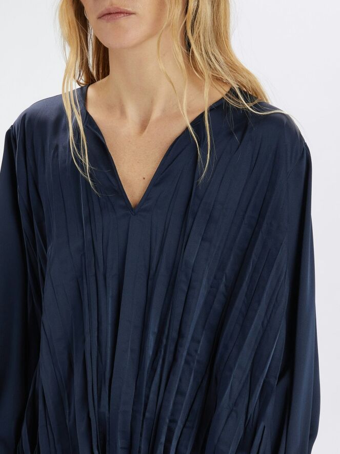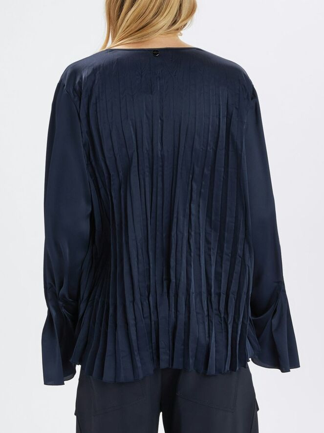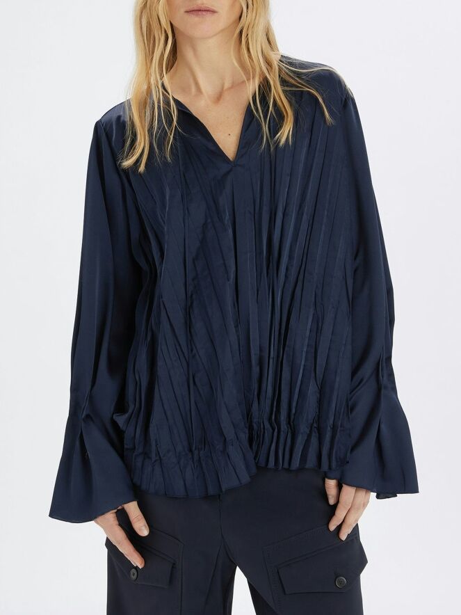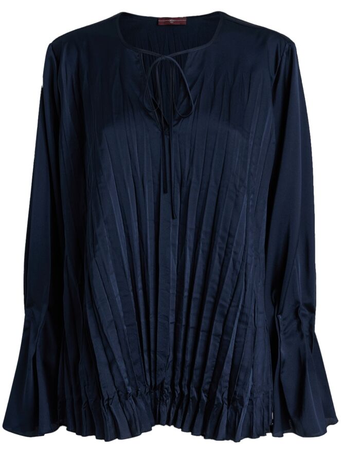 A blouse by High in navy blue. The blouse features a fine pleated fabric with a V-neckline in the centre and two narrow cords extending from the round neckline. The sleeves are made of smooth fabric and flare out at the cuffs. This blouse can be washed at 30 degrees.