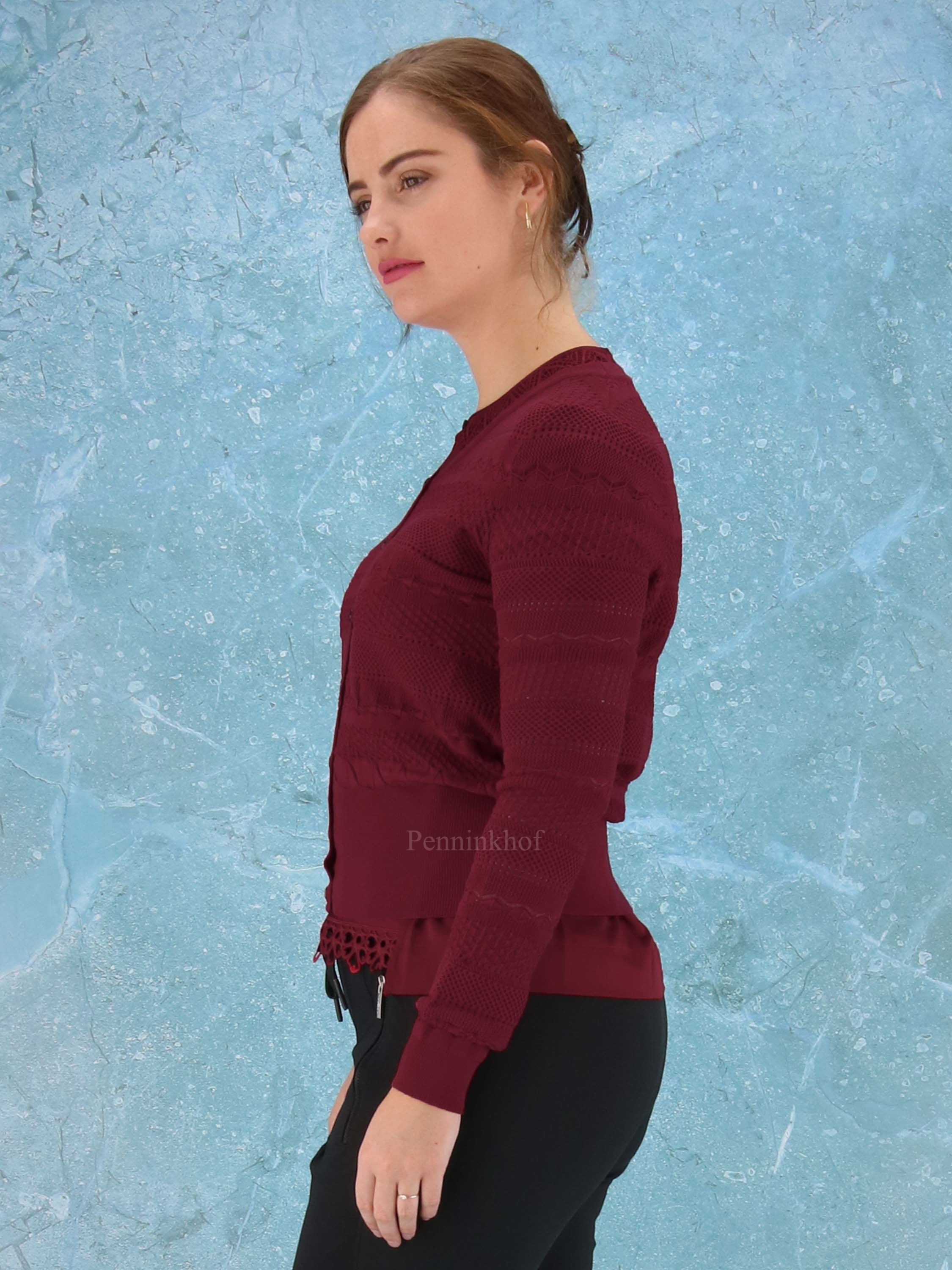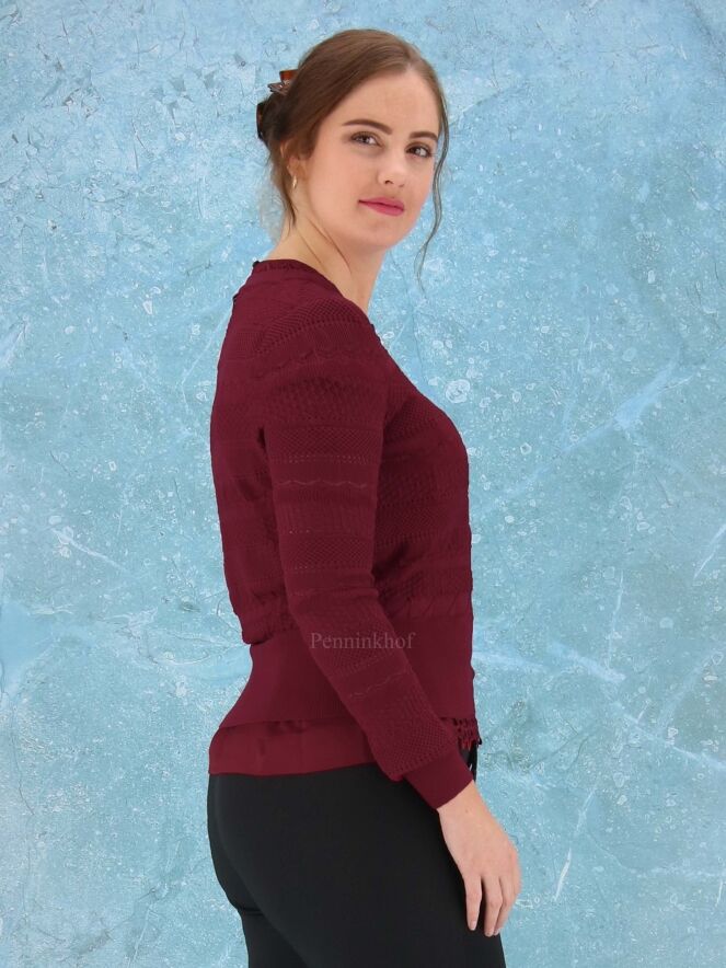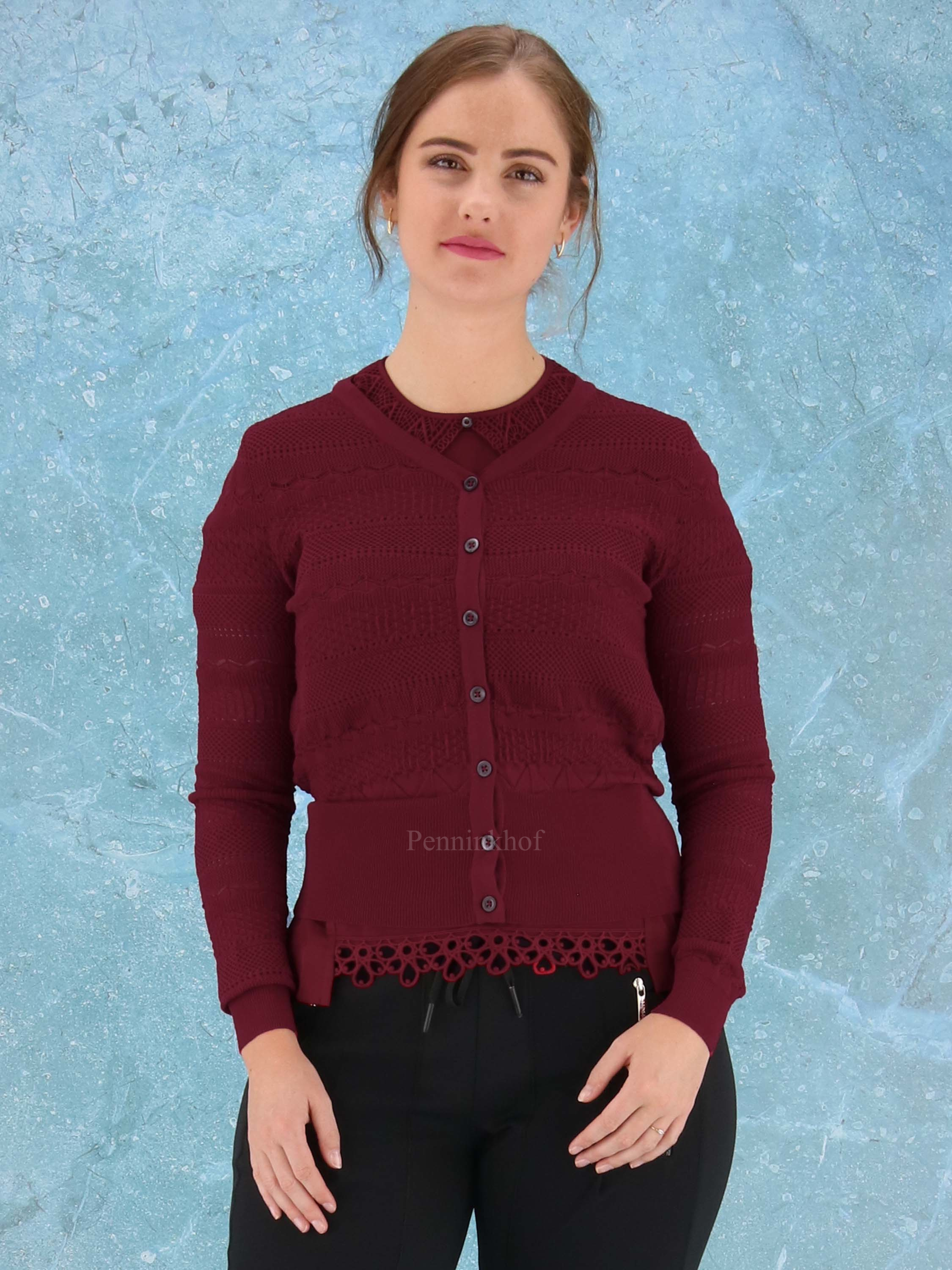 An open knitted cardigan from High in different lace patterns in the color burgundy red. The cardigan has a wide, finely ribbed tricot board at the bottom and at the end of the sleeves. This vest can be washed by hand.