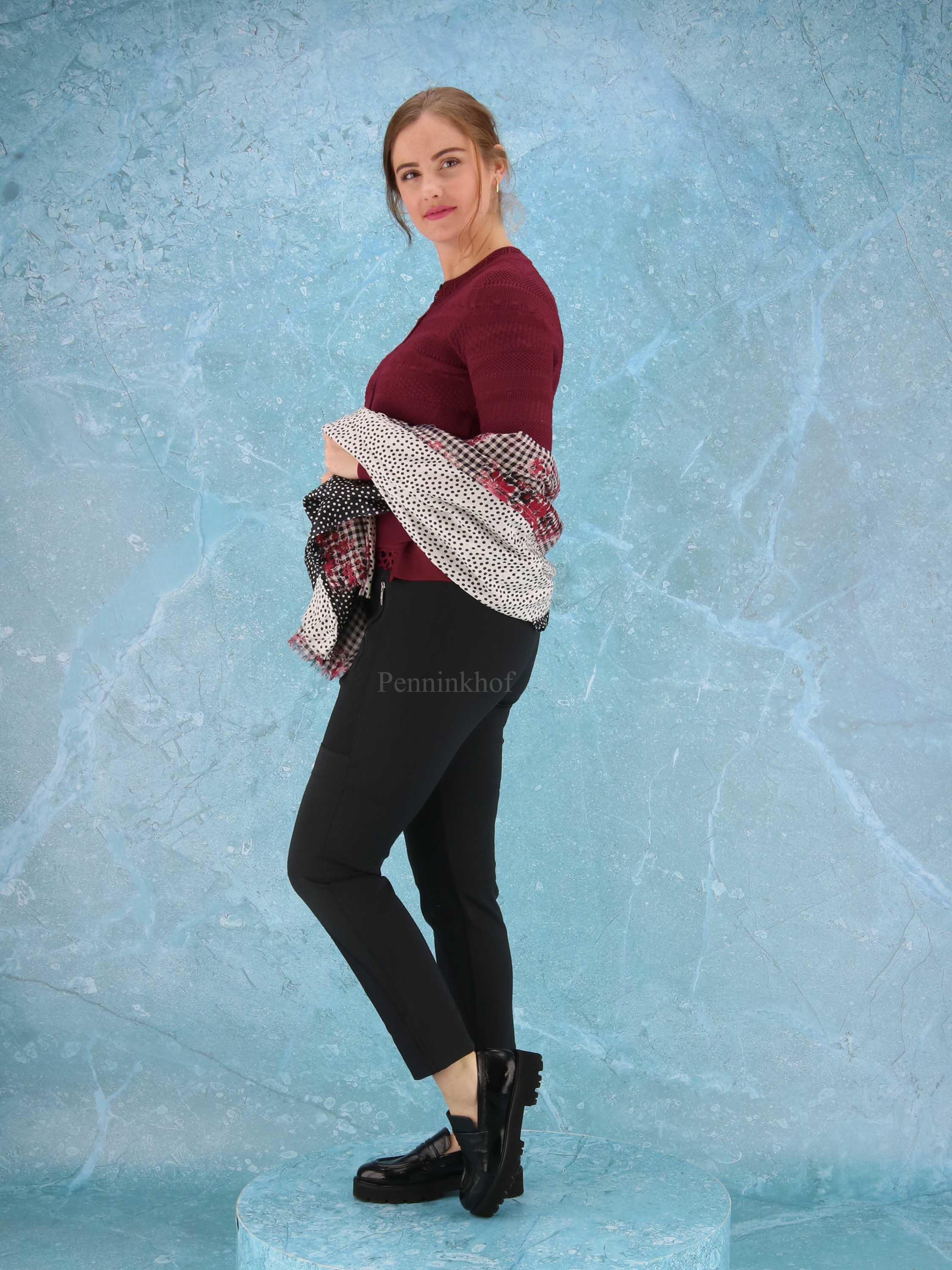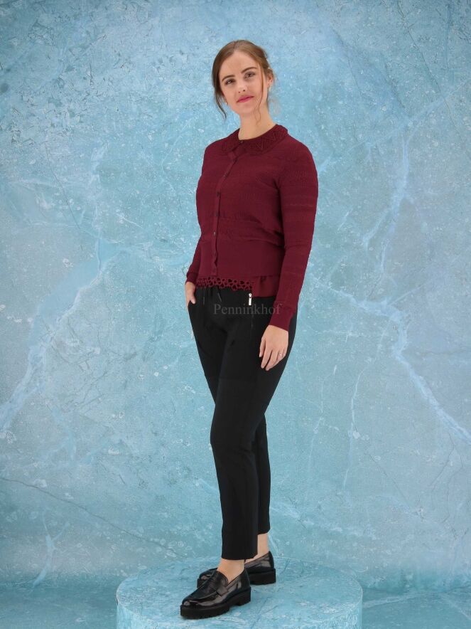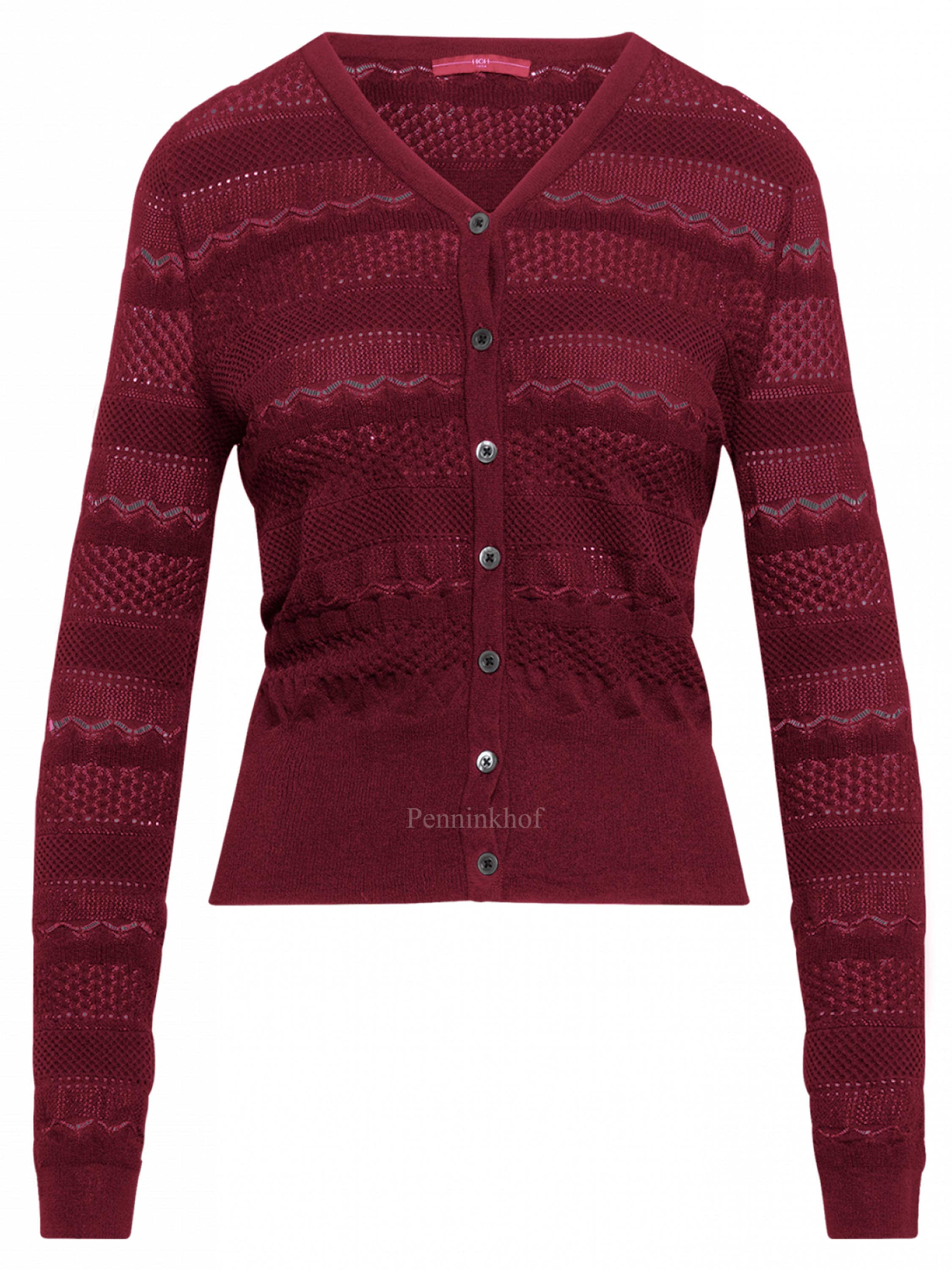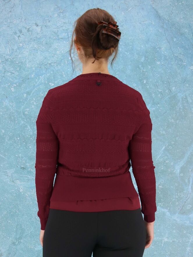 An open knitted cardigan from High in different lace patterns in the color burgundy red. The cardigan has a wide, finely ribbed tricot board at the bottom and at the end of the sleeves. This vest can be washed by hand.