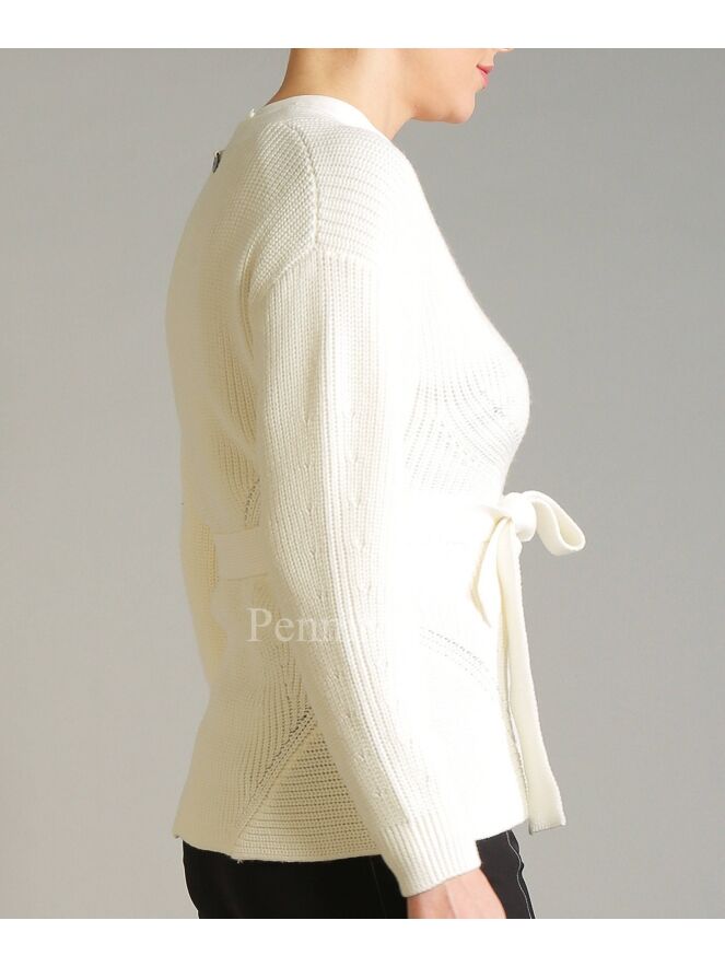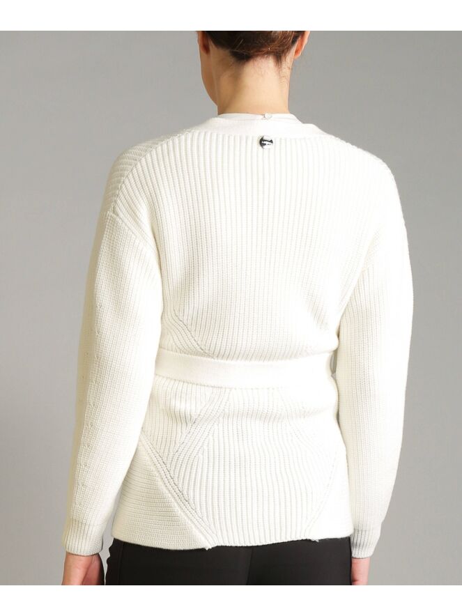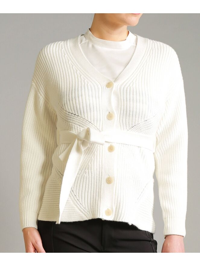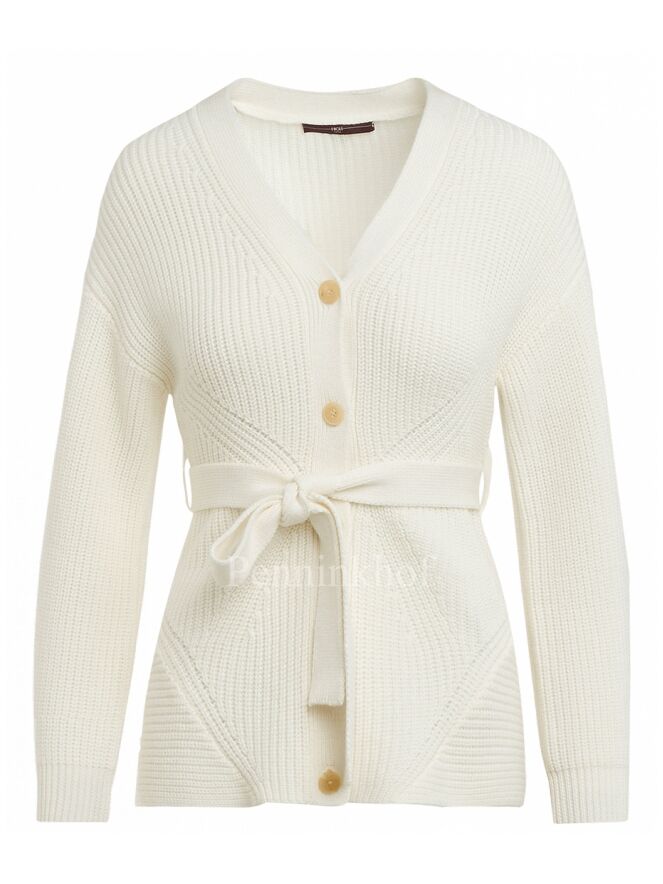 A cardigan from High in the color creamy white. The cardigan has a V - Neck with a 4 button closure. At the waist is a knitted belt. This vest can be washed by hand.
