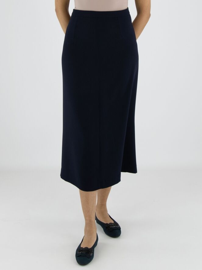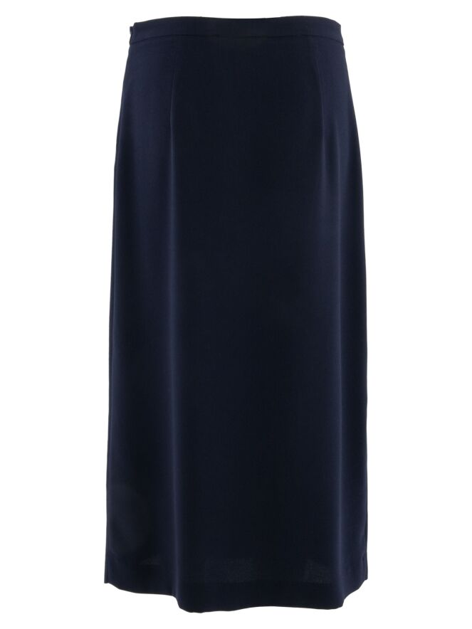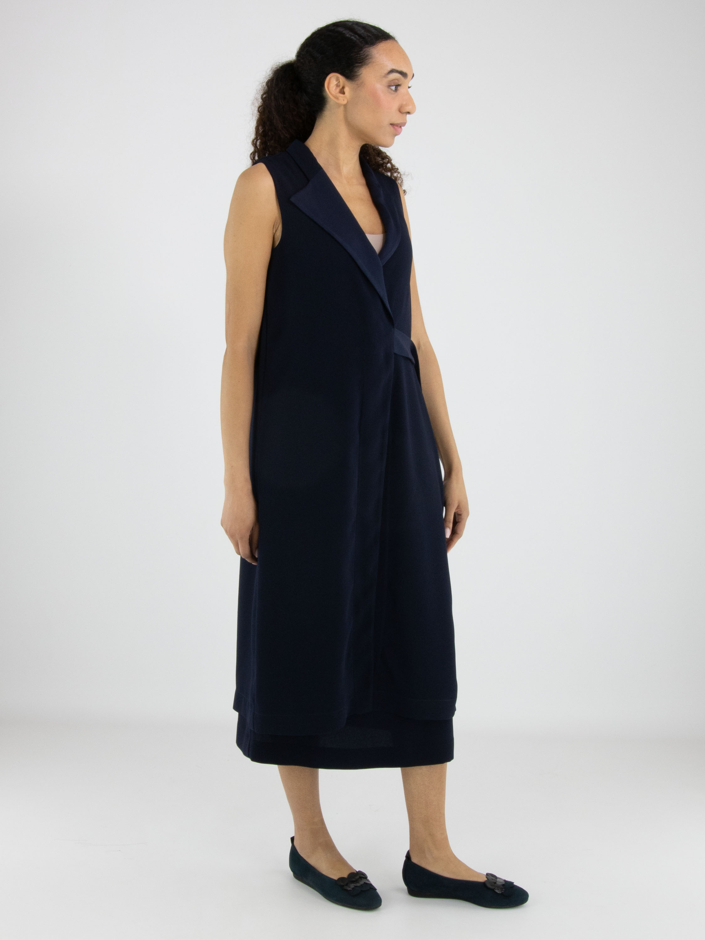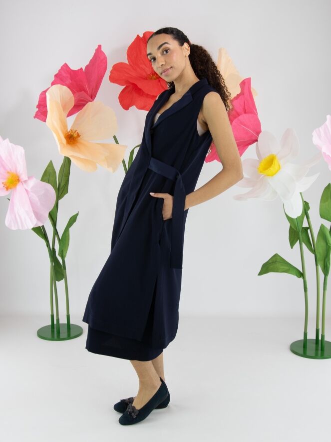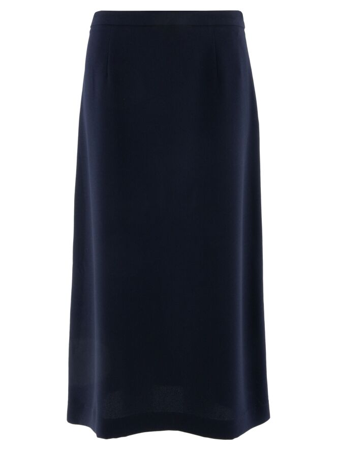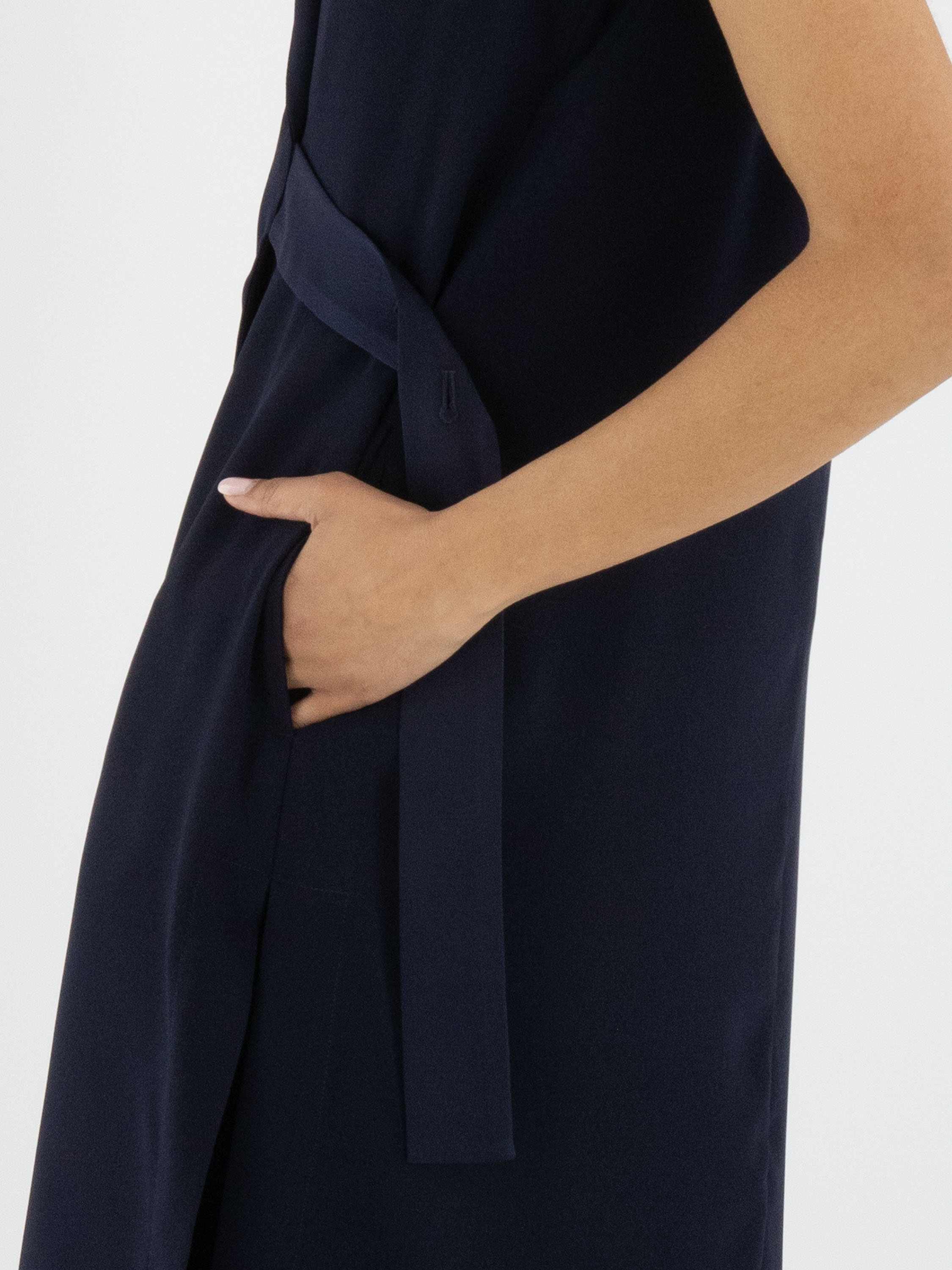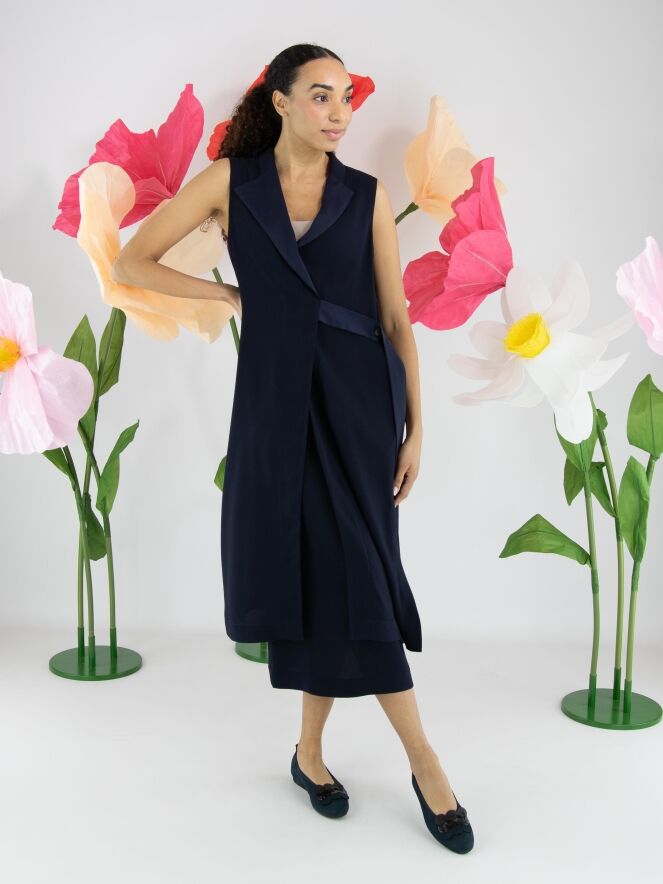 Two-piece set by High consisting of a wrap tunic and a skirt in an elegant navy blue shade. The tunic fastens with two concealed buttons and features a ribbon that can be tied at the left side. Designed with a V-neckline and deep side slits up to the waist, it creates a fluid and contemporary silhouette. Side pockets are placed at waist level. The skirt has a straight cut and a side zip closure. This set should be hand-washed.