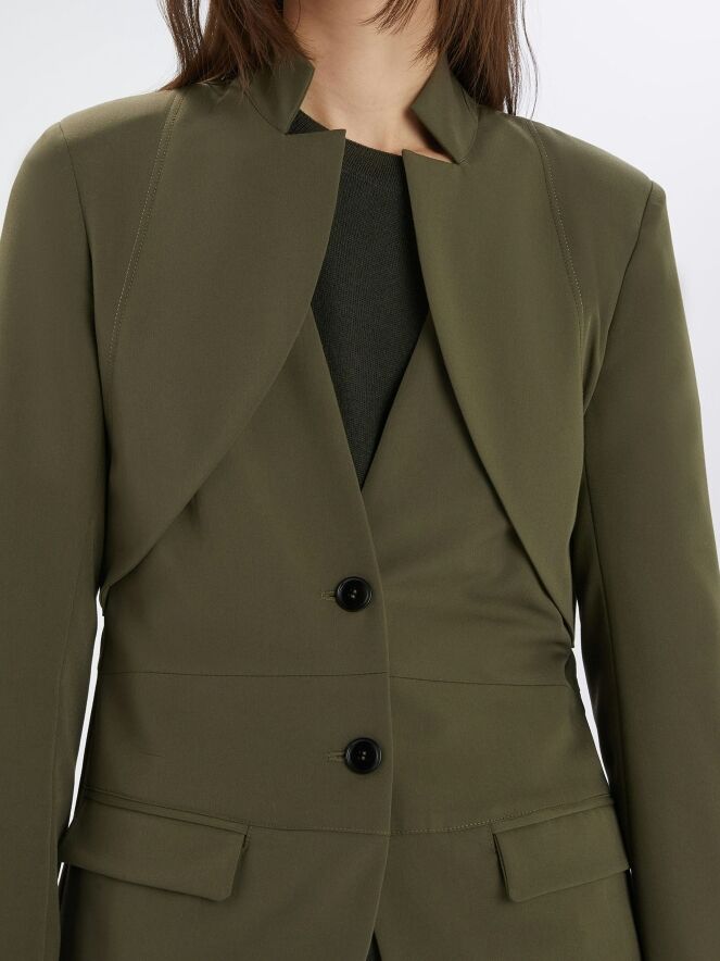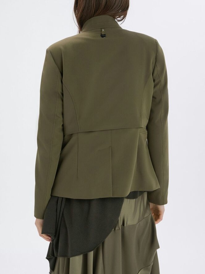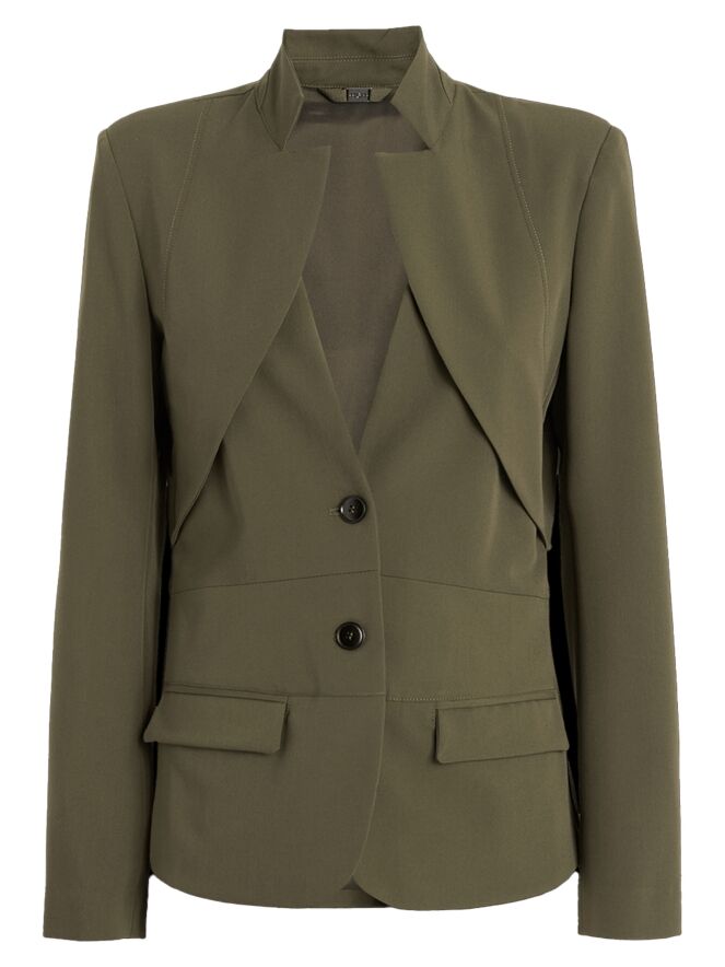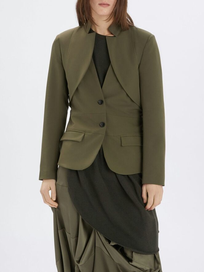 A blazer by High in olive green. From the sleeve insertion at the front, a second layer of fabric extends, partially functioning as a lapel. The blazer features a two-button closure and is fully lined. This blazer must not be washed.