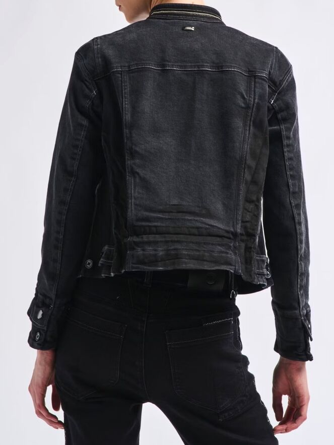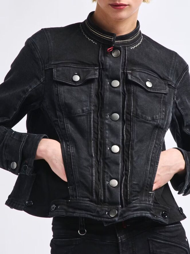 A denim blazer by High in a dark denim color. The neckline has a rhinestone thread and a seam as trim. On the front, there are multiple vertical seams. Buttons at the bottom of the sides allow the blazer to be adjusted for a more or less tailored fit. This denim blazer can be washed at 30 degrees.