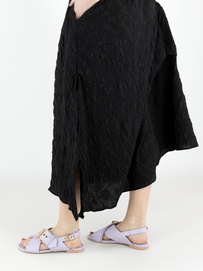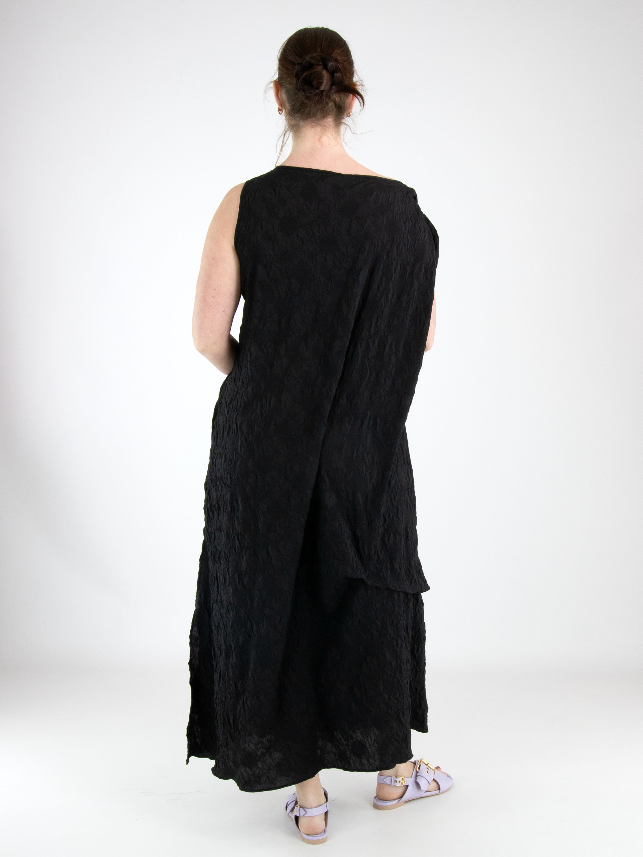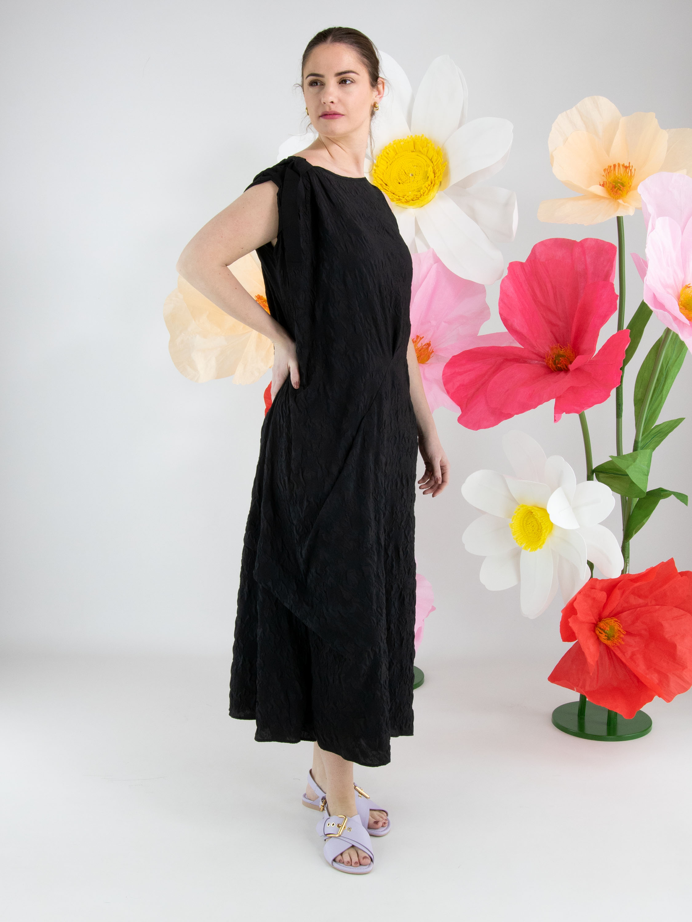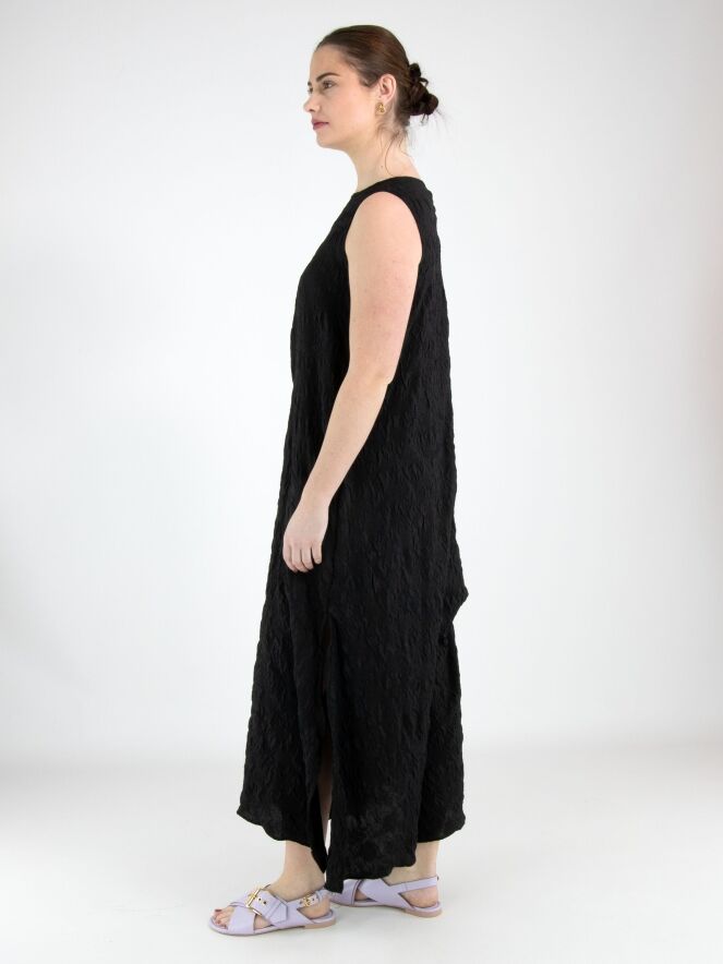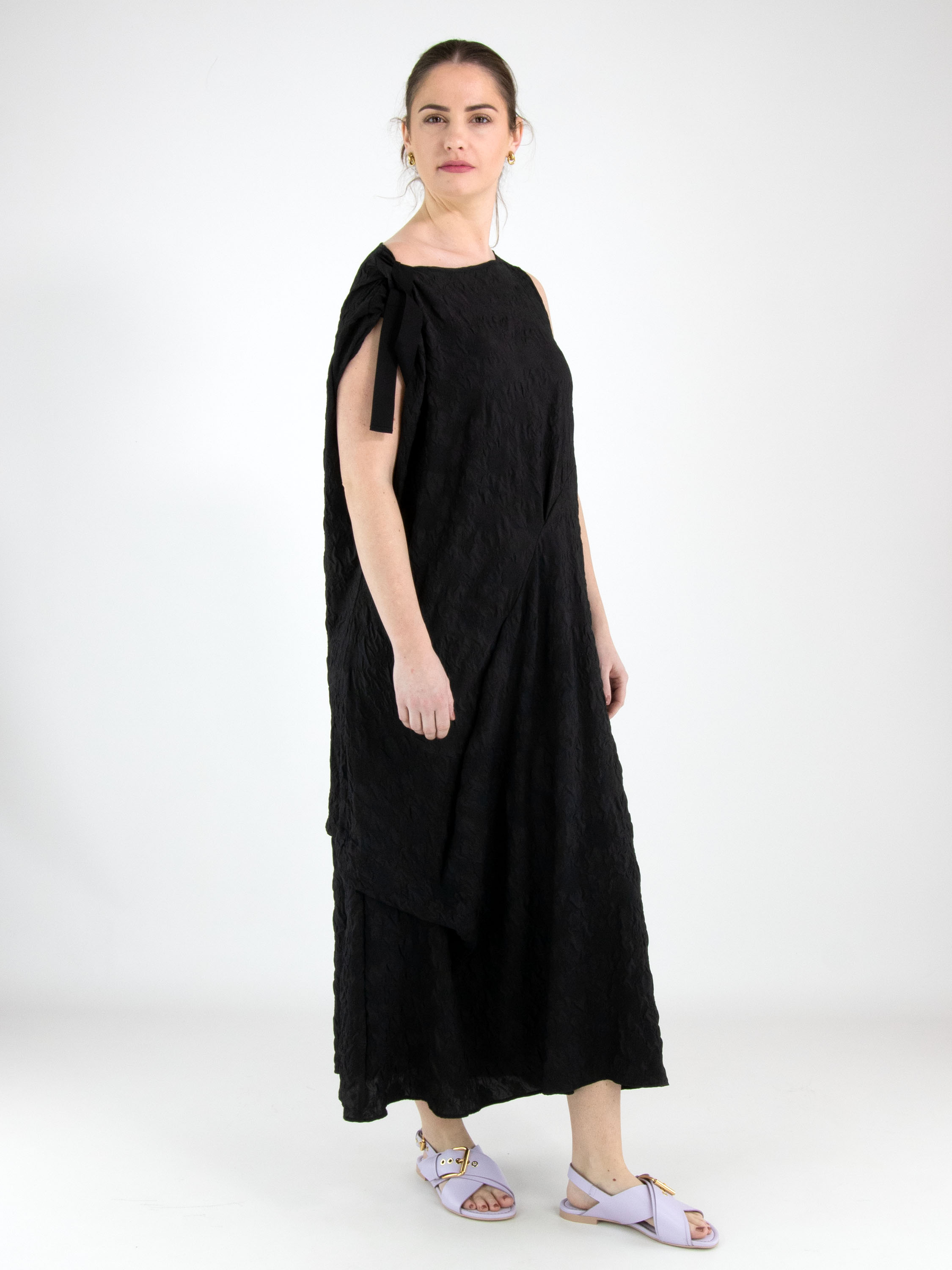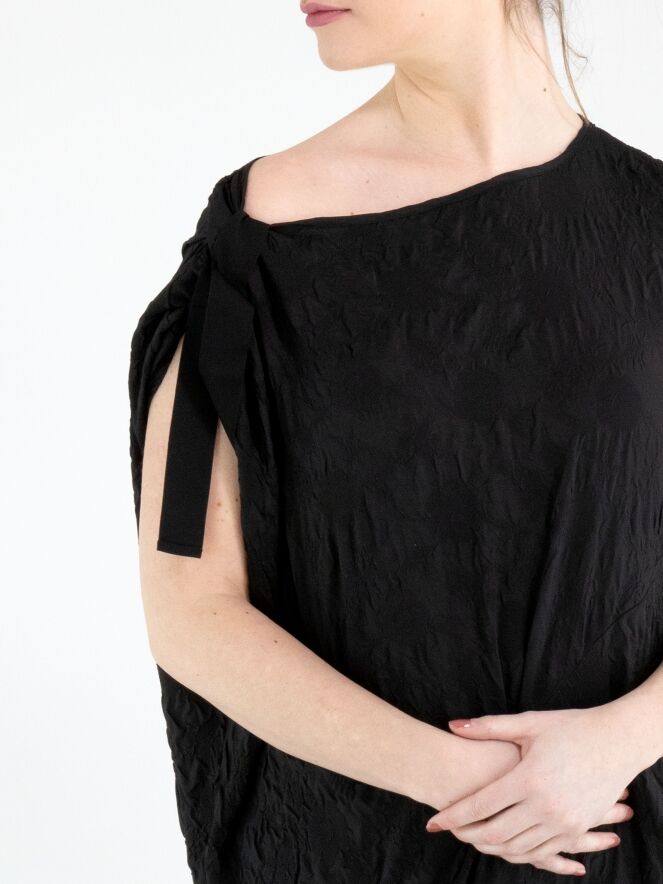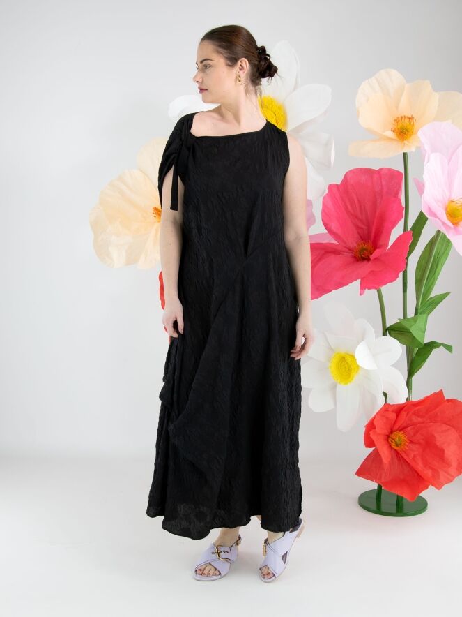 A dress from High Lab in a smocked fabric in black. On the right shoulder, a ribbon runs from the neckline to the sleeve insertion, creating a pleated effect. The dress features several decorative seams, pleats and draw-up details. At the hem, there is a deep slit on the left side. This dress can be hand-washed.