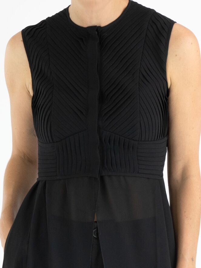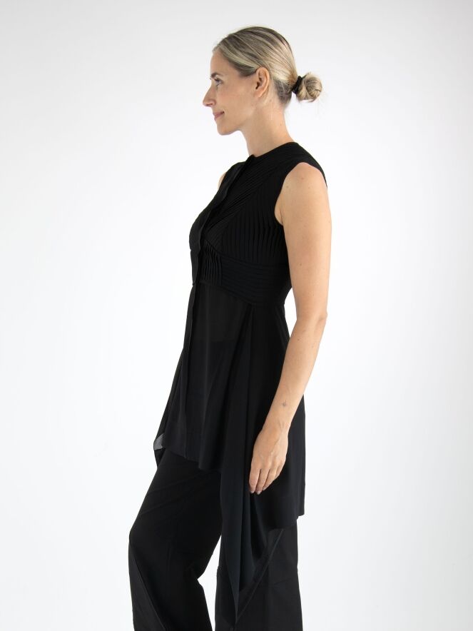 A luxurious top or tunic in black. Up to the waist, the fabric has multiple pleated lines. From the waist down, the fabric is transparent with points on the sides. The top features a concealed button closure and a high round neckline. This top should be hand washed.