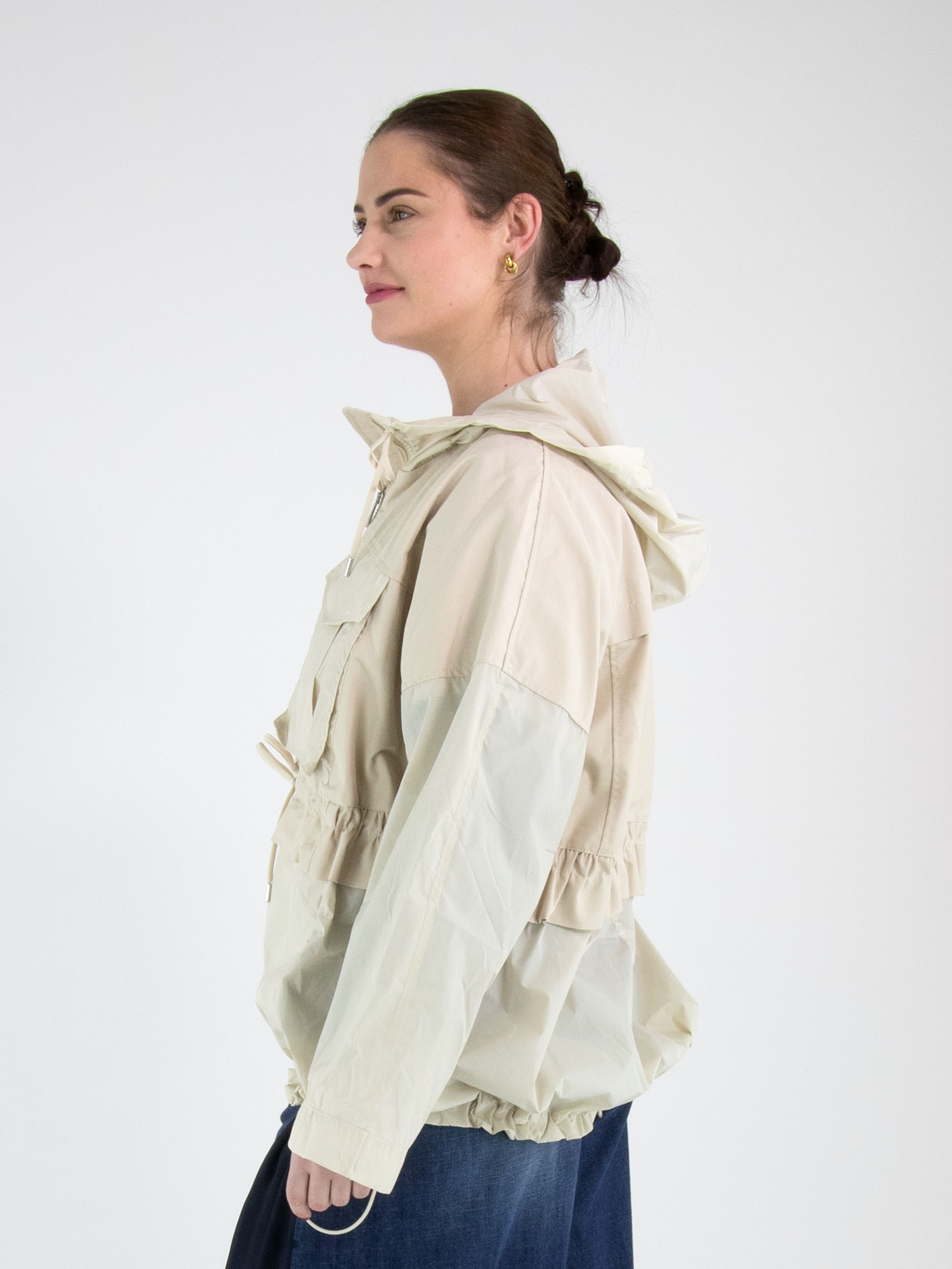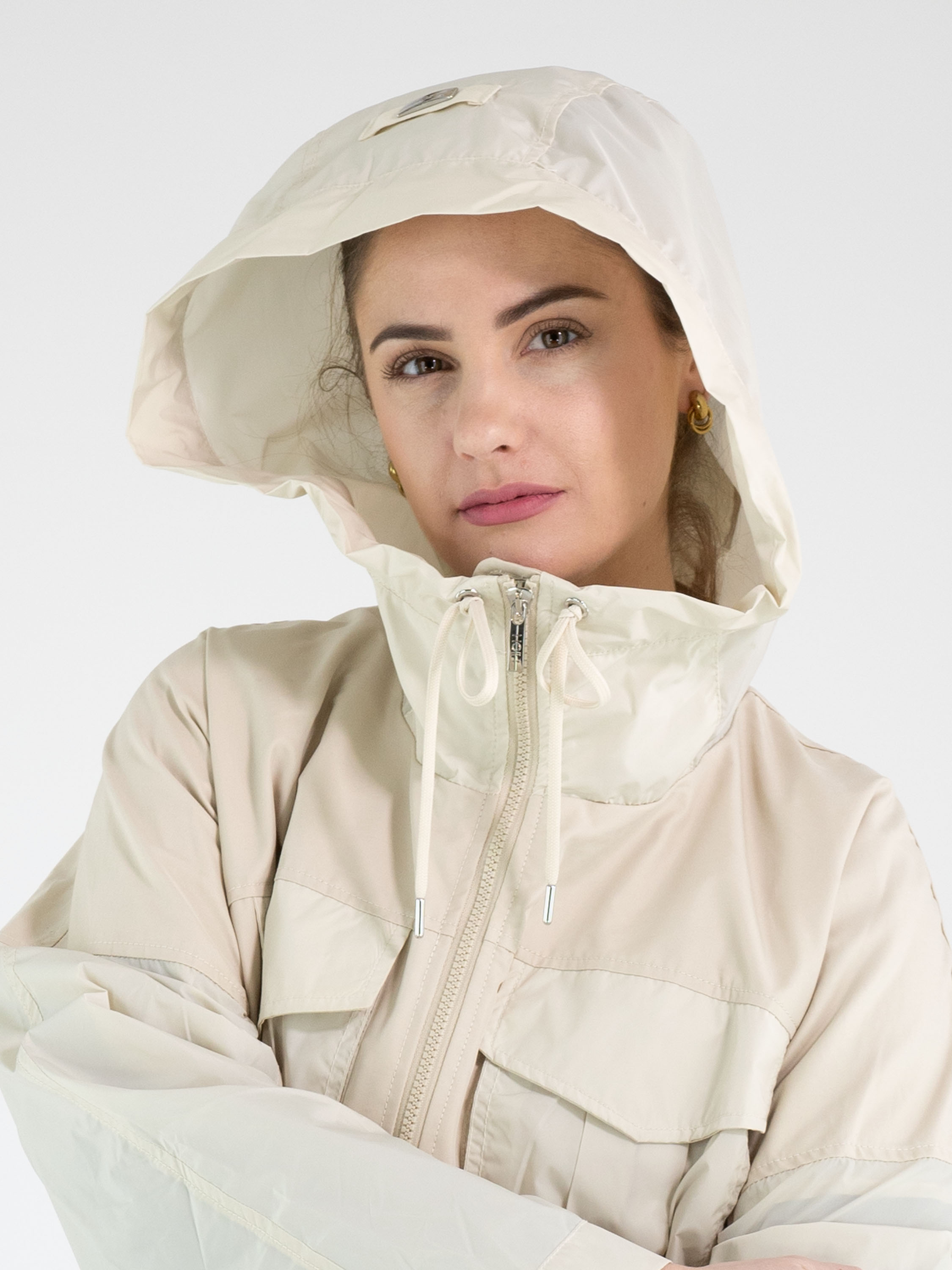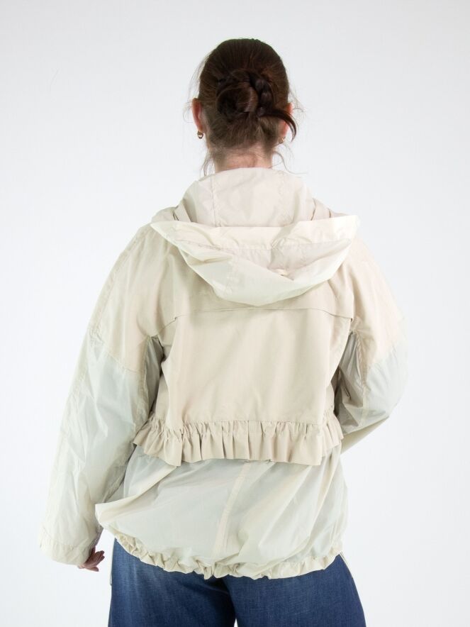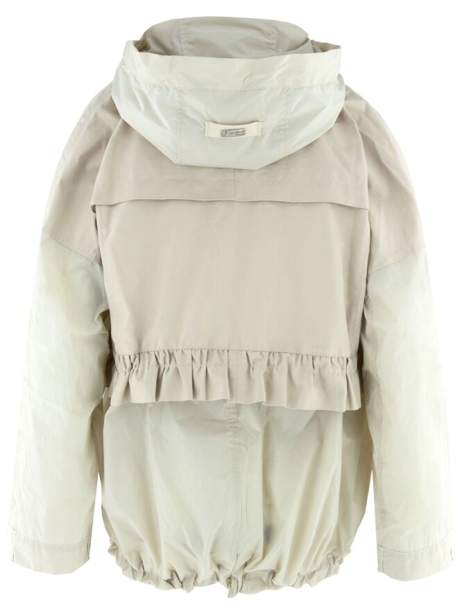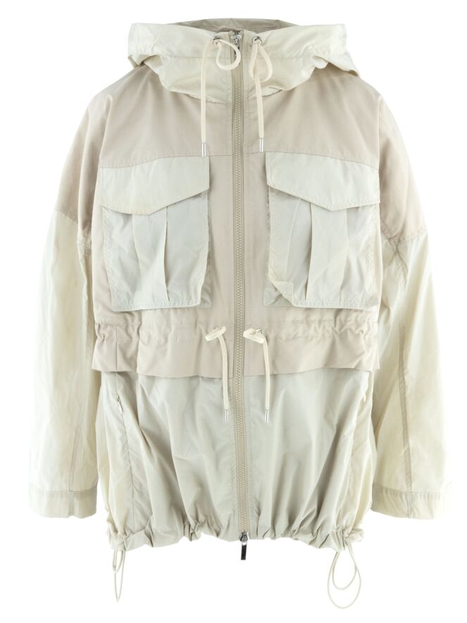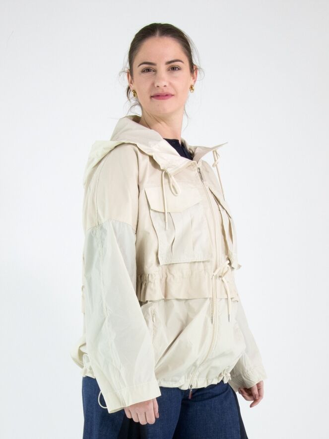 A coat by High in beige. The edge of the hood features a drawstring in a tunnel design, allowing it to be adjusted. The coat has a zip fastening, and the side pockets are also fitted with zip closures. At waist level and along the hem, a stitched tunnel with a drawstring creates a pleated effect when tightened. The coat features chest pockets and must not be washed.