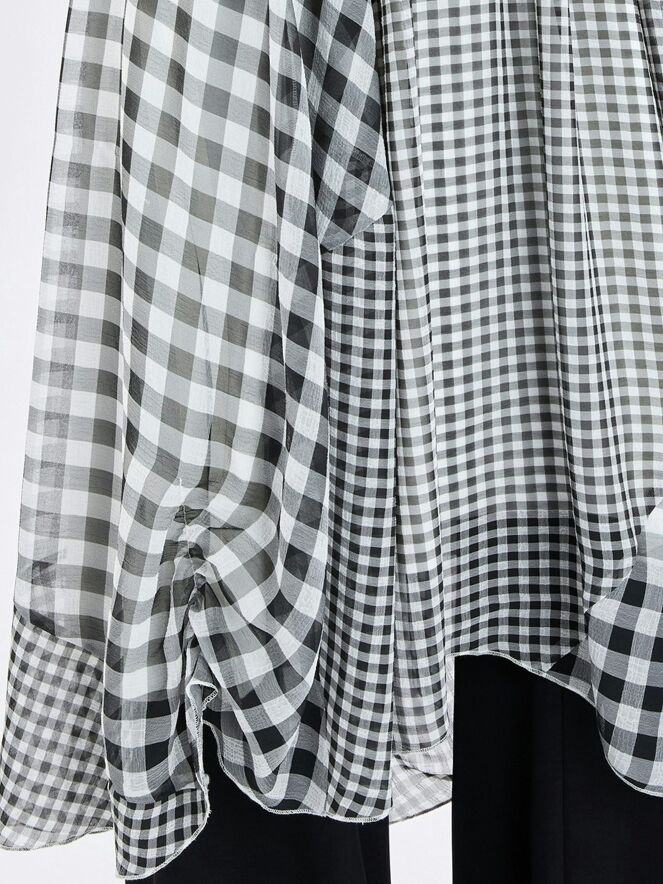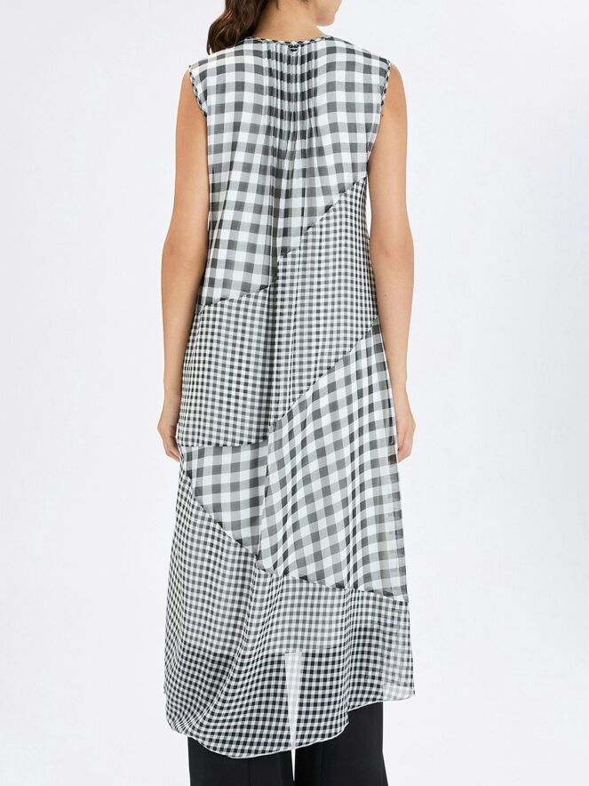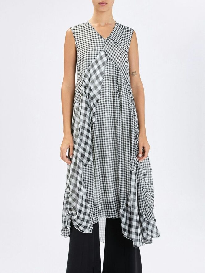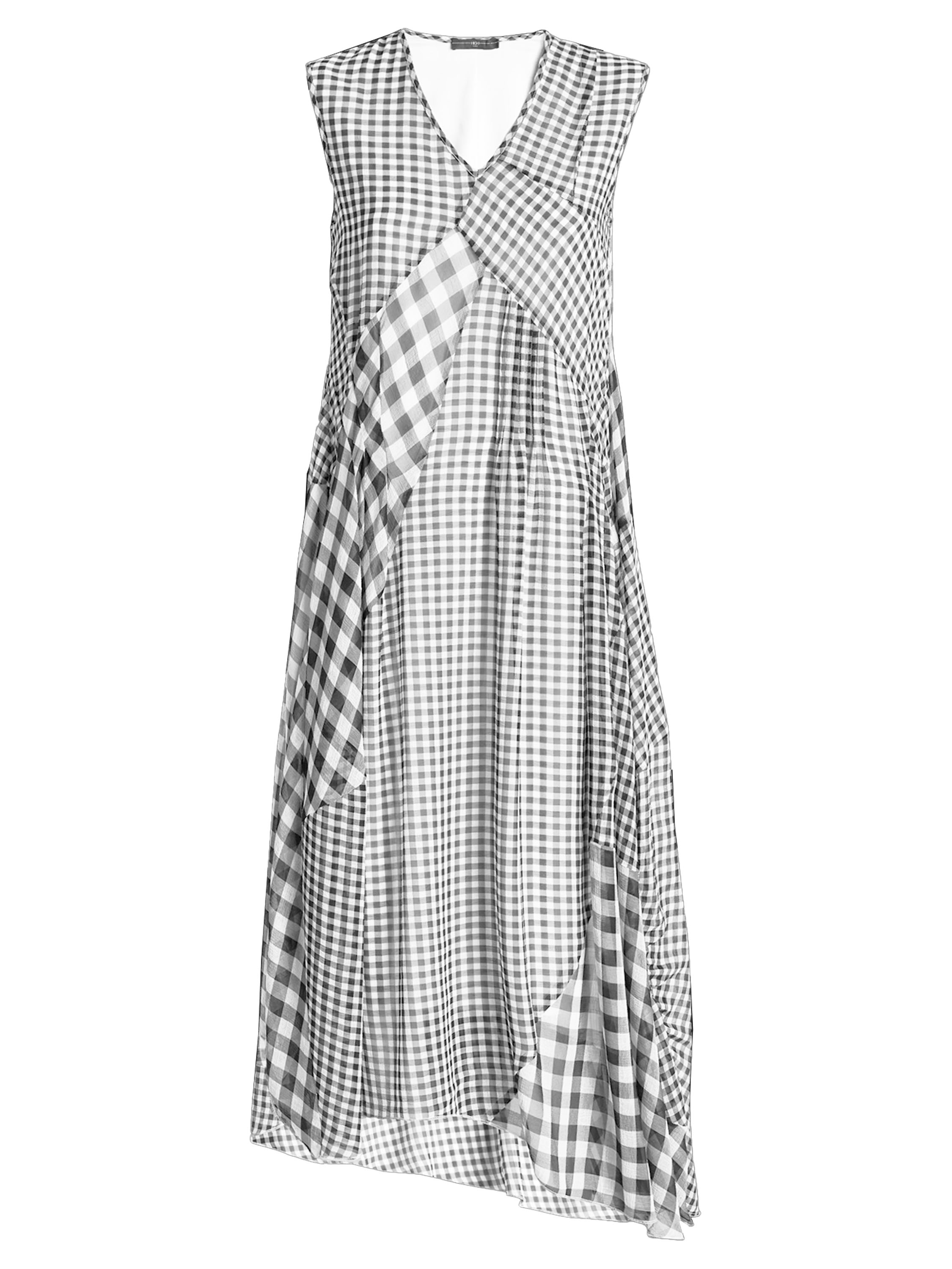 A High dress crafted from matte satin, layered with a transparent check fabric in multiple shades of grey and black on a white background. The checked overlay features pleated and gathered sections, structured by several diagonal seams for a contemporary, architectural effect. From the waist, the dress flares into an A-line silhouette. This piece should be hand washed.
